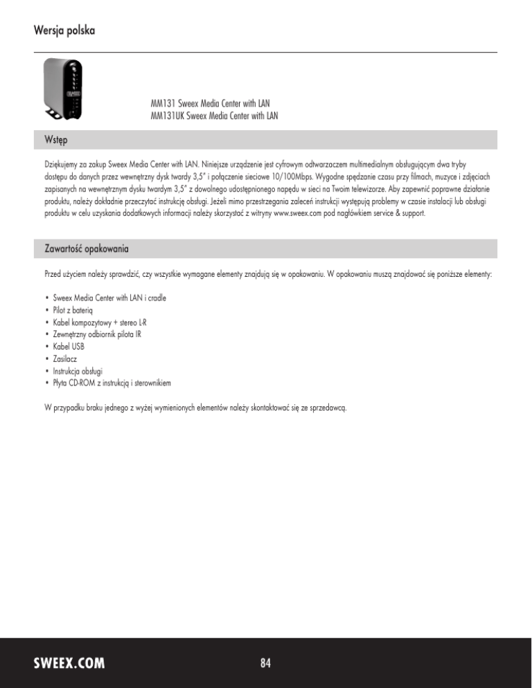 Wersja polska MM131 Sweex Media Center with LAN MM131UK Sweex Media Center with LAN Wstęp Dziękujemy za zakup Sweex Media Center with LAN. Niniejsze urządzenie jest cyfrowym odtwarzaczem multimedialnym obsługującym dwa tryby dostępu do danych przez wewnętrzny dysk twardy 3,5” i połączenie sieciowe 10/100Mbps. Wygodne spędzanie czasu przy filmach, muzyce i zdjęciach zapisanych na wewnętrznym dysku twardym 3,5” z dowolnego udostępnionego napędu w sieci na Twoim telewizorze. Aby zapewnić poprawne działanie produktu, należy dokładnie przeczytać instrukcję obsługi. Jeżeli mimo przestrzegania zaleceń instrukcji występują problemy w czasie instalacji lub obsługi produktu w celu uzyskania dodatkowych informacji należy skorzystać z witryny www.sweex.com pod nagłówkiem service & support. Zawartość opakowania Przed użyciem należy sprawdzić, czy wszystkie wymagane elementy znajdują się w opakowaniu. W opakowaniu muszą znajdować się poniższe elementy: •Sweex Media Center with LAN i cradle •Pilot z baterią •Kabel kompozytowy + stereo L-R •Zewnętrzny odbiornik pilota IR •Kabel USB •Zasilacz •Instrukcja obsługi •Płyta CD-ROM z instrukcją i sterownikiem W przypadku braku jednego z wyżej wymienionych elementów należy skontaktować się ze sprzedawcą. 84 Wersja polska Dane techniczne Zasilanie: Interfejs: Interfejs sieciowy: Połączenie sieciowe: Typ dysku twardego: System plików HDD: Rodzaj TV: Obsługiwane formaty: 5V 1,5A /12V 1,5A USB 2.0 10/100 Mbps LAN UTP RJ-45 Dysk twardy 3,5 cala IDE NTFS / FAT32 NTSC / PAL - Film: MPEG 1, 2, 4 (MPG, MPEG, AVI, M2V, DAT, VOB, IFO, itd.) DivX, XviD (z wyjątkiem stosowanych opcji GMC, Qpel) - Muzyka: MP3, OGG Vorbis, WAV, WMA (z wyjątkiem WMA9 pro.) - Zdjęcia: JPG(JPEG) Wyjście video: COMPOSITE S-VIDEO COMPONENT Y, Pb, Pr (skanowanie progresywne 480p, 720p, 1080i) Wyjście audio: STEREO L-R DIGITAL COAXIAL, OPTICAL (tylko DTS pass-through) Temperatura robocza: 0°C ~ 60°C Wilgotność robocza: 10% ~ 50% Waga: 450 gramów (bez dysku twardego) Wymiary: 57 x 150 x 185 mm (w x sz x g) Obsługuje: Windows 98SE, 2000 i XP Wymagania systemowe Wymagania USB Windows 98SE, 2000 lub XP Dostępny port USB 2.0, 1.1 (zalecany USB 2.0) Wymagania sieciowe Windows 98SE, 2000 lub XP Dostępny port LAN Ethernet 10/100, RJ-45 (zalecane 100Mbps) 85 Wersja polska Środki ostrożności Zalecamy skopiowanie danych na inny bezpieczny nośnik. Nie ponosimy odpowiedzialności za uszkodzenia danych lub stratę wbudowanego dysku twardego. Jeżeli urządzenie nie będzie używane przez dłuższy okres czasu, zalecamy odłączenie zasilania. Centrum multimedialne nie obsługuje kodeków DivX, XviD filmów wideo, które posiadają opcję GMC, Qpel. Centrum multimedialne obsługuje tylko “Pass-Through” dla kodeku DTS Audio. Nie należy odłączać zasilania w czasie odtwarzania pliku. Jeżeli kabel USB jest zbyt długi, może wystąpić problem z jego równym podłączeniem (Zalecenie: do 3 metrów). Jeżeli użytkownik posiada kartę główną USB 1.1, centrum multimedialne pracuje z prędkością USB 1.1. Nie należy wystawiać urządzenia na wstrząsy lub uderzenia. Zalecamy wykorzystanie wszystkich dostarczonych kabli i akcesoriów w celu zapewnienia lepszej wydajności Sweex Media Center. Używanie innych kabli i akcesoriów może doprowadzić do zmniejszenia wydajności urządzenia. Przegląd przycisk zasilania moc wejściowa odtwarzanie/pauza zewnętrzny ir przewijanie do tyłu s-video wyjście wideo cvbs szybkie przewijanie do przodu prawe audio stop czerw. lewe audio nieb. przycisk zasilania ziel. dioda led zasilania działanie sieci wyjście optyczne (SPDIF) działanie twardego dysku Port USB Port LAN 86 Wersja polska Instalacja w Windows 98SE Przed podłączeniem Sweex Media Center do komputera należy zainstalować sterownik Windows 98SE. Sterownik znajduje się na płycie CD-ROM i można go zainstalować wybierając prawidłowe opcje w menu. Po zainstalowaniu sterownika należy podłączyć Sweex Media Center za pomocą kabla USB do komputera i podłączyć kabel zasilania do stacji multimedialnej. Instalacja w Windows 2000/XP Nie jest konieczne instalowanie specjalnego sterownika dla Sweex Media Center, jeżeli użytkownik używa centrum multimedialnego z komputerem w Windows 2000 lub Windows XP. Podłączyć centrum multimedialne za pomocą dostarczonego kabla USB do komputera i podłączyć kabel zasilania do stacji multimedialnej. W “Mój komputer” lub “Explorer” powinien znajdować się nowy dysk. Można używać tego dysku jak normalnego dysku twardego i kopiować na niego dane. Po skopiowaniu danych, usunąć stację multimedialną za pomocą ikony usuwania położonej w dolnej części po prawej stronie ekranu. Konfiguracje sieciowe W przypadku podłączania centrum multimedialnego bezpośrednio do komputera, niezbędny jest kabel skrosowany (UTP). W przypadku podłączania centrum multimedialnego do HUB, rutera lub urządzenia sieciowego, niezbędny jest normalny kabel LAN (UTP). Po podłączeniu kabla LAN, należy ustawić konfiguracje sieciowe komputera i centrum multimedialnego. Należy również udostępnić folder w komputerze Windows i użyć tego samego ‘IP Address range’ i ‘Subnet Mask’ dla komputera i Sweex Media Station, na przykład: Adres IP Maska podsieci Komputer 192.168.1.2 255.255.255.0 Stacja multimedialna Sweex 192.168.1.3 255.255.255.0 Można przypisać adres IP i maskę podsieci Sweex Media Station jako dynamiczną lub statyczną. 87 Wersja polska Udostępnianie folderów Wybrać folder przeznaczony do udostępnienia, prawym przyciskiem myszy kliknąć folder i kliknąć “udostępnienie” w menu podręcznym. Zaznaczyć ‘Udostępnij jako’ i zapisać ‘Nazwa udziału’. Na przykład, “Moje filmy”. Podłączanie centrum multimedialnego Sweex Podłączyć zewnętrzne urządzenie AV Sweex Media Center obsługuje 3 rodzaje wyjścia wideo: composite, S-Vid
