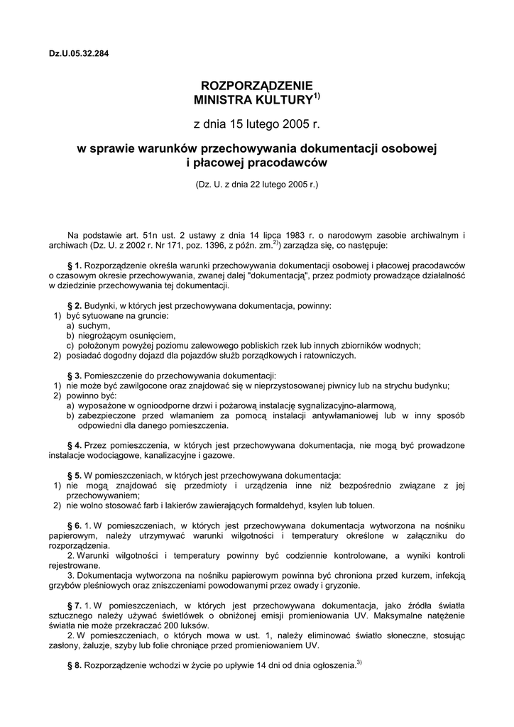 Dz.U.05.32.284 ROZPORZĄDZENIE MINISTRA KULTURY1) z dnia 15 lutego 2005 r. w sprawie warunków przechowywania dokumentacji osobowej i płacowej pracodawców (Dz. U. z dnia 22 lutego 2005 r.) Na podstawie art. 51n ust. 2 ustawy z dnia 14 lipca 1983 r. o narodowym zasobie archiwalnym i 2) archiwach (Dz. U. z 2002 r. Nr 171, poz. 1396, z późn. zm. ) zarządza się, co następuje: § 1. Rozporządzenie określa warunki przechowywania dokumentacji osobowej i płacowej pracodawców o czasowym okresie przechowywania, zwanej dalej "dokumentacją", przez podmioty prowadzące działalność w dziedzinie przechowywania tej dokumentacji. § 2. Budynki, w których jest przechowywana dokumentacja, powinny: 1) być sytuowane na gruncie: a) suchym, b) niegroŜącym osunięciem, c) połoŜonym powyŜej poziomu zalewowego pobliskich rzek lub innych zbiorników wodnych; 2) posiadać dogodny dojazd dla pojazdów słuŜb porządkowych i ratowniczych. § 3. Pomieszczenie do przechowywania dokumentacji: 1) nie moŜe być zawilgocone oraz znajdować się w nieprzystosowanej piwnicy lub na strychu budynku; 2) powinno być: a) wyposaŜone w ognioodporne drzwi i poŜarową instalację sygnalizacyjno-alarmową, b) zabezpieczone przed włamaniem za pomocą instalacji antywłamaniowej lub w inny sposób odpowiedni dla danego pomieszczenia. § 4. Przez pomieszczenia, w których jest przechowywana dokumentacja, nie mogą być prowadzone instalacje wodociągowe, kanalizacyjne i gazowe. § 5. W pomieszczeniach, w których jest przechowywana dokumentacja: 1) nie mogą znajdować się przedmioty i urządzenia inne niŜ bezpośrednio związane z jej przechowywaniem; 2) nie wolno stosować farb i lakierów zawierających formaldehyd, ksylen lub toluen. § 6. 1. W pomieszczeniach, w których jest przechowywana dokumentacja wytworzona na nośniku papierowym, naleŜy utrzymywać warunki wilgotności i temperatury określone w załączniku do rozporządzenia. 2. Warunki wilgotności i temperatury powinny być codziennie kontrolowane, a wyniki kontroli rejestrowane. 3. Dokumentacja wytworzona na nośniku papierowym powinna być chroniona przed kurzem, infekcją grzybów pleśniowych oraz zniszczeniami powodowanymi przez owady i gryzonie. § 7. 1. W pomieszczeniach, w których jest przechowywana dokumentacja, jako źródła światła sztucznego naleŜy uŜywać świetlówek o obniŜonej emisji promieniowania UV. Maksymalne natęŜenie światła nie moŜe przekraczać 200 luksów. 2. W pomieszczeniach, o których mowa w ust. 1, naleŜy eliminować światło słoneczne, stosując zasłony, Ŝaluzje, szyby lub folie chroniące przed promieniowaniem UV. 3) § 8. Rozporządzenie wchodzi w Ŝycie po upływie 14 dni od dnia ogłoszenia. ________ 1) Minister Kultury kieruje działem administracji rządowej - kultura i ochrona dziedzictwa narodowego, na podstawie § 1 ust. 2 rozporządzenia Prezesa Rady Ministrów z dnia 11 czerwca 2004 r. w sprawie szczegółowego zakresu działania Ministra Kultury (Dz. U. Nr 134, poz. 1430). 2) Zmiany tekstu jednolitego wymienionej ustawy zostały ogłoszone w Dz. U. z 2002 r. Nr 241, poz. 2074, z 2003 r. Nr 137, poz. 1302, z 2004 r. Nr 173, poz. 1808, Nr 202, poz. 2065 i Nr 273, poz. 2703 oraz z 2005 r. Nr 10, poz. 69. 3) Niniejsze rozporządzenie było poprzedzone rozporządzeniem Ministra Kultury z dnia 12 maja 2003 r. w sprawie warunków przechowywania dokumentacji osobowej i płacowej pracodawców (Dz. U. Nr 98, poz. 901), które traci moc z dniem 22 lutego 2005 r. na podstawie art. 85 ustawy z dnia 2 lipca 2004 r. Przepisy wprowadzające ustawę o swobodzie działalności gospodarczej (Dz. U. Nr 173, poz. 1808). ZAŁĄCZNIK WARUNKI WILGOTNOŚCI I TEMPERATURY, JAKIE NALEśY UTRZYMYWAĆ W POMIESZCZENIACH, W KTÓRYCH JEST PRZECHOWYWANA DOKUMENTACJA WYTWORZONA NA NOŚNIKU PAPIEROWYM Temperatura (°C) poziom (°C) 14-20 °C wahania w ciągu 24 godz. (°C) ±2 °C Wilgotno ść względna poziom (%) 45-60 % wahania w ciągu 24 godz. (%) ±5 %
