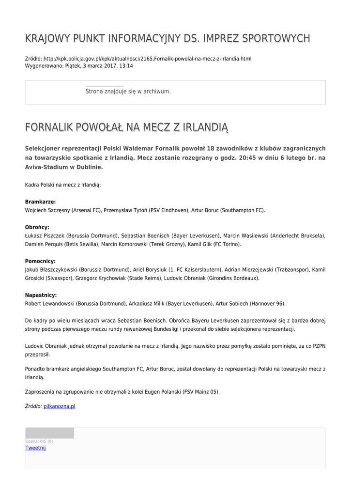 KRAJOWY PUNKT INFORMACYJNY DS. IMPREZ SPORTOWYCH Źródło: http://kpk.policja.gov.pl/kpk/aktualnosci/2165,Fornalik-powolal-na-mecz-z-Irlandia.html Wygenerowano: Piątek, 3 marca 2017, 13:14 Strona znajduje się w archiwum. FORNALIK POWOŁAŁ NA MECZ Z IRLANDIĄ Selekcjoner reprezentacji Polski Waldemar Fornalik powołał 18 zawodników z klubów zagranicznych na towarzyskie spotkanie z Irlandią. Mecz zostanie rozegrany o godz. 20:45 w dniu 6 lutego br. na Aviva-Stadium w Dublinie. Kadra Polski na mecz z Irlandią: Bramkarze: Wojciech Szczęsny (Arsenal FC), Przemysław Tytoń (PSV Eindhoven), Artur Boruc (Southampton FC). Obrońcy: Łukasz Piszczek (Borussia Dortmund), Sebastian Boenisch (Bayer Leverkusen), Marcin Wasilewski (Anderlecht Bruksela), Damien Perquis (Betis Sewilla), Marcin Komorowski (Terek Grozny), Kamil Glik (FC Torino). Pomocnicy: Jakub Błaszczykowski (Borussia Dortmund), Ariel Borysiuk (1. FC Kaiserslautern), Adrian Mierzejewski (Trabzonspor), Kamil Grosicki (Sivasspor), Grzegorz Krychowiak (Stade Reims), Ludovic Obraniak (Girondins Bordeaux). Napastnicy: Robert Lewandowski (Borussia Dortmund), Arkadiusz Milik (Bayer Leverkusen), Artur Sobiech (Hannover 96). Do kadry po wielu miesiącach wraca Sebastian Boenisch. Obrońca Bayeru Leverkusen zaprezentował się z bardzo dobrej strony podczas pierwszego meczu rundy rewanżowej Bundesligi i przekonał do siebie selekcjonera reprezentacji. Ludovic Obraniak jednak otrzymał powołanie na mecz z Irlandią. Jego nazwisko przez pomyłkę zostało pominięte, za co PZPN przeprosił. Ponadto bramkarz angielskiego Southampton FC, Artur Boruc, został dowołany do reprezentacji Polski na towarzyski mecz z Irlandią. Zaproszenia na zgrupowanie nie otrzymali z kolei Eugen Polanski (FSV Mainz 05). Źródło: pilkanozna.pl Ocena: 0/5 (0) Tweetnij