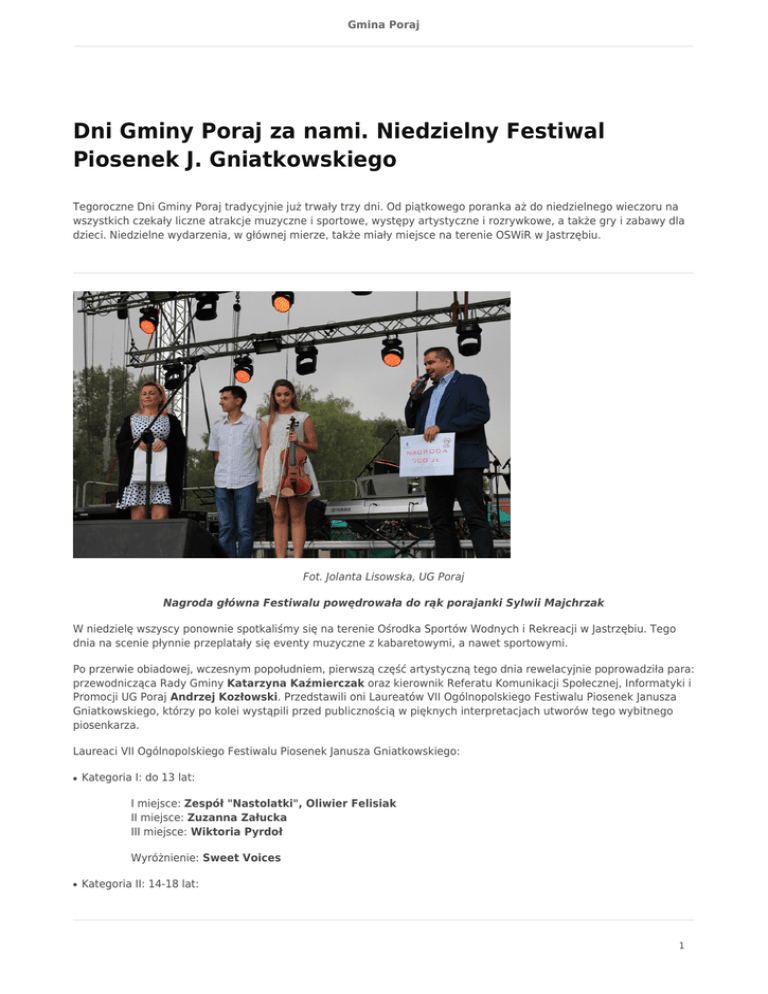 Gmina Poraj Dni Gminy Poraj za nami. Niedzielny Festiwal Piosenek J. Gniatkowskiego Tegoroczne Dni Gminy Poraj tradycyjnie już trwały trzy dni. Od piątkowego poranka aż do niedzielnego wieczoru na wszystkich czekały liczne atrakcje muzyczne i sportowe, występy artystyczne i rozrywkowe, a także gry i zabawy dla dzieci. Niedzielne wydarzenia, w głównej mierze, także miały miejsce na terenie OSWiR w Jastrzębiu. Fot. Jolanta Lisowska, UG Poraj Nagroda główna Festiwalu powędrowała do rąk porajanki Sylwii Majchrzak W niedzielę wszyscy ponownie spotkaliśmy się na terenie Ośrodka Sportów Wodnych i Rekreacji w Jastrzębiu. Tego dnia na scenie płynnie przeplatały się eventy muzyczne z kabaretowymi, a nawet sportowymi. Po przerwie obiadowej, wczesnym popołudniem, pierwszą część artystyczną tego dnia rewelacyjnie poprowadziła para: przewodnicząca Rady Gminy Katarzyna Kaźmierczak oraz kierownik Referatu Komunikacji Społecznej, Informatyki i Promocji UG Poraj Andrzej Kozłowski. Przedstawili oni Laureatów VII Ogólnopolskiego Festiwalu Piosenek Janusza Gniatkowskiego, którzy po kolei wystąpili przed publicznością w pięknych interpretacjach utworów tego wybitnego piosenkarza. Laureaci VII Ogólnopolskiego Festiwalu Piosenek Janusza Gniatkowskiego: ● Kategoria I: do 13 lat: I miejsce: Zespół "Nastolatki", Oliwier Felisiak II miejsce: Zuzanna Załucka III miejsce: Wiktoria Pyrdoł Wyróżnienie: Sweet Voices ● Kategoria II: 14-18 lat: 1 Gmina Poraj II miejsce: Karolina Szmuc, Patrycja Gotfryd III miejsce: Zespół "Plus Minus" Wyróżnienie: Marcelina Kocjan ● Kategoria III: 19-35 lat: I miejsce: Sylwia Majchrzak Wyróżnienie: Karolina Gurbała ● Kategoria IV: powyżej 35 lat: I miejsce: Zespół "Szalona Piątka Plus" II miejsce: Elżbieta Jatulewicz III miejsce: Edmund Otręba ● NAGRODA GRAND PRIX FESTIWALU – Sylwia Majchrzak Wszyscy Laureaci otrzymali po występach nagrody oraz pamiątkowe dyplomy, wręczane przez wójta Łukasza Stacherę, wicestarostę myszkowską Annę Sochę-Korendo, wiceprzewodniczącego Rady Gminy Poraj Andrzeja Pawłowskiego, dyrektora GOK w Poraju Magdalenę Ryziuk-Wilk, posła na Sejm RP Szymona Giżyńskiego, a także przedstawiciela Związku Artystów Scen Polskich Ryszarda Rembiszewskiego. Zwyciężczyni tegorocznej nagrody Grand Prix Festiwalu, Sylwia Majchrzak, otrzymała ponadto bilet do Strasburga, ufundowany przez posłankę do Parlamentu Europejskiego Jadwigę Wiśniewską, a także Nagrodę Specjalną Związku Artystów Scen Polskich. Specjalne podziękowania od Gminy Poraj otrzymał Dominik Piworowicz za zaangażowanie i pomoc w organizacji Festiwalu Piosenek Janusza Gniatkowskiego oraz za gromadzenie i archiwizowanie materiałów oraz prowadzenie strony internetowej poświęconej artyście. Drugą część artystyczną niedzielnego popołudnia – Koncert Gwiazd VII Ogólnopolskiego Festiwalu Piosenek Janusza Gniatkowskiego, poprowadził znany wszystkim konferansjer Ryszard Rembiszewski. Na samym początku powitał i zaprosił na scenę Krystynę Maciejewską, znaną piosenkarkę i wdowę po Januszu Gniatkowskim. We wspaniałych, muzycznych wspominkach, opowiedziała widzom historię swojego małżeństwa. Po rewelacyjnym występie Krystyna Maciejewska otrzymała z rąk prezesa Stowarzyszenia Przyjaciół Gaude Mater Jana Szymy pamiątkowy medal z okazji 50-lecia pracy artystycznej. Z kolei wręczający nagrodę, Jan Szyma, z rąk wójta Łukasza Stachery otrzymał w zamian podziękowania i statuetkę za zaangażowanie i pomoc w organizacji Festiwalu Piosenek Janusza Gniatkowskiego w Poraju. Nagrodzeni przyjaciele nie mogli ukryć ani wzruszenia, ani wielkiej radości z okazji otrzymania tak wspaniałych i niespodziewanych prezentów. Po uroczystej wymianie odznaczeń, sceną zawładnął Edward Hulewicz, który z werwą i pełen energii wystąpił w estradowym koncercie swych największych przebojów. Po nim zaś zaprezentowała się Laureatka Grand Prix VI Ogólnopolskiego Festiwalu Piosenek Janusza Gniatkowskiego, Magdalena Muchla. Piękne interpretacje utworów porajskiego artysty szybko podbiły serca publiczności. W następnej kolejności na scenie pojawili się Krzysztof Cwynar oraz Danuta Błażejczyk. Jako ostatni, prawie jak wisienka na torcie, na scenie zagościł Babski Kabaret „Old Spice Girls”. Emilia Krakowska, Lidia Stanisławska oraz Barbara Wrzesińska urzekły wszystkich zgromadzonych licznymi skeczami, zabawnymi opowiastkami oraz piosenkami kabaretowymi. Pod hasłem „śmiech przedłuża życie, zapewnia zdrowie i poprawia samopoczucie” artystki zapewniły nam porcję szczerego, a przy tym zdrowego śmiechu. Na zakończenie niedzielnych koncertów wszystkie występujące gwiazdy wyszły jeszcze raz na scenę i wspólnie zaśpiewały „Bella, Bella Donna” – jeden z najbardziej znanych utworów Janusza Gniatkowskiego, tym samym żegnając 2 Gmina Poraj się ze wspaniałą publicznością. Podobnie jak w dniach poprzednich wszyscy występujący artyści otrzymywali statuetkę Przyjaciela Gminy Poraj jednocześnie gorąco zapewniając, że otrzymane trofeum zobowiązuje do dalszych przyjacielskich relacji. Organizatorami niedzielnego, finałowego koncertu VII Ogólnopolskiego Festiwalu Piosenek Janusza Gniatkowskiego byli: Stowarzyszenie „Apasjonata”, Urząd Gminy Poraj oraz Gminny Ośrodek Kultury im. Janusza Gniatkowskiego w Poraju. Honorowy patronat nad tym wydarzeniem objął wójt Gminy Poraj Łukasz Stachera. Dyrektorem artystycznym Festiwalu była Krystyna Maciejewska, a na scenie – w niedzielnym koncercie finałowym towarzyszył jej zespół muzyczny pod kierownictwem Pawła Mastalerza. Nagrody dla laureatów Festiwalu zapewnili: Urząd Gminy Poraj, Stowarzyszenie „Apasjonata”, Rada Sołecka z Poraja, Starostwo Powiatowe w Myszkowie oraz Poseł do Parlamentu Europejskiego Jadwiga Wiśniewska (nagroda GRAND PRIX). 3