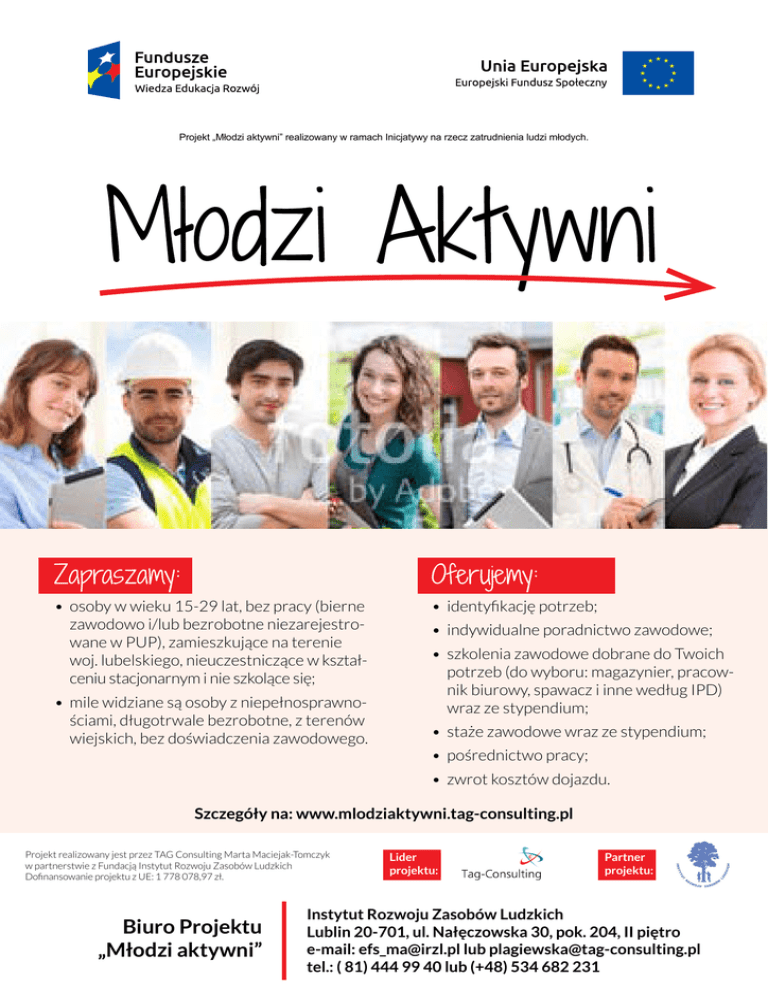 Projekt „Młodzi aktywni” realizowany w ramach Inicjatywy na rzecz zatrudnienia ludzi młodych. Zapraszamy: Oferujemy: • osoby w wieku 15-29 lat, bez pracy (bierne zawodowo i/lub bezrobotne niezarejestrowane w PUP), zamieszkujące na terenie woj. lubelskiego, nieuczestniczące w kształceniu stacjonarnym i nie szkolące się; • identyfikację potrzeb; • mile widziane są osoby z niepełnosprawnościami, długotrwale bezrobotne, z terenów wiejskich, bez doświadczenia zawodowego. • indywidualne poradnictwo zawodowe; • szkolenia zawodowe dobrane do Twoich potrzeb (do wyboru: magazynier, pracownik biurowy, spawacz i inne według IPD) wraz ze stypendium; • staże zawodowe wraz ze stypendium; • pośrednictwo pracy; • zwrot kosztów dojazdu. Szczegóły na: www.mlodziaktywni.tag-consulting.pl Projekt realizowany jest przez TAG Consulting Marta Maciejak-Tomczyk w partnerstwie z Fundacją Instytut Rozwoju Zasobów Ludzkich Dofinansowanie projektu z UE: 1 778 078,97 zł. Biuro Projektu „Młodzi aktywni” Lider projektu: Partner projektu: Instytut Rozwoju Zasobów Ludzkich Lublin 20-701, ul. Nałęczowska 30, pok. 204, II piętro e-mail: [email protected] lub [email protected] tel.: ( 81) 444 99 40 lub (+48) 534 682 231