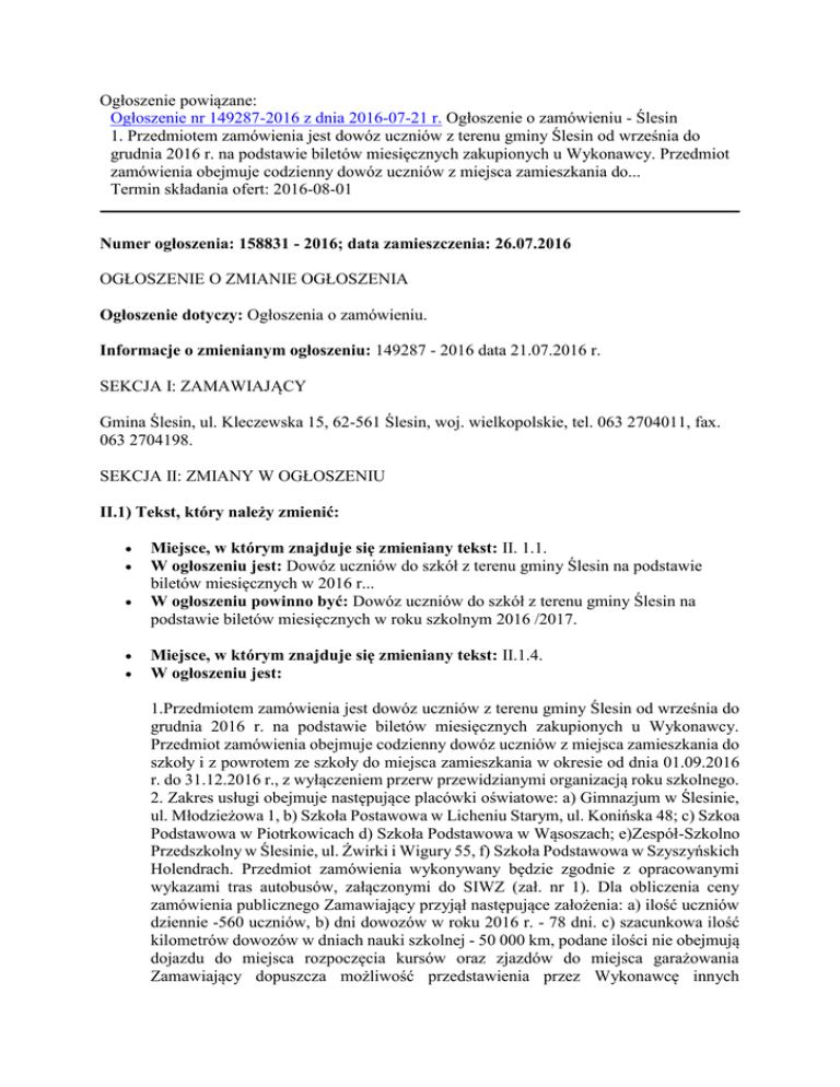 Ogłoszenie powiązane: Ogłoszenie nr 149287-2016 z dnia 2016-07-21 r. Ogłoszenie o zamówieniu - Ślesin 1. Przedmiotem zamówienia jest dowóz uczniów z terenu gminy Ślesin od września do grudnia 2016 r. na podstawie biletów miesięcznych zakupionych u Wykonawcy. Przedmiot zamówienia obejmuje codzienny dowóz uczniów z miejsca zamieszkania do... Termin składania ofert: 2016-08-01 Numer ogłoszenia: 158831 - 2016; data zamieszczenia: 26.07.2016 OGŁOSZENIE O ZMIANIE OGŁOSZENIA Ogłoszenie dotyczy: Ogłoszenia o zamówieniu. Informacje o zmienianym ogłoszeniu: 149287 - 2016 data 21.07.2016 r. SEKCJA I: ZAMAWIAJĄCY Gmina Ślesin, ul. Kleczewska 15, 62-561 Ślesin, woj. wielkopolskie, tel. 063 2704011, fax. 063 2704198. SEKCJA II: ZMIANY W OGŁOSZENIU II.1) Tekst, który należy zmienić: Miejsce, w którym znajduje się zmieniany tekst: II. 1.1. W ogłoszeniu jest: Dowóz uczniów do szkół z terenu gminy Ślesin na podstawie biletów miesięcznych w 2016 r... W ogłoszeniu powinno być: Dowóz uczniów do szkół z terenu gminy Ślesin na podstawie biletów miesięcznych w roku szkolnym 2016 /2017. Miejsce, w którym znajduje się zmieniany tekst: II.1.4. W ogłoszeniu jest: 1.Przedmiotem zamówienia jest dowóz uczniów z terenu gminy Ślesin od września do grudnia 2016 r. na podstawie biletów miesięcznych zakupionych u Wykonawcy. Przedmiot zamówienia obejmuje codzienny dowóz uczniów z miejsca zamieszkania do szkoły i z powrotem ze szkoły do miejsca zamieszkania w okresie od dnia 01.09.2016 r. do 31.12.2016 r., z wyłączeniem przerw przewidzianymi organizacją roku szkolnego. 2. Zakres usługi obejmuje następujące placówki oświatowe: a) Gimnazjum w Ślesinie, ul. Młodzieżowa 1, b) Szkoła Postawowa w Licheniu Starym, ul. Konińska 48; c) Szkoa Podstawowa w Piotrkowicach d) Szkoła Podstawowa w Wąsoszach; e)Zespół-Szkolno Przedszkolny w Ślesinie, ul. Żwirki i Wigury 55, f) Szkoła Podstawowa w Szyszyńskich Holendrach. Przedmiot zamówienia wykonywany będzie zgodnie z opracowanymi wykazami tras autobusów, załączonymi do SIWZ (zał. nr 1). Dla obliczenia ceny zamówienia publicznego Zamawiający przyjął następujące założenia: a) ilość uczniów dziennie -560 uczniów, b) dni dowozów w roku 2016 r. - 78 dni. c) szacunkowa ilość kilometrów dowozów w dniach nauki szkolnej - 50 000 km, podane ilości nie obejmują dojazdu do miejsca rozpoczęcia kursów oraz zjazdów do miejsca garażowania Zamawiający dopuszcza możliwość przedstawienia przez Wykonawcę innych rozwiązań przebiegu tras dowozu i odwozu uczniów niż zaproponowane przez Zamawiającego jedynie w przypadku rozwiązań bardziej praktycznych, efektywnych i korzystnych dla Zamawiającego. W takim przypadku Zamawiający musi wyrazić pisemną zgodę na dokonanie zmiany harmonogramu dowozu i odwozu uczniów. Usługa objęta przedmiotem zamówienia publicznego odbywać się będzie w ramach regularnych przewozów osób w krajowym transporcie drogowym, zgodnie z ustawą z dnia 6 września 2001 r o transporcie drogowym (Dz.U. z 2013 r., poz. 1414 ze zm.). Opis przedmiotu zamówienia pkt III SIWZ zawiera wymogi i warunki związane z wykonywaniem usług transportowych będących przedmiotem niniejszego zamówienia... W ogłoszeniu powinno być: 1. Przedmiotem zamówienia jest dowóz uczniów z terenu gminy Ślesin w roku szkolnym 2016/2017. na podstawie biletów miesięcznych zakupionych u Wykonawcy. Przedmiot zamówienia obejmuje codzienny dowóz uczniów z miejsca zamieszkania do szkoły i z powrotem ze szkoły do miejsca zamieszkania w okresie od dnia 01.09.2016 r. do 30.06.2017 r., z wyłączeniem przerw przewidzianymi organizacją roku szkolnego. 2. Zakres usługi obejmuje następujące placówki oświatowe: a) Gimnazjum w Ślesinie, ul. Młodzieżowa 1, b) Szkoła Postawowa w Licheniu Starym, ul. Konińska 48; c) Szkoa Podstawowa w Piotrkowicach d) Szkoła Podstawowa w Wąsoszach; e) Zespół-Szkolno Przedszkolny w Ślesinie, ul. Żwirki i Wigury 55, f) Szkoła Podstawowa w Szyszyńskich Holendrach. Przedmiot zamówienia wykonywany będzie zgodnie z opracowanymi wykazami tras autobusów, załączonymi do SIWZ (zał. nr 1). Dla obliczenia ceny zamówienia publicznego Zamawiający przyjął następujące założenia: a) ilość uczniów dziennie -560 uczniów, b) dni dowozów w roku szkolnym 2016/2017 - 188 dni. c) szacunkowa ilość kilometrów dowozów w dniach nauki szkolnej - 122 000 km, podane ilości nie obejmują dojazdu do miejsca rozpoczęcia kursów oraz zjazdów do miejsca garażowania Zamawiający dopuszcza możliwość przedstawienia przez Wykonawcę innych rozwiązań przebiegu tras dowozu i odwozu uczniów niż zaproponowane przez Zamawiającego jedynie w przypadku rozwiązań bardziej praktycznych, efektywnych i korzystnych dla Zamawiającego. W takim przypadku Zamawiający musi wyrazić pisemną zgodę na dokonanie zmiany harmonogramu dowozu i odwozu uczniów. Usługa objęta przedmiotem zamówienia publicznego odbywać się będzie w ramach regularnych przewozów osób w krajowym transporcie drogowym, zgodnie z ustawą z dnia 6 września 2001 r o transporcie drogowym (Dz.U. z 2013 r., poz. 1414 ze zm.). Opis przedmiotu zamówienia pkt III SIWZ zawiera wymogi i warunki związane z wykonywaniem usług transportowych będących przedmiotem niniejszego zamówienia... Miejsce, w którym znajduje się zmieniany tekst: II.2. W ogłoszeniu jest: Zakończenie: 31.12.2016.. W ogłoszeniu powinno być: Zakończenie: 30.06.2017 r.. Miejsce, w którym znajduje się zmieniany tekst: IV.4.4. W ogłoszeniu jest: Termin składania wniosków o dopuszczenie do udziału w postępowaniu lub ofert: 01.08.2016 godzina 10:00, miejsce: Urząd Miasta i Gminy w Ślesinie ul. Kleczewska 15, 62-561 Ślesin / sekretariat/.. W ogłoszeniu powinno być: Termin składania wniosków o dopuszczenie do udziału w postępowaniu lub ofert: 08.08.2016 godzina 10:00, miejsce: Urząd Miasta i Gminy w Śle