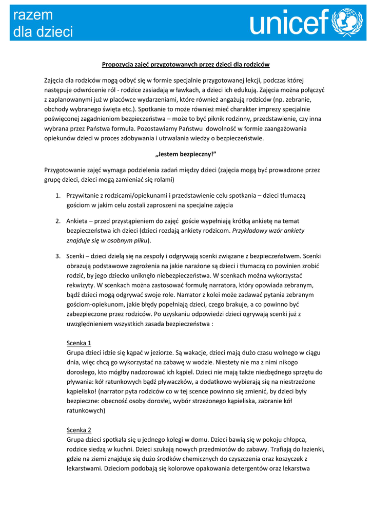 Propozycja zajęć przygotowanych przez dzieci dla rodziców Zajęcia dla rodziców mogą odbyć się w formie specjalnie przygotowanej lekcji, podczas której następuje odwrócenie ról - rodzice zasiadają w ławkach, a dzieci ich edukują. Zajęcia można połączyć z zaplanowanymi już w placówce wydarzeniami, które również angażują rodziców (np. zebranie, obchody wybranego święta etc.). Spotkanie to może również mieć charakter imprezy specjalnie poświęconej zagadnieniom bezpieczeństwa – może to być piknik rodzinny, przedstawienie, czy inna wybrana przez Państwa formuła. Pozostawiamy Państwu dowolność w formie zaangażowania opiekunów dzieci w proces zdobywania i utrwalania wiedzy o bezpieczeństwie. „Jestem bezpieczny!” Przygotowanie zajęć wymaga podzielenia zadań między dzieci (zajęcia mogą być prowadzone przez grupę dzieci, dzieci mogą zamieniać się rolami) 1. Przywitanie z rodzicami/opiekunami i przedstawienie celu spotkania – dzieci tłumaczą gościom w jakim celu zostali zaproszeni na specjalne zajęcia 2. Ankieta – przed przystąpieniem do zajęć goście wypełniają krótką ankietę na temat bezpieczeństwa ich dzieci (dzieci rozdają ankiety rodzicom. Przykładowy wzór ankiety znajduje się w osobnym pliku). 3. Scenki – dzieci dzielą się na zespoły i odgrywają scenki związane z bezpieczeństwem. Scenki obrazują podstawowe zagrożenia na jakie narażone są dzieci i tłumaczą co powinien zrobić rodzić, by jego dziecko uniknęło niebezpieczeństwa. W scenkach można wykorzystać rekwizyty. W scenkach można zastosować formułę narratora, który opowiada zebranym, bądź dzieci mogą odgrywać swoje role. Narrator z kolei może zadawać pytania zebranym gościom-opiekunom, jakie błędy popełniają dzieci, czego brakuje, a co powinno być zabezpieczone przez rodziców. Po uzyskaniu odpowiedzi dzieci ogrywają scenki już z uwzględnieniem wszystkich zasada bezpieczeństwa : Scenka 1 Grupa dzieci idzie się kąpać w jeziorze. Są wakacje, dzieci mają dużo czasu wolnego w ciągu dnia, więc chcą go wykorzystać na zabawę w wodzie. Niestety nie ma z nimi nikogo dorosłego, kto mógłby nadzorować ich kąpiel. Dzieci nie mają także niezbędnego sprzętu do pływania: kół ratunkowych bądź pływaczków, a dodatkowo wybierają się na niestrzeżone kąpielisko! (narrator pyta rodziców co w tej scence powinno się zmienić, by dzieci były bezpieczne: obecność osoby dorosłej, wybór strzeżonego kąpieliska, zabranie kół ratunkowych) Scenka 2 Grupa dzieci spotkała się u jednego kolegi w domu. Dzieci bawią się w pokoju chłopca, rodzice siedzą w kuchni. Dzieci szukają nowych przedmiotów do zabawy. Trafiają do łazienki, gdzie na ziemi znajduje się dużo środków chemicznych do czyszczenia oraz koszyczek z lekarstwami. Dzieciom podobają się kolorowe opakowania detergentów oraz lekarstwa wyglądające jak kolorowe dropsy. Zabierają je ze sobą do pokoju (narrator pyta gości co powinno zostać zmienione w tej scence: zabezpieczenie lekarstw w zamykanej szafce bądź apteczce, schowanie środków chemicznych w miejscu niedostępnym dla dzieci – detergenty posiadające tzw. „bezpieczne” zakrętki) Scenka 3 Dwójka dzieci/rodzeństwo szykuje się do wyjazdu z rodzicami na wycieczkę. Pakują swoje rzeczy, zabawki i biegną do auta. Zaczynają się kłócić i przepychać kto będzie siedział na przednim siedzeniu samochodu. Gdy jedno z nich wywalczyło miejsce obok kierowcy, drugie wskakuje na tylne siedzenie i próbuje wcisnąć się jak najbliżej pomiędzy siedzeniami. Dzieci hałasują, nie zapinają pasów, skaczą na siedzeniach (narrator pyta rodziców co było niewłaściwe w tej scence: dzieci powinny siedzieć na tylnych siedzeniach samochodu, przypięte pasami w specjalnie do tego przeznaczonych fotelikach, dzieci powinny zachowywać się spokojnie, nie rozpraszać kierowcy podczas jazdy) Scenka 4 Grupa dzieci wybiera się na świeże powietrze pojeździć na wrotkach i rowerach. Dzieci w pośpiechu wybiegają z domu, zabierając jedynie sprzęt i wychodzą na ulicę jeździć. (narrator pyta gości co jest nieprawidłowego w zabawie dzieci: dzieci nie mają kasków chroniących głowy, ochraniaczy na kolana i łokcie, jeżdżą po ruchliwej ulicy) Scenki prezentują cztery najbardziej powszechne przyczyny wypadków wśród dzieci. Można przygotować więcej scenek obrazujących inne niebezpieczeństwa na jakie narażone są dzieci. 4. Bezpieczne dziecko – zasady – dzieci proszą rodziców, by w grupach (bądź osobno) wypisali wszystkie zasady, jakie powinny być przestrzegane, by ich dziecko było bezpieczne. W tym celu można przygotować rodzicom duże arkusze papieru i pisaki. Rodzice prezentują spisane przez siebie zasady na forum. Wszyscy zebrani zastanawiają się jakie zasady można jeszcze dodać, by zwiększyć bezpieczeństwo dzieci (burza mózgów) 5. Na koniec dzieci rozdają opiekunom listę najważniejszych zasad, o których powinni pamiętać każdego dnia (propozycja listy zasad znajduje się w osobnym dokumencie)