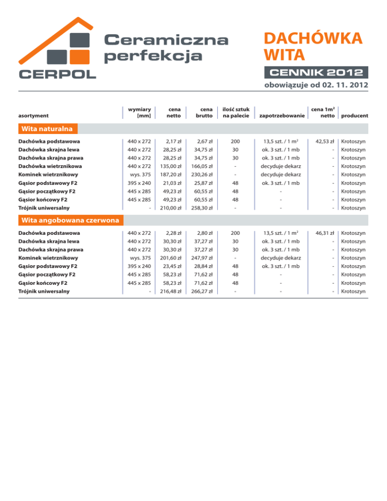 DACHÓWKA WITA CENNIK 2012 obowiązuje od 02. 11. 2012 wymiary [mm] cena netto cena brutto ilość sztuk na palecie zapotrzebowanie Dachówka podstawowa 440 x 272 2,17 zł 2,67 zł 200 13,5 szt. / 1 m2 42,53 zł Krotoszyn Dachówka skrajna lewa 440 x 272 28,25 zł 34,75 zł 30 ok. 3 szt. / 1 mb - Krotoszyn asortyment cena 1m2 netto producent Wita naturalna Dachówka skrajna prawa 440 x 272 28,25 zł 34,75 zł 30 ok. 3 szt. / 1 mb - Krotoszyn Dachówka wietrznikowa 440 x 272 135,00 zł 166,05 zł - decyduje dekarz - Krotoszyn Kominek wietrznikowy wys. 375 187,20 zł 230,26 zł - decyduje dekarz - Krotoszyn Gąsior podstawowy F2 395 x 240 21,03 zł 25,87 zł 48 ok. 3 szt. / 1 mb - Krotoszyn Gąsior początkowy F2 445 x 285 49,23 zł 60,55 zł 48 - - Krotoszyn Gąsior końcowy F2 445 x 285 49,23 zł 60,55 zł 48 - - Krotoszyn - 210,00 zł 258,30 zł - - - Krotoszyn 440 x 272 2,28 zł 2,80 zł 200 13,5 szt. / 1 m2 46,31 zł Krotoszyn Trójnik uniwersalny Wita angobowana czerwona Dachówka podstawowa Dachówka skrajna lewa 440 x 272 30,30 zł 37,27 zł 30 ok. 3 szt. / 1 mb - Krotoszyn Dachówka skrajna prawa 440 x 272 30,30 zł 37,27 zł 30 ok. 3 szt. / 1 mb - Krotoszyn Kominek wietrznikowy wys. 375 201,60 zł 247,97 zł - decyduje dekarz - Krotoszyn Gąsior podstawowy F2 395 x 240 23,45 zł 28,84 zł 48 ok. 3 szt. / 1 mb - Krotoszyn Gąsior początkowy F2 445 x 285 58,23 zł 71,62 zł 48 - - Krotoszyn Gąsior końcowy F2 445 x 285 58,23 zł 71,62 zł 48 - - Krotoszyn - 216,48 zł 266,27 zł - - - Krotoszyn Trójnik uniwersalny
