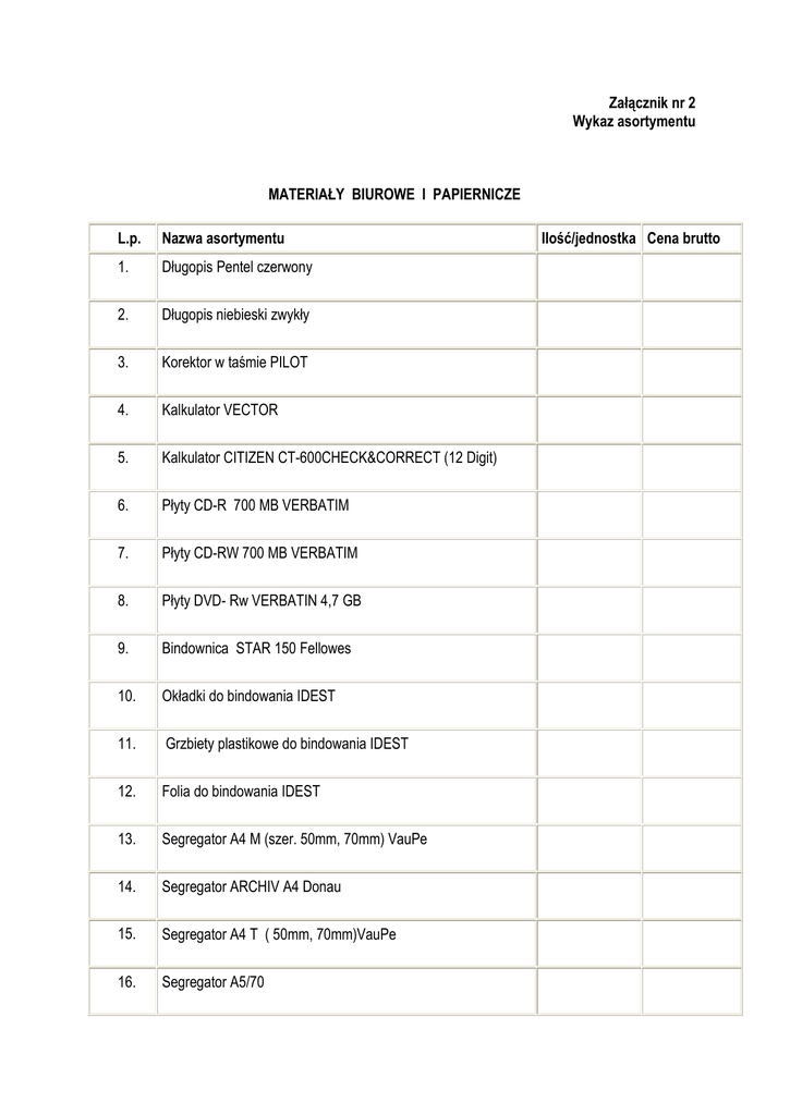 Załącznik nr 2 Wykaz asortymentu MATERIAŁY BIUROWE I PAPIERNICZE L.p. Nazwa asortymentu 1. Długopis Pentel czerwony 2. Długopis niebieski zwykły 3. Korektor w taśmie PILOT 4. Kalkulator VECTOR 5. Kalkulator CITIZEN CT-600CHECK&CORRECT (12 Digit) 6. Płyty CD-R 700 MB VERBATIM 7. Płyty CD-RW 700 MB VERBATIM 8. Płyty DVD- Rw VERBATIN 4,7 GB 9. Bindownica STAR 150 Fellowes 10. Okładki do bindowania IDEST 11. Grzbiety plastikowe do bindowania IDEST 12. Folia do bindowania IDEST 13. Segregator A4 M (szer. 50mm, 70mm) VauPe 14. Segregator ARCHIV A4 Donau 15. Segregator A4 T ( 50mm, 70mm)VauPe 16. Segregator A5/70 Ilość/jednostka Cena brutto 17. Segregator A5/50 18. Ofertówki krystaliczne IDEST , LEITZ (A4) 19. Skoroszyt kartonowy hakowy (połówkowy, pełny) IDEST 20. Skoroszyt kartonowy oczkowy (połówkowy, pełny) IDEST 21. Skoroszyt PCV A4 zawieszany IDEST 22. Skoroszyt zwykły A4 tekturowy KIELTECH 23. Teczka wiązana kartonowa (biała) 24. Teczka tekturowa kolorowa na gumkę 25. Skoroszyt do akt osobowych IDEST 26. Skoroszyt do akt osobowych ( twarda oprawa introligatorska) DELFIN 27. Półka biurowa IDEST 28. Poduszki do stempli TRODAT 29. Tusz do stempli gumowych 199 PO NORIS 30. Zszywacz SAX 39 31. Rozzszywacz No. 150 32. Zszywki Grand 24/6 33. Zszywki Grand 23/8 34. Dziurkacz SAX 418 35. Dziurkacz PUNCH PREMIUM RANGE REXEL 36. Nożyczki LACO 37. Sznurek 38. Taśmy pakowe GRAND 39. Taśma biurowa GRAND 40. Klej w sztyfcie PRIT 41. Spinacz owalny R50 42. Spinacz okrągły R28 43. Spinacz trójkątny T25 44. Klipy do papieru Grand ( 19mm, 32mm, 51mm) 45. Pinezki srebrne GRAND 46. Pinezki do tablic 47. Gumki Recepturki DONAU 48. Identyfikator z klipsem IDEST 49. Długopis PILOT REXGRIP 50. Długopis ZENITH 7 51. Długopis BK77 PENTEL 52. Długopis ORANGE BIC 53. Długopis CRISTAL BIC 54. Ołówek zwykły HB 55. Gumka ZEH PENTEL 56. Temperówka KAMET , KUM( metalowa) 57. Marker do znakowania płyt CD 58. Zakreślacze 59. Korektor w piórze PRITT POCKET PEN 60. Korektor w płynie RAPID TIPP-EX 61. Korektor w płynie PRITT 62. Linijka 30 cm 63. Karteczki samoprzylepne HANDY 64. Zeszyt A4 96 kartek twarda oprawa 65. Papier podaniowy w kratkę A3 66. Kalka ołówkowa A4/50 67. Kalka maszynowa A4 68. Zeszyt A5 80 kartek 69. Zeszyt A5 16 kartek 70. Zeszyt A5 60 kartek 71. Marker olejowy 72. Pisak czarny MARKER 73. Rolka do faxu szer 210/30dł 74. Papier POL SPEED A3 Papier POL SPEED A4 Papier POL LUX A3 Papier POL LUX A4 Papier POL JET A3 Papier POL JET A4 75. Papier wizytówkowy A4 76. Okładki do dyplomów 77. Karton wizytówkowy 78. Koperty B5 średnie białe 79. Koperty B5 średnie szare 80. Koperty bąbelkowe 81. Koperty B4 duże białe 82. Koperty C6 małe białe samoprzylepne 83. Kostka papierowa biała 83. Kalendarz na biurko 84. Kalendarz książkowy 85. Zawieszki na klucze