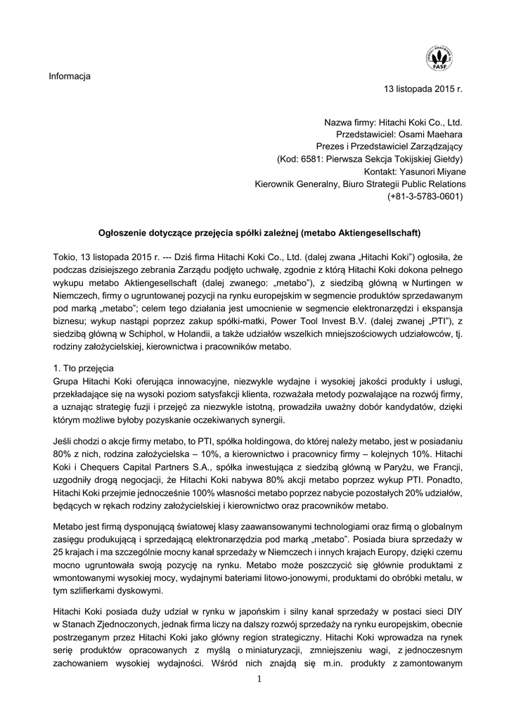 Informacja 13 listopada 2015 r. Nazwa firmy: Hitachi Koki Co., Ltd. Przedstawiciel: Osami Maehara Prezes i Przedstawiciel Zarządzający (Kod: 6581: Pierwsza Sekcja Tokijskiej Giełdy) Kontakt: Yasunori Miyane Kierownik Generalny, Biuro Strategii Public Relations (+81-3-5783-0601) Ogłoszenie dotyczące przejęcia spółki zależnej (metabo Aktiengesellschaft) Tokio, 13 listopada 2015 r. --- Dziś firma Hitachi Koki Co., Ltd. (dalej zwana „Hitachi Koki”) ogłosiła, że podczas dzisiejszego zebrania Zarządu podjęto uchwałę, zgodnie z którą Hitachi Koki dokona pełnego wykupu metabo Aktiengesellschaft (dalej zwanego: „metabo”), z siedzibą główną w Nurtingen w Niemczech, firmy o ugruntowanej pozycji na rynku europejskim w segmencie produktów sprzedawanym pod marką „metabo”; celem tego działania jest umocnienie w segmencie elektronarzędzi i ekspansja biznesu; wykup nastąpi poprzez zakup spółki-matki, Power Tool Invest B.V. (dalej zwanej „PTI”), z siedzibą główną w Schiphol, w Holandii, a także udziałów wszelkich mniejszościowych udziałowców, tj. rodziny założycielskiej, kierownictwa i pracowników metabo. 1. Tło przejęcia Grupa Hitachi Koki oferująca innowacyjne, niezwykle wydajne i wysokiej jakości produkty i usługi, przekładające się na wysoki poziom satysfakcji klienta, rozważała metody pozwalające na rozwój firmy, a uznając strategię fuzji i przejęć za niezwykle istotną, prowadziła uważny dobór kandydatów, dzięki którym możliwe byłoby pozyskanie oczekiwanych synergii. Jeśli chodzi o akcje firmy metabo, to PTI, spółka holdingowa, do której należy metabo, jest w posiadaniu 80% z nich, rodzina założycielska – 10%, a kierownictwo i pracownicy firmy – kolejnych 10%. Hitachi Koki i Chequers Capital Partners S.A., spółka inwestująca z siedzibą główną w Paryżu, we Francji, uzgodniły drogą negocjacji, że Hitachi Koki nabywa 80% akcji metabo poprzez wykup PTI. Ponadto, Hitachi Koki przejmie jednocześnie 100% własności metabo poprzez nabycie pozostałych 20% udziałów, będących w rękach rodziny założycielskiej i kierownictwo oraz pracowników metabo. Metabo jest firmą dysponującą światowej klasy zaawansowanymi technologiami oraz firmą o globalnym zasięgu produkującą i sprzedającą elektronarzędzia pod marką „metabo”. Posiada biura sprzedaży w 25 krajach i ma szczególnie mocny kanał sprzedaży w Niemczech i innych krajach Europy, dzięki czemu mocno ugruntowała swoją pozycję na rynku. Metabo może poszczycić się głównie produktami z wmontowanymi wysokiej mocy, wydajnymi bateriami litowo-jonowymi, produktami do obróbki metalu, w tym szlifierkami dyskowymi. Hitachi Koki posiada duży udział w rynku w japońskim i silny kanał sprzedaży w postaci sieci DIY w Stanach Zjednoczonych, jednak firma liczy na dalszy rozwój sprzedaży na rynku europejskim, obecnie postrzeganym przez Hitachi Koki jako główny region strategiczny. Hitachi Koki wprowadza na rynek serię produktów opracowanych z myślą o miniaturyzacji, zmniejszeniu wagi, z jednoczesnym zachowaniem wysokiej wydajności. Wśród nich znajdą się m.in. produkty z zamontowanym 1 bezszczotkowym silnikiem elektrycznym i produkty z wysoce wydajnymi bateriami litowo-jonowymi o dużej żywotności. Narzędzia pneumatyczne, takie jak gwoździarki, także stanowią o silnej pozycji Hitachi Koki na rynku. Dzięki temu przejęciu Hitachi Koki pozyska silną markę metabo oraz potężny kanał sprzedaży w Europie, m.in. w Niemczech. Jednocześnie, Hitachi Koki mogłoby zwiększyć ilość zamówień w Europie, co przyczyniłoby się do ograniczenia ryzyka kursowego związanego z euro, co od dłuższego czasu stanowiło już istotną kwestię. Dodatkowo Hitachi Koki i metabo mogłyby oczekiwać takich synergii jak wzmocnienie oferty produktowej marki metabo poprzez dostarczenie technologii Hitachi Koki, zwiększenie efektywności poprzez wykorzystanie osiągnięć metabo w zakresie wysokowydajnych elektronarzędzi, a także dalszą ekspansję sprzedażową produktów obu marek poprzez obopólne wykorzystanie sieci sprzedaży i serwisu. Hitachi Koki oraz metabo, dzięki mocnym stronom każdej z firm, mają wobec siebie komplementarną relację w zakresie uzupełniania możliwości rozwoju i sprzedaży oraz wprowadzania na rynek kolejnych produktów. Hitachi Koki postrzega metabo jako najlepszego partnera w zakresie zwiększania wartości przedsiębiorstwa. Grupa Hitachi Koki, poprzez rozwój skali biznesu i szybsze zwiększenie dochodowości poprzez te różnorodne synergie, pragnie szybko uzyskać cel zakładający uzyskanie o minimum 10% wyższej marży operacyjnej. 2. Opis spółki zależnej (PTI i metabo), która ma zostać przejęta Power Tool Invest B.V. (1) Nazwa firmy Power Tool Invest B.V. (2) (3) (4) (5) (6) Siedziba główna Przedstawieciele Opis działalności Kapitał Data założenia (7) Struktura własności (8) Powiązania między Hitachi Koki i PTI (9) Schiphol Boulevard 407, 1118 BK Schiphol, Holandia A: S.Mulard, K. Hartmann B: M.Stoop, W. Beezemer Spółka holdingowa 8 000 000 EUR 5 czerwca 2012 r. Chequers Capital XVI FCPR Equity Finance S.A. Inni (8 osób) Powiązania Brak powiązań do odnotowania. kapitałowe Powiązania Brak powiązań do odnotowania. osobowe Powiązania Brak powiązań do odnotowania. biznesowe 98,25% 1,51% 0,24% Wyniki historyczne przedsiębiorstwa oraz sytuacja finansowa PTI (w milionach EUR) Rok podatkowy Rok podatkowy Rok podatkowy zakończony w Okres zakończony w zakończony w grudniu 2014 r. obrachunkowy grudniu 2012 r. grudniu 2013 r. (MSSF) (standardy (standardy holenderskie) holenderskie) Wartość aktywów netto Aktywa ogółem Przychody Zysk operacyjny Zysk netto przypisany udziałowcom Power Tool Invest B.V. 8,9 181,2 109,6 2,3 7,1 180,3 339,4 10,1 19,5 215,0 360,0 10,8 △2,5 △0,1 1,1 2 Uwagi: Istnieją dwa przypadki posiadania prawa do reprezentacji: 1) Zarząd składaj