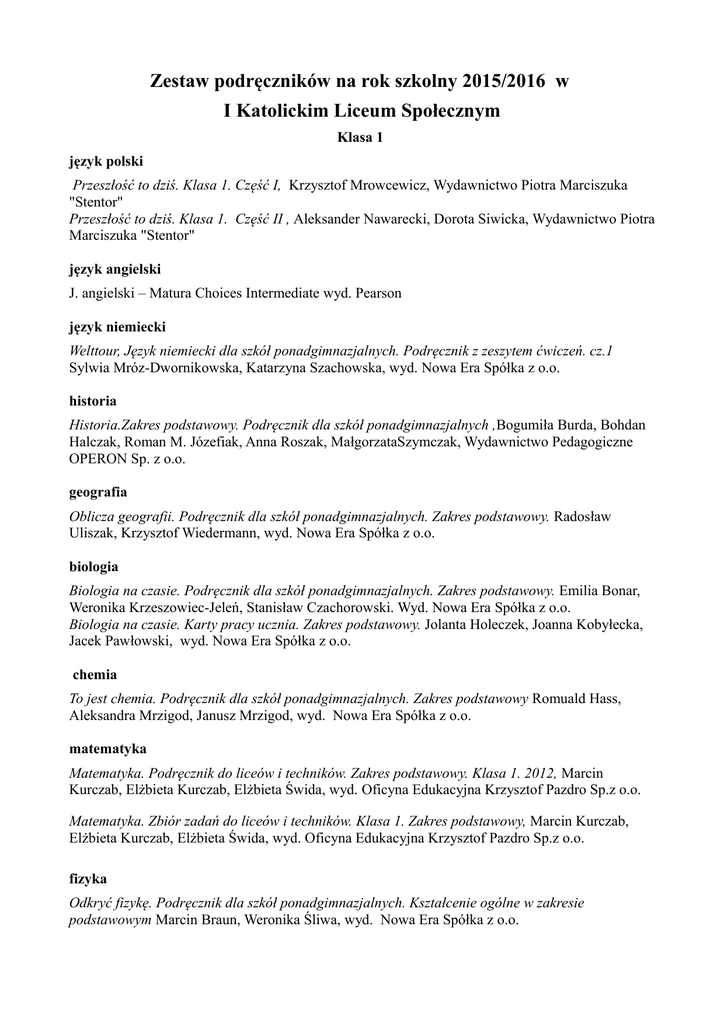 Zestaw podręczników na rok szkolny 2015/2016 w I Katolickim Liceum Społecznym Klasa 1 język polski Przeszłość to dziś. Klasa 1. Część I, Krzysztof Mrowcewicz, Wydawnictwo Piotra Marciszuka "Stentor" Przeszłość to dziś. Klasa 1. Część II , Aleksander Nawarecki, Dorota Siwicka, Wydawnictwo Piotra Marciszuka "Stentor" język angielski J. angielski – Matura Choices Intermediate wyd. Pearson język niemiecki Welttour, Język niemiecki dla szkół ponadgimnazjalnych. Podręcznik z zeszytem ćwiczeń. cz.1 Sylwia Mróz-Dwornikowska, Katarzyna Szachowska, wyd. Nowa Era Spółka z o.o. historia Historia.Zakres podstawowy. Podręcznik dla szkół ponadgimnazjalnych ,Bogumiła Burda, Bohdan Halczak, Roman M. Józefiak, Anna Roszak, MałgorzataSzymczak, Wydawnictwo Pedagogiczne OPERON Sp. z o.o. geografia Oblicza geografii. Podręcznik dla szkół ponadgimnazjalnych. Zakres podstawowy. Radosław Uliszak, Krzysztof Wiedermann, wyd. Nowa Era Spółka z o.o. biologia Biologia na czasie. Podręcznik dla szkół ponadgimnazjalnych. Zakres podstawowy. Emilia Bonar, Weronika Krzeszowiec-Jeleń, Stanisław Czachorowski. Wyd. Nowa Era Spółka z o.o. Biologia na czasie. Karty pracy ucznia. Zakres podstawowy. Jolanta Holeczek, Joanna Kobyłecka, Jacek Pawłowski, wyd. Nowa Era Spółka z o.o. chemia To jest chemia. Podręcznik dla szkół ponadgimnazjalnych. Zakres podstawowy Romuald Hass, Aleksandra Mrzigod, Janusz Mrzigod, wyd. Nowa Era Spółka z o.o. matematyka Matematyka. Podręcznik do liceów i techników. Zakres podstawowy. Klasa 1. 2012, Marcin Kurczab, Elżbieta Kurczab, Elżbieta Świda, wyd. Oficyna Edukacyjna Krzysztof Pazdro Sp.z o.o. Matematyka. Zbiór zadań do liceów i techników. Klasa 1. Zakres podstawowy, Marcin Kurczab, Elżbieta Kurczab, Elżbieta Świda, wyd. Oficyna Edukacyjna Krzysztof Pazdro Sp.z o.o. fizyka Odkryć fizykę. Podręcznik dla szkół ponadgimnazjalnych. Kształcenie ogólne w zakresie podstawowym Marcin Braun, Weronika Śliwa, wyd. Nowa Era Spółka z o.o. wiedza o społeczeństwie Wiedza o społeczeństwie. Zakres podstawowy. Podręcznik dla szkół ponadgimnazjalnych. Zbigniew Smutek, Jan Maleska, Wydawnictwo Pedagogiczne OPERON Sp. z o.o. podstawy przedsiebiorczości Krok w przedsiębiorczość. Podręcznik do podstaw przedsiębiorczości dla szkół ponadgimnazjalnych. Zbigniew Makieła, Tomasz Rachwał, Wyd. Nowa Era wiedza o kulturze Wiedza o kulturze, Wacław Panek, Wydawnictwo Polskie Wołomin Klasa 2 język polski Przeszłość to dziś.Podręcznik dla klasy II liceum i technikum, cz. I, Ewa Paczoska, Wydawnictwo Piotra Marciszuka "Stentor" Przeszłość to dziś.Podręcznik dla klasy II liceum i technikum, cz. II, Jacek Kopciński, Wydawnictwo Piotra Marciszuka "Stentor" , język angielski Matura Choices Upper-Intermediate (książka + ćwiczenia) wyd. Pearson język niemiecki Welttour, Język niemiecki dla szkół ponadgimnazjalnych. Podręcznik z zeszytem ćwiczeń. cz.2 Sylwia Mróz-Dwornikowska, Urszula Górecka, wyd. Nowa Era Sp. z o.o. geografia Oblicza geografii 1.Podręcznik dla liceum ogólnokształcącego i technikum. Zakres rozszerzony Roman Malarz, Marek Więckowski, Wyd. Nowa Era Sp. z o.o. matematyka Matematyka. Podręcznik do liceów i techników. Klasa 2, K. Kłaczkow, M. Kurczab, E. Świda, wyd. Oficyna Edukacyjna Krzysztof Pazdro, wydanie z 2013 r. Matematyka. Zbiór zadań do liceów i techników. Klasa 2. Zakres podstawowy, Marcin Kurczab, Elżbieta Kurczab, Elżbieta Świda, wyd. Oficyna Edukacyjna Krzysztof Pazdro Sp.z o.o. wos Wiedza o społeczeństwie. Zakres rozszerzony, cz.I Jan Maleska, Zbigniew Smutek, Beata Surmacz, Wyd Operon ( 2013 rok) Historia Ciekawi świata 1. Starożytność. Roman Czaja, Małgorzata Strzelecka, Jan Wroniszewski, wyd. Operon Ciekawi świata 2. Średniowiecze, Roman Czaja, Małgorzata Strzelecka, Jan Wroniszewski, wyd. Operon Historia i społeczeństwo Poznać przeszłość. Ojczysty Panteon i ojczyste spory. Tomasz Maćkowski, Wyd. Nowa Era sp. z o.o. Biologia (rozsz.) Biologia na czasie 1. Podręcznik dla liceum ogólnokształcącego i technikum. Zakres rozszerzony, Marek Guzik, Ewa Jastrzębska, Ryszard Kozik, Renata Matuszewska, Ewa Pyłka-Gutowska, Władysław Zamachowski, wyd. Nowa Era Sp. z o.o. Biologia na czasie 1. Maturalne karty pracy. Zakres rozszerzony, Barbara Arciuch, Magdalena Fiałkowska-Kołek, i inni, wyd. Nowa Era Sp. z o.o. Biologia na czasie 2. Podręcznik dla liceum ogólnokształcącego i technikum. Zakres rozszerzony Maria Marko-Worłowska, Ryszard Kozik, Władysław Zamachowski, Stanisław Krawczyk, Franciszek Dubert, Adam Kula, wyd. Nowa Era Sp. z o.o. Biologia na czasie 2. Maturalne karty pracy. Zakres rozszerzony, Piotr Tadeusz Kąkol, Alina Nowakowska, Jacek Pawłowski, Urszula Poziomek, wyd. Nowa Era Sp. z o.o. Klasa 3 język polski Przeszłość to dziś .Podręcznik dla klasy III liceum i technikum, Jacek Kopciński, Wydawnictwo Piotra Marciszuka "Stentor" język angielski Oxford Matura Trainer poziom podstawowy i zaawansowany, Wyd. Oxford University Press język niemiecki Welttour 3. Język niemiecki dla szkół ponadgimnazjalnych. Podręcznik z zeszytem ćwiczeń. cz.3, Sylwia Mróz-Dwornikowska, Katarzyna Szachowska, wyd. Nowa Era Sp. z o.o. historia i społeczeństwo Historia i społeczeństwo, Kobieta i mężczyzna, rodzina, Markowicz, Pytlińska, Wyroda,, wyd. WSiP geografia Oblicza geografii 3. Podręcznik dla liceum ogólnokształcącego i technikum. Zakres rozszerzony, Marek Więckowski, Roman Malarz, wyd. Nowa Era Sp. z o.o. matematyka Matematyka. Podręcznik do liceów i techników. Klasa 3, K. Kłaczkow, M. Kurczab, E. Świda, Oficyna Edukacyjna Krzysztof Pazdro, 2012 Matematyka. Zbiór zadań do liceów i techników. Klasa 3. Zakres podstawowy, Marcin Kurczab, Elżbieta Kurczab, Elżbieta Świda, Oficyna Edukacyjna Krzysztof Pazdro, wiedza o społeczeństwie Odkrywamy na nowo. Wiedza o społeczeństwie, zakres rozszerzony, cz.2, Zbigniew Smut