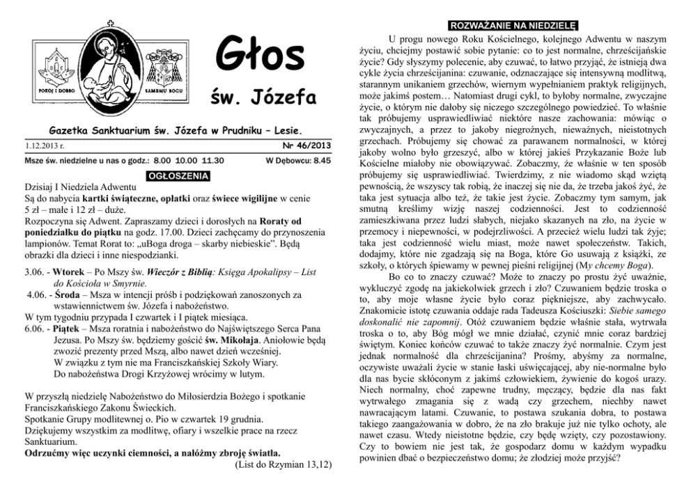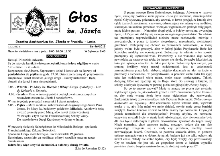 Głos św. Józefa Gazetka Sanktuarium św. Józefa w Prudniku – Lesie. Nr 46/2013 1.12.2013 r. Msze św. niedzielne u nas o godz.: 8.00 10.00 11.30 W Dębowcu: 8.45 OGŁOSZENIA Dzisiaj I Niedziela Adwentu Są do nabycia kartki świąteczne, opłatki oraz świece wigilijne w cenie 5 zł – małe i 12 zł – duże. Rozpoczyna się Adwent. Zapraszamy dzieci i dorosłych na Roraty od poniedziałku do piątku na godz. 17.00. Dzieci zachęcamy do przynoszenia lampionów. Temat Rorat to: „uBoga droga – skarby niebieskie”. Będą obrazki dla dzieci i inne niespodzianki. 3.06. - Wtorek – Po Mszy św. Wieczór z Biblią: Księga Apokalipsy – List do Kościoła w Smyrnie. 4.06. - Środa – Msza w intencji próśb i podziękowań zanoszonych za wstawiennictwem św. Józefa i nabożeństwo. W tym tygodniu przypada I czwartek i I piątek miesiąca. 6.06. - Piątek – Msza roratnia i nabożeństwo do Najświętszego Serca Pana Jezusa. Po Mszy św. będziemy gościć św. Mikołaja. Aniołowie będą zwozić prezenty przed Mszą, albo nawet dzień wcześniej. W związku z tym nie ma Franciszkańskiej Szkoły Wiary. Do nabożeństwa Drogi Krzyżowej wrócimy w lutym. W przyszłą niedzielę Nabożeństwo do Miłosierdzia Bożego i spotkanie Franciszkańskiego Zakonu Świeckich. Spotkanie Grupy modlitewnej o. Pio w czwartek 19 grudnia. Dziękujemy wszystkim za modlitwę, ofiary i wszelkie prace na rzecz Sanktuarium. Odrzućmy więc uczynki ciemności, a nałóżmy zbroję światła. (List do Rzymian 13,12) ROZWAŻANIE NA NIEDZIELĘ U progu nowego Roku Kościelnego, kolejnego Adwentu w naszym życiu, chciejmy postawić sobie pytanie: co to jest normalne, chrześcijańskie życie? Gdy słyszymy polecenie, aby czuwać, to łatwo przyjąć, że istnieją dwa cykle życia chrześcijanina: czuwanie, odznaczające się intensywną modlitwą, starannym unikaniem grzechów, wiernym wypełnianiem praktyk religijnych, może jakimś postem… Natomiast drugi cykl, to byłoby normalne, zwyczajne życie, o którym nie dałoby się niczego szczególnego powiedzieć. To właśnie tak próbujemy usprawiedliwiać niektóre nasze zachowania: mówiąc o zwyczajnych, a przez to jakoby niegroźnych, nieważnych, nieistotnych grzechach. Próbujemy się chować za parawanem normalności, w której jakoby wolno było grzeszyć, albo w której jakieś Przykazanie Boże lub Kościelne miałoby nie obowiązywać. Zobaczmy, że właśnie w ten sposób próbujemy się usprawiedliwiać. Twierdzimy, z nie wiadomo skąd wziętą pewnością, że wszyscy tak robią, że inaczej się nie da, że trzeba jakoś żyć, że taka jest sytuacja albo też, że takie jest życie. Zobaczmy tym samym, jak smutną kreślimy wizję naszej codzienności. Jest to codzienność zamieszkiwana przez ludzi słabych, niejako skazanych na zło, na życie w przemocy i niepewności, w podejrzliwości. A przecież wielu ludzi tak żyje; taka jest codzienność wielu miast, może nawet społeczeństw. Takich, dodajmy, które nie zgadzają się na Boga, które Go usuwają z książki, ze szkoły, o których śpiewamy w pewnej pieśni religijnej (My chcemy Boga). Bo co to znaczy czuwać? Może to znaczy po prostu żyć uważnie, wykluczyć zgodę na jakiekolwiek grzech i zło? Czuwaniem będzie troska o to, aby moje własne życie było coraz piękniejsze, aby zachwycało. Znakomicie istotę czuwania oddaje rada Tadeusza Kościuszki: Siebie samego doskonalić nie zapomnij. Otóż czuwaniem będzie właśnie stała, wytrwała troska o to, aby Bóg mógł we mnie działać, czynić mnie coraz bardziej świętym. Koniec końców czuwać to także znaczy żyć normalnie. Czym jest jednak normalność dla chrześcijanina? Prośmy, abyśmy za normalne, oczywiste uważali życie w stanie łaski uświęcającej, aby nie-normalne było dla nas bycie skłóconym z jakimś człowiekiem, żywienie do kogoś urazy. Niech normalny, choć zapewne trudny, męczący, będzie dla nas fakt wytrwałego zmagania się z wadą czy grzechem, niechby nawet nawracającym latami. Czuwanie, to postawa szukania dobra, to postawa takiego zaangażowania w dobro, że na zło brakuje już nie tylko ochoty, ale nawet czasu. Wtedy nieistotne będzie, czy będę wzięty, czy pozostawiony. Czy to bowiem nie jest tak, że gospodarz domu w każdym wypadku powinien dbać o bezpieczeństwo domu; że złodziej może przyjść? Jezus, wskazując na niebezpieczeństwo grabieży, które przecież jest czymś stałym i zawsze aktualnym, chce nam wyraziście wskazać na to, że czuwać trzeba będzie stale. Nie jest przecież ideałem życia chrześcijańskiego, aby nie dać się zaskoczyć. Ideałem będzie to, aby przyjście Chrystusa, obojętnie kiedy i w jakich okolicznościach nastąpi, zaskoczeniem dla nas nie było. Zobaczmy bowiem, że Jezus, przypominając wydarzenie Potopu, dotyka istoty grzechu: on zaślepia; człowiek zgadzający się na grzech, czerpiący z niego przyjemność, nie dostrzega zagrażającego mu niebezpieczeństwa, nie widzi, że zmierza ku ruinie. Pamiętamy, że nawet padający (nieprzerwanie!) 40. dni i nocy deszcz nie został zinterpretowany jako oczywiste i śmiertelne niebezpieczeństwo. Jeżeli dziś borykamy się ze skutkami demograficznej klęski, to czyż nie dlatego, że następstw swych chorych pomysłów nie przemyśleli ci, którzy tak zażarcie gardłowali za prawem do mordowania nienarodzonych? Czy ci, którzy przedstawiali ułatwianie rozwodów jako ogromny postęp, zdawali sobie sprawę, jakie będą tego dalekosiężne skutki? Czy one w ogóle są odwracalne? Jezus, wzywając do czuwania, chce nas uchronić przed niekoniecznym cierpieniem, takim, którego można uniknąć wtedy, gdy człowiek podąża za trudnym dobrem. Czuwać, to budować sobie nie tylko radosną wieczność, ale również sensowną doczesność, której nie komplikujemy sobie chorymi pomysłami, eksperymentami. INTENCJE MSZALNE 02.12. - Poniedziałek. 17.00 Za + Jerzego Kotturz.