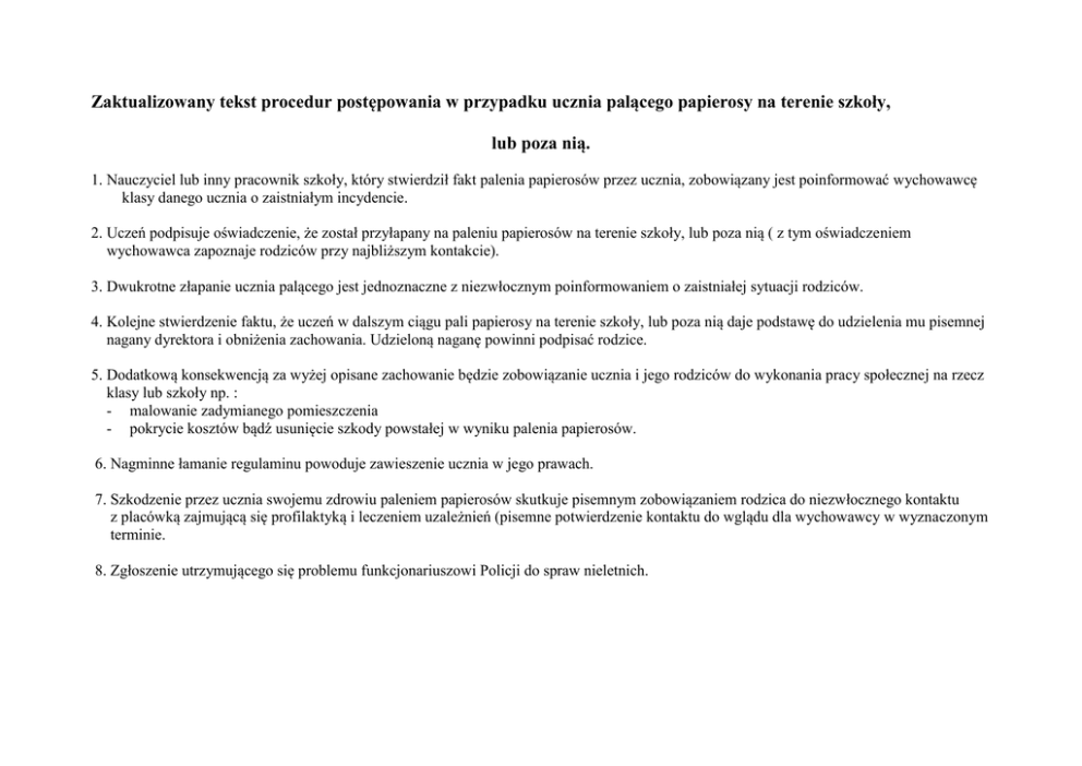 Zaktualizowany tekst procedur postępowania w przypadku ucznia palącego papierosy na terenie szkoły, lub poza nią. 1. Nauczyciel lub inny pracownik szkoły, który stwierdził fakt palenia papierosów przez ucznia, zobowiązany jest poinformować wychowawcę klasy danego ucznia o zaistniałym incydencie. 2. Uczeń podpisuje oświadczenie, że został przyłapany na paleniu papierosów na terenie szkoły, lub poza nią ( z tym oświadczeniem wychowawca zapoznaje rodziców przy najbliższym kontakcie). 3. Dwukrotne złapanie ucznia palącego jest jednoznaczne z niezwłocznym poinformowaniem o zaistniałej sytuacji rodziców. 4. Kolejne stwierdzenie faktu, że uczeń w dalszym ciągu pali papierosy na terenie szkoły, lub poza nią daje podstawę do udzielenia mu pisemnej nagany dyrektora i obniżenia zachowania. Udzieloną naganę powinni podpisać rodzice. 5. Dodatkową konsekwencją za wyżej opisane zachowanie będzie zobowiązanie ucznia i jego rodziców do wykonania pracy społecznej na rzecz klasy lub szkoły np. : - malowanie zadymianego pomieszczenia - pokrycie kosztów bądź usunięcie szkody powstałej w wyniku palenia papierosów. 6. Nagminne łamanie regulaminu powoduje zawieszenie ucznia w jego prawach. 7. Szkodzenie przez ucznia swojemu zdrowiu paleniem papierosów skutkuje pisemnym zobowiązaniem rodzica do niezwłocznego kontaktu z placówką zajmującą się profilaktyką i leczeniem uzależnień (pisemne potwierdzenie kontaktu do wglądu dla wychowawcy w wyznaczonym terminie. 8. Zgłoszenie utrzymującego się problemu funkcjonariuszowi Policji do spraw nieletnich.