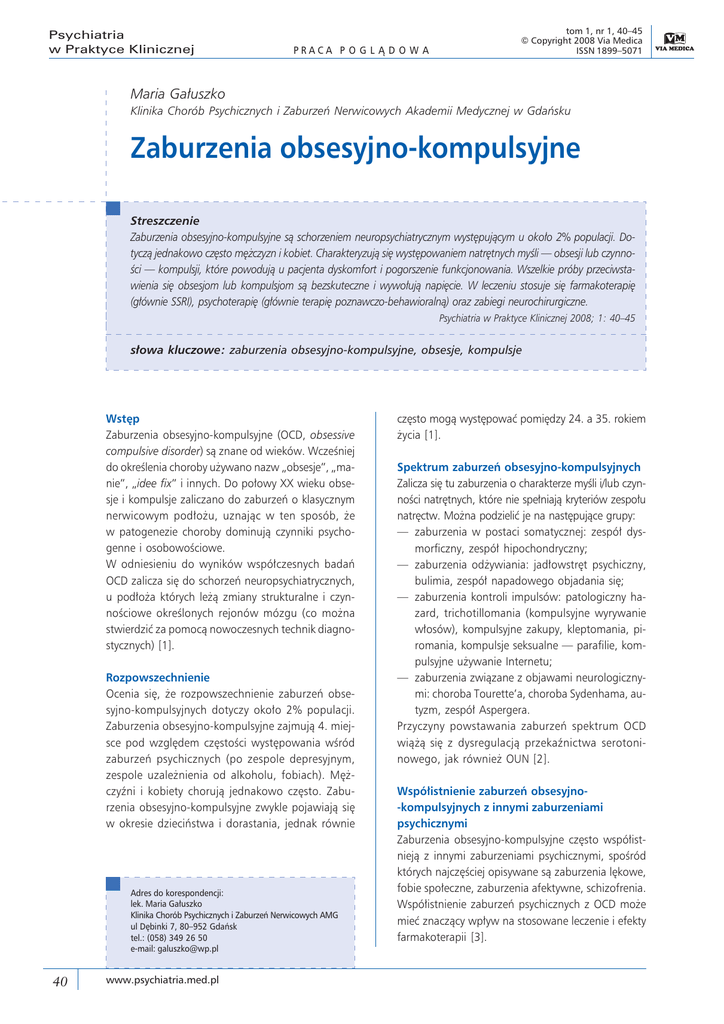 Psychiatria w Praktyce Klinicznej PRACA P O G L Ą D O W A tom 1, nr 1, 40–45 © Copyright 2008 Via Medica ISSN 1899–5071 Maria Gałuszko Klinika Chorób Psychicznych i Zaburzeń Nerwicowych Akademii Medycznej w Gdańsku Zaburzenia obsesyjno-kompulsyjne Streszczenie Zaburzenia obsesyjno-kompulsyjne są schorzeniem neuropsychiatrycznym występującym u około 2% populacji. Dotyczą jednakowo często mężczyzn i kobiet. Charakteryzują się występowaniem natrętnych myśli — obsesji lub czynności — kompulsji, które powodują u pacjenta dyskomfort i pogorszenie funkcjonowania. Wszelkie próby przeciwstawienia się obsesjom lub kompulsjom są bezskuteczne i wywołują napięcie. W leczeniu stosuje się farmakoterapię (głównie SSRI), psychoterapię (głównie terapię poznawczo-behawioralną) oraz zabiegi neurochirurgiczne. Psychiatria w Praktyce Klinicznej 2008; 1: 40–45 słowa kluczowe: zaburzenia obsesyjno-kompulsyjne, obsesje, kompulsje Wstęp Zaburzenia obsesyjno-kompulsyjne (OCD, obsessive compulsive disorder) są znane od wieków. Wcześniej do określenia choroby używano nazw „obsesje”, „manie”, „idee fix” i innych. Do połowy XX wieku obsesje i kompulsje zaliczano do zaburzeń o klasycznym nerwicowym podłożu, uznając w ten sposób, że w patogenezie choroby dominują czynniki psychogenne i osobowościowe. W odniesieniu do wyników współczesnych badań OCD zalicza się do schorzeń neuropsychiatrycznych, u podłoża których leżą zmiany strukturalne i czynnościowe określonych rejonów mózgu (co można stwierdzić za pomocą nowoczesnych technik diagnostycznych) [1]. Rozpowszechnienie Ocenia się, że rozpowszechnienie zaburzeń obsesyjno-kompulsyjnych dotyczy około 2% populacji. Zaburzenia obsesyjno-kompulsyjne zajmują 4. miejsce pod względem częstości występowania wśród zaburzeń psychicznych (po zespole depresyjnym, zespole uzależnienia od alkoholu, fobiach). Mężczyźni i kobiety chorują jednakowo często. Zaburzenia obsesyjno-kompulsyjne zwykle pojawiają się w okresie dzieciństwa i dorastania, jednak równie Adres do korespondencji: lek. Maria Gałuszko Klinika Chorób Psychicznych i Zaburzeń Nerwicowych AMG ul Dębinki 7, 80–952 Gdańsk tel.: (058) 349 26 50 e-mail: [email protected] 40 www.psychiatria.med.pl często mogą występować pomiędzy 24. a 35. rokiem życia [1]. Spektrum zaburzeń obsesyjno-kompulsyjnych Zalicza się tu zaburzenia o charakterze myśli i/lub czynności natrętnych, które nie spełniają kryteriów zespołu natręctw. Można podzielić je na następujące grupy: — zaburzenia w postaci somatycznej: zespół dysmorficzny, zespół hipochondryczny; — zaburzenia odżywiania: jadłowstręt psychiczny, bulimia, zespół napadowego objadania się; — zaburzenia kontroli impulsów: patologiczny hazard, trichotillomania (kompulsyjne wyrywanie włosów), kompulsyjne zakupy, kleptomania, piromania, kompulsje seksualne — parafilie, kompulsyjne używanie Internetu; — zaburzenia związane z objawami neurologicznymi: choroba Tourette’a, choroba Sydenhama, autyzm, zespół Aspergera. Przyczyny powstawania zaburzeń spektrum OCD wiążą się z dysregulacją przekaźnictwa serotoninowego, jak również OUN [2]. Współistnienie zaburzeń obsesyjno-kompulsyjnych z innymi zaburzeniami psychicznymi Zaburzenia obsesyjno-kompulsyjne często współistnieją z innymi zaburzeniami psychicznymi, spośród których najczęściej opisywane są zaburzenia lękowe, fobie społeczne, zaburzenia afektywne, schizofrenia. Współistnienie zaburzeń psychicznych z OCD może mieć znaczący wpływ na stosowane leczenie i efekty farmakoterapii [3]. Maria Gałuszko, Zaburzenia obsesyjno-kompulsyjne Etiopatogeneza Czynniki genetyczne Badania wykonane u chorych z OCD wykazały rodzinne występowanie zaburzeń. W porównaniu z osobami zdrowymi u osób z OCD wykryto znamienne różnice w polimorfizmie genów receptorowych układu dopaminergicznego. Zmiany dotyczą również genów receptorów serotoninergicznych. Zakłada się, że pewną rolę w etiologii OCD może odgrywać także układ przekaźnictwa noradrenergicznego [4]. Zmiany anatomiczne Zmiany anatomiczne i funkcjonalne dotyczą przede wszystkim płatów czołowych (głównie półkuli lewej), przedniej części zakrętu obręczy, jąder podkorowych (ogoniastego, soczewkowatego), gałki bladej, istoty czarnej, jądra grzbietowego szwu oraz struktur układu limbicznego. Zmiany obserwuje się również w połączeniach pomiędzy tymi strukturami. Potwierdzono to w badaniach takich jak pozytonowa tomografia emisyjna (PET, positron emission tomography) oraz tomografia komputerowa emisyjna pojedynczych fotonów (SPECT, single photon emission computed tomography) [5]. Badania neuropsychologiczne U pacjentów z OCD stale obserwuje się deficyt neuropsychologiczny. W porównaniu z populacją kontrolną bez OCD pamięć przestrzenna, przestrzenna zdolność przypominania oraz szybkość zapoczątkowywania i wykonywania czynności ruchowych są upośledzone. Natomiast zdolności wykonawcze, pamięć werbalna, uwaga oraz intelekt pozostają w normie [5]. Badania neuroimmunologiczne Wykazano związek pomiędzy OCD a chorobą Sydenhama (choroba autoimmunologiczna jąder podstawy); u chorych z OCD wykryto przeciwciała przeciwko jądru ogoniastemu. U 70% pacjentów leczonych z powodu choroby reumatycznej występowały objawy OCD. W ostatnich latach wyodrębniono grupę pediatrycznych, autoimmunologicznych zaburzeń neuropsychiatrycznych, związanych z infekcją paciorkowcową (PANDAS pediatric autoimmune neuropsychiatric disorder associated with streptococcal infections). Są to zaburzenia o charakterze natręctw i tików, które powstają w następstwie infekcji paciorkowcowej mającej miejsce w dzieciństwie. Zaburzenia te przebiegają z okresowymi zaostrzeniami, podczas których dochodzi do znacznego upośledzenia funkcjonowania chorego. Zaostrzenia wiążą się z reaktywacj