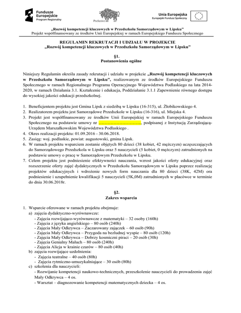 „Rozwój kompetencji kluczowych w Przedszkolu Samorządowym w Lipsku” Projekt współfinansowany ze środków Unii Europejskiej w ramach Europejskiego Funduszu Społecznego REGULAMIN REKRUTACJI I UDZIAŁU W PROJEKCIE „Rozwój kompetencji kluczowych w Przedszkolu Samorządowym w Lipsku” §1. Postanowienia ogólne Niniejszy Regulamin określa zasady rekrutacji i udziału w projekcie „Rozwój kompetencji kluczowych w Przedszkolu Samorządowym w Lipsku”, realizowanym ze środków Europejskiego Funduszu Społecznego w ramach Regionalnego Programu Operacyjnego Województwa Podlaskiego na lata 20142020, w ramach Działania 3.1. Kształcenie i edukacja, Poddziałanie 3.1.1 Zapewnienie równego dostępu do wysokiej jakości edukacji przedszkolnej. 1. Beneficjentem projektu jest Gmina Lipsk z siedzibą w Lipsku (16-315), ul. Żłobikowskiego 4. 2. Realizatorem projektu jest Samorządowe Przedszkole w Lipsku (16-316), ul. Miejska 4. 3. Projekt jest współfinansowany ze środków Unii Europejskiej w ramach Europejskiego Funduszu Społecznego na podstawie umowy nr ……………………….., podpisanej z Instytucją ZarządzającąUrzędem Marszałkowskim Województwa Podlaskiego . 4. Okres realizacji projektu: 01.09.2016 - 30.06.2018. 5. Zasięg: woj. podlaskie, powiat: augustowski, gmina Lipsk. 6. W ramach projektu wsparciem zostanie objętych 80 dzieci (38 kobiet, 42 mężczyzn) uczęszczających do Samorządowego Przedszkola w Lipsku oraz 5 nauczycieli (5 kobiet, 0 mężczyzn) zatrudnionych na podstawie umowy o pracę w Samorządowym Przedszkolu w Lipsku. 7. Celem projektu jest podniesienie efektywności nauczania, wzrost jakości oferty edukacyjnej oraz rozszerzenie oferty zajęć dydaktycznych w Przedszkolu Samorządowym w Lipsku poprzez realizację projektów edukacyjnych i wdrożenie nowych form nauczania dla 80 dzieci (38K, 42M) ora podniesienie i uzupełnienie kwalifikacji 5 nauczycieli (5K,0M) zatrudnionych w placówce w terminie do dnia 30.06.2018r. §2. Zakres wsparcia 1. Wsparcie oferowane w ramach projektu obejmuje: a) zajęcia dydaktyczno-wyrównawcze: - Zajęcia rozwijająco-wyrównawcze z matematyki – 32 osoby (160h) - Zajęcia z języka angielskiego – 80 osób (240h) - Zajęcia Mały Odkrywca – Zaczarowany zajączek – 60 osób (90h) - Zajęcia Mały Odkrywca – Przygoda na bezludnej wyspie – 80 osób (120h) - Zajęcia Mały Odkrywca – Dobrzy kosmiczni piraci – 20 osób (30h) - Zajęcia Genialny Maluch – 80 osób (240h) - Zajęcia Alicja w krainie czarów – 80 osób (40h) b) zajęcia rozwijające uzdolnienia: - Zajęcia teatralne – 40 osób (80h) - Zajęcia rytmiczno-umuzykalniające – 30 osób (80h) c) szkolenia dla nauczycieli: - Rozwijanie kompetencji naukowo-technicznych, przeszkolenie nauczycieli do prowadzenia zajęć Mały Odkrywca – 4 os. - Warsztat – diagnozowanie kompetencji matematycznych dziecka – 4 os. „Rozwój kompetencji kluczowych w Przedszkolu Samorządowym w Lipsku” Projekt współfinansowany ze środków Unii Europejskiej w ramach Europejskiego Funduszu Społecznego - Warsztat – rozwijanie kompetencji kluczowych – 5 os. - Warsztat dla nauczycieli przygotowujący do prowadzenia zajęć Alicja w krainie czarów 5os. d) wyjazdy edukacyjne: - wyjazd edukacyjny do SOK w ramach zajęć teatralnych – 32 os. - wyjazd edukacyjny do Teatru Lalek w ramach zajęć teatralnych – 32 os. - wyjazd edukacyjny do SOK w ramach zajęć rytmiczno-umuzykalniających – 32os. §3. Uczestnicy projektu 1. Grupą docelową projektu jest: a) 80 dzieci (38 kobiet, 42 mężczyzn) b) 5 nauczycieli (5 kobiet, 0 mężczyzn) 2. Uczestnikami projektu będą dzieci uczęszczające do Samorządowego Przedszkola w Lipsku oraz nauczyciele zatrudnieni w Samorządowym Przedszkolu w Lipsku. 3. Uczestnikami projektu będą osoby zamieszkujące na terenie woj. podlaskiego. 4. Uczestnictwo w projekcie jest całkowicie bezpłatne. §4. Ogólne zasady rekrutacji 1. Rekrutacja będzie prowadzona w siedzibie Samorządowego Przedszkola w Lipsku (16-316), ul. Miejska 4. 2. Rekrutacja uczestników poprzedzona będzie kampanią informacyjną w Przedszkolu: plakat i broszura informacyjna, informacje na stronie internetowej Przedszkola i Wnioskodawcy, spotkania informacyjne z rodzicami oraz z nauczycielami. Informacja zostanie skierowana do dzieci, rodziców/opiekunów, nauczycieli i wychowawców. 3. Rekrutacja zostanie przeprowadzona w oparciu o wyniki diagnozy przeprowadzonej w przedszkolu przez kadrę dydaktyczną i zatwierdzonej przez organ prowadzący. 4. Termin rekrutacji ustala się na: miesiąc przed rozpoczęciem danej formy wsparcia/danych zajęć a w przypadku szkoleń dla nauczycieli miesiąc przed rozpoczęciem rekrutacji na szkolenia. 5. Zostanie utworzona lista uczestników poszczególnych zajęć/form wsparcia oraz ewentualna lista rezerwowa. W przypadku rezygnacji dziecka z danych zajęć na jego miejsce zostanie zakwalifikowana osoba z listy rezerwowej. 6. O zakwalifikowaniu dziecka na poszczególne zajęcia będzie decydował nauczyciel w oparciu o wyniki diagnozy oraz deklarację uczestnictwa dziecka w zajęciach złożoną przez rodzica/opiekuna. Kryterium rekrutacji będzie zgodność z grupą docelową (dzieci uczęszczające do Samorządowego Przedszkola w Lipsku., nauczyciele zatrudnieni w ww. przedszkolu), a następnie opis wynikający z diagnozy potrzeb przedszkola. 7. Osobą odpowiedzialnością za rekrutację będzie koordynator/ka i specjalista/specjalistka ds. rozliczeń przy współpracy z nauczycielami przedszkola. 8. Uczestnicy zostaną zobowiązani do złożenia dokumentów rekrutacyjnych: a) Formularz rekrutacyjny b) Deklaracja udziału w projekcie i oświadczenie o wyrażeniu zgody na przetwarzanie danych osobowych c) Potwierdzenie zapoznania się z regulaminem rekrutacji i udziału w projekcie „Rozwój kompetencji kluczowych w Przedszkolu Samorządowym w Lipsku” Projekt współfinansowany ze środków Unii Europejskiej