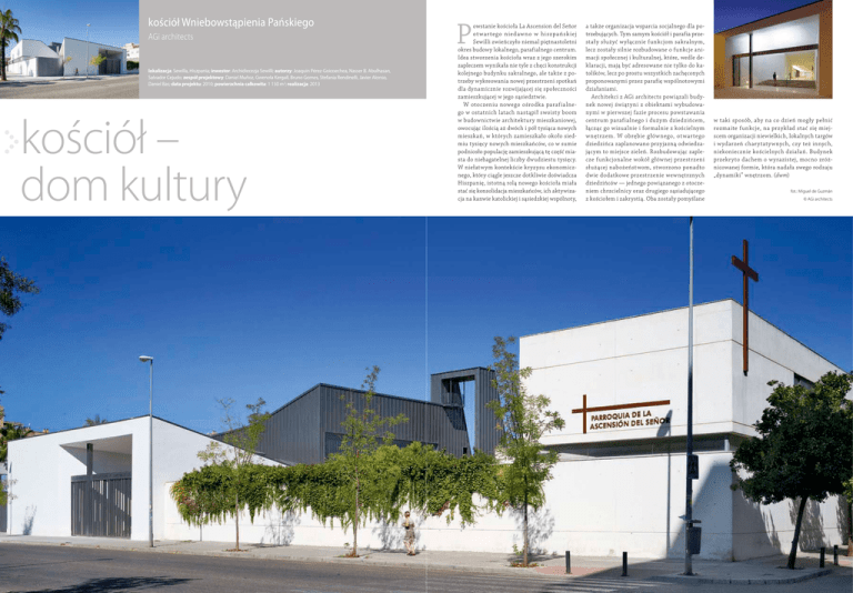kościół Wniebowstąpienia Pańskiego P AGi architects lokalizacja: Sewilla, Hiszpania; inwestor: Archidiecezja Sewilli; autorzy: Joaquín Pérez-Goicoechea, Nasser B. Abulhasan, Salvador Cejudo; zespół projektowy: Daniel Muñoz, Gwenola Kergall, Bruno Gomes, Stefania Rendinelli, Javier Alonso, Daniel Bas; data projektu: 2010; powierzchnia całkowita: 1 150 m2; realizacja: 2013 kościół – dom kultury 76 architektura & biznes 7/82014 owstanie kościoła La Ascension del Señor ot wa r tego n ied aw no w h i sz pa ń sk iej Sewilli zwieńczyło niemal piętnastoletni okres budowy lokalnego, parafialnego centrum. Idea stworzenia kościoła wraz z jego szerokim zapleczem wynikała nie tyle z chęci konstrukcji kolejnego budynku sakralnego, ale także z potrzeby wykreowania nowej przestrzeni spotkań dla dynamicznie rozwijającej się społeczności zamieszkującej w jego sąsiedztwie. W otoczeniu nowego ośrodka parafialnego w ostatnich latach nastąpił swoisty boom w budownictwie architektury mieszkaniowej, owocując ilością aż dwóch i pół tysiąca nowych mieszkań, w których zamieszkało około siedmiu tysięcy nowych mieszkańców, co w sumie podniosło populację zamieszkującą tę część miasta do niebagatelnej liczby dwudziestu tysięcy. W niełatwym kontekście kryzysu ekonomicznego, który ciągle jeszcze dotkliwie doświadcza Hiszpanię, istotną rolą nowego kościoła miała stać się konsolidacja mieszkańców, ich aktywizacja na kanwie katolickiej i sąsiedzkiej wspólnoty, architektura & biznes 7/82014 a także organizacja wsparcia socjalnego dla potrzebujących. Tym samym kościół i parafia przestały służyć wyłącznie funkcjom sakralnym, lecz zostały silnie rozbudowane o funkcje animacji społecznej i kulturalnej, które, wedle deklaracji, mają być adresowane nie tylko do katolików, lecz po prostu wszystkich zachęconych proponowanymi przez parafię wspólnotowymi działaniami. Architekci z AGi architects powiązali budynek nowej świątyni z obiektami w ybudowanymi w pierwszej fazie procesu powstawania centrum parafialnego i dużym dziedzińcem, łącząc go wizualnie i formalnie z kościelnym w nętrzem. W obrębie głów nego, ot wartego dziedzińca zaplanowano przyjazną odwiedzającym to miejsce zieleń. Rozbudowując zaplecze funkcjonalne wokół głównej przestrzeni służącej nabożeństwom, stworzono ponadto dwie dodatkowe przestrzenie wewnętrznych dziedzińców — jednego powiązanego z otoczeniem chrzcielnicy oraz drugiego sąsiadującego z kościołem i zakrystią. Oba zostały pomyślane w taki sposób, aby na co dzień mogł y pełnić rozmaite funkcje, na przykład stać się miejscem organizacji niewielkich, lokalnych targów i w ydarzeń char ytaty wnych, czy też innych, niekoniecznie kościelnych działań. Budynek przekryto dachem o wyrazistej, mocno zróżnicowanej formie, która nadała swego rodzaju „dynamiki” wnętrzom. (dwm) fot.: Miguel de Guzmán © AGi architects 77 kościół – dom kultury po lewej (od góry): — widok zielonego dziedzińca ulokowanego w centralnej części ośrodka parafialnego — jedna ze ścian świątyni została całkowicie przeszklona „otwierając” ją na pełen zieleni dziedziniec przekroje poprzeczne rzut diagram koncepcyjny przekroje podłużne na stronie obok: wnętrze kościoła Wniebowstąpienia Pańskiego 78 architektura & biznes 7/82014 architektura & biznes 7/82014 79