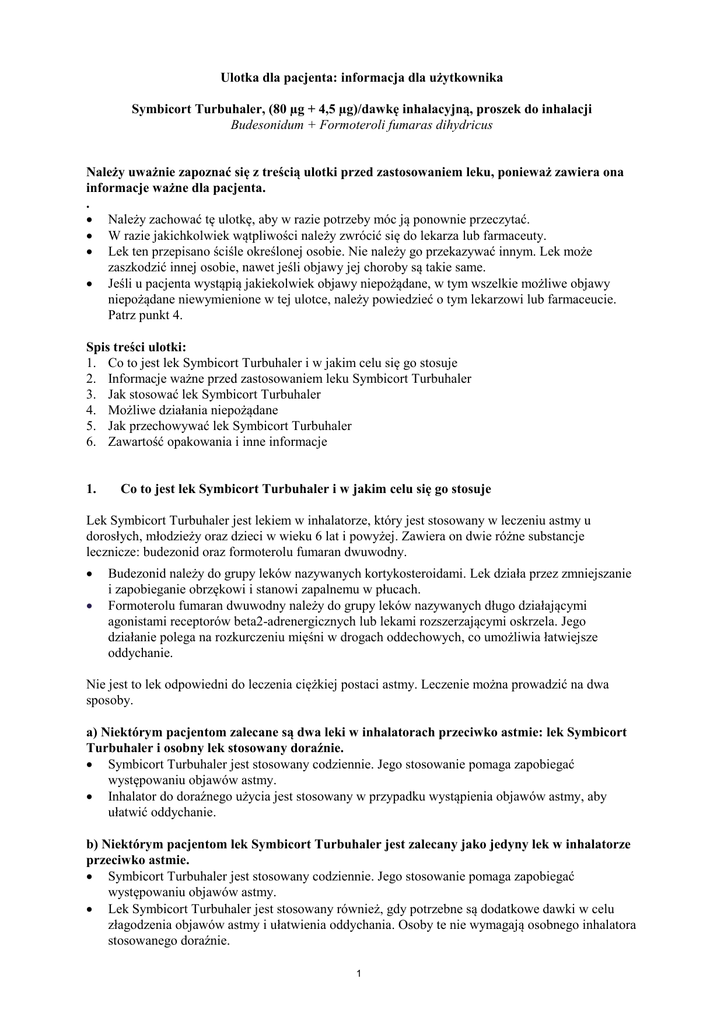 Ulotka dla pacjenta: informacja dla użytkownika Symbicort Turbuhaler, (80 µg + 4,5 µg)/dawkę inhalacyjną, proszek do inhalacji Budesonidum + Formoteroli fumaras dihydricus Należy uważnie zapoznać się z treścią ulotki przed zastosowaniem leku, ponieważ zawiera ona informacje ważne dla pacjenta. . Należy zachować tę ulotkę, aby w razie potrzeby móc ją ponownie przeczytać. W razie jakichkolwiek wątpliwości należy zwrócić się do lekarza lub farmaceuty. Lek ten przepisano ściśle określonej osobie. Nie należy go przekazywać innym. Lek może zaszkodzić innej osobie, nawet jeśli objawy jej choroby są takie same. Jeśli u pacjenta wystąpią jakiekolwiek objawy niepożądane, w tym wszelkie możliwe objawy niepożądane niewymienione w tej ulotce, należy powiedzieć o tym lekarzowi lub farmaceucie. Patrz punkt 4. Spis treści ulotki: 1. Co to jest lek Symbicort Turbuhaler i w jakim celu się go stosuje 2. Informacje ważne przed zastosowaniem leku Symbicort Turbuhaler 3. Jak stosować lek Symbicort Turbuhaler 4. Możliwe działania niepożądane 5. Jak przechowywać lek Symbicort Turbuhaler 6. Zawartość opakowania i inne informacje 1. Co to jest lek Symbicort Turbuhaler i w jakim celu się go stosuje Lek Symbicort Turbuhaler jest lekiem w inhalatorze, który jest stosowany w leczeniu astmy u dorosłych, młodzieży oraz dzieci w wieku 6 lat i powyżej. Zawiera on dwie różne substancje lecznicze: budezonid oraz formoterolu fumaran dwuwodny. Budezonid należy do grupy leków nazywanych kortykosteroidami. Lek działa przez zmniejszanie i zapobieganie obrzękowi i stanowi zapalnemu w płucach. Formoterolu fumaran dwuwodny należy do grupy leków nazywanych długo działającymi agonistami receptorów beta2-adrenergicznych lub lekami rozszerzającymi oskrzela. Jego działanie polega na rozkurczeniu mięśni w drogach oddechowych, co umożliwia łatwiejsze oddychanie. Nie jest to lek odpowiedni do leczenia ciężkiej postaci astmy. Leczenie można prowadzić na dwa sposoby. a) Niektórym pacjentom zalecane są dwa leki w inhalatorach przeciwko astmie: lek Symbicort Turbuhaler i osobny lek stosowany doraźnie. Symbicort Turbuhaler jest stosowany codziennie. Jego stosowanie pomaga zapobiegać występowaniu objawów astmy. Inhalator do doraźnego użycia jest stosowany w przypadku wystąpienia objawów astmy, aby ułatwić oddychanie. b) Niektórym pacjentom lek Symbicort Turbuhaler jest zalecany jako jedyny lek w inhalatorze przeciwko astmie. Symbicort Turbuhaler jest stosowany codziennie. Jego stosowanie pomaga zapobiegać występowaniu objawów astmy. Lek Symbicort Turbuhaler jest stosowany również, gdy potrzebne są dodatkowe dawki w celu złagodzenia objawów astmy i ułatwienia oddychania. Osoby te nie wymagają osobnego inhalatora stosowanego doraźnie. 1 2. Informacje ważne przed zastosowaniem leku Symbicort Turbuhaler Kiedy nie stosować leku Symbicort Turbuhaler: jeśli pacjent ma uczulenie na budezonid, formoterol lub na inny składnik tego leku (wymieniony w punkcie 6) – laktozę (która zawiera małe ilości białka mleka). Ostrzeżenia i środki ostrożności Przed rozpoczęciem stosowania leku Symbicort Turbuhaler, należy porozmawiać z lekarzem lub farmaceutą, jeśli u pacjenta występuje: cukrzyca. zakażenie płuc. wysokie ciśnienie tętnicze lub kiedykolwiek w przeszłości występowały choroby serca (w tym zaburzenia rytmu serca, bardzo szybka akcja serca, zwężenie tętnic lub niewydolność serca). zaburzenia czynności tarczycy lub nadnerczy. małe stężenie potasu we krwi. ciężkie zaburzenia czynności wątroby. Symbicort Turbuhaler a inne leki Należy powiedzieć lekarzowi lub farmaceucie o wszystkich lekach przyjmowanych przez pacjenta obecnie lub ostatnio, a także o lekach, które pacjent planuje stosować. Szczególnie należy poinformować lekarza lub farmaceutę o przyjmowaniu któregokolwiek z następujących leków: leki blokujące receptory β-adrenergiczne (takie jak atenolol lub propranolol, stosowane w leczeniu nadciśnienia tętniczego), również w postaci kropli do oczu (takie jak tymolol stosowany w leczeniu jaskry). leki stosowane w przypadku przyspieszonej lub niemiarowej czynności serca (takie jak chinidyna). leki, takie jak digoksyna, często stosowane w leczeniu niewydolności serca. leki moczopędne (takie jak furosemid), stosowane w leczeniu nadciśnienia tętniczego. steroidy stosowane doustnie (takie jak prednizolon). pochodne ksantyny (np. teofilina lub aminofilina). Są to leki często stosowane w leczeniu astmy. inne leki rozszerzające oskrzela (takie jak salbutamol). trójpierścieniowe leki przeciwdepresyjne (takie jak amitryptylina) oraz lek przeciwdepresyjny nefazodon. leki z grupy fenotiazyny (takie jak chloropromazyna i prochlorperazyna). leki nazywane inhibitorami proteazy HIV (np. rytonawir) stosowane w leczeniu zakażenia HIV. leki stosowane w zakażeniach (takie jak ketokonazol, itrakonazol, worykonazol, pozakonazol, klarytromycyna i telitromycyna). leki stosowane w chorobie Parkinsona (np. lewodopa). leki stosowane w chorobach tarczycy (np. lewotyroksyna). Osoba przyjmująca którykolwiek z wymienionych leków lub mająca wątpliwości co do stosowania innych leków, powinna skontaktować się z lekarzem lub farmaceutą przed zastosowaniem leku Symbicort Turbuhaler. Należy także poinformować lekarza lub farmaceutę o planowanym poddaniu się znieczuleniu ogólnemu w związku z zabiegiem chirurgicznym lub stomatologicznym. Ciąża, karmienie piersią i wpływ na płodność Jeżeli pacjentka jest w ciąży lub planuje ciążę, powinna powiedzieć o tym lekarzowi przed zastosowaniem leku Symbicort Turbuhaler; nie należy stosować leku Symbicort Turbuhaler bez zalecenia lekarza. 2 Jeżeli pacjentka leczona lekiem Symbicort Turbuhaler zajdzie w ciążę, nie powinna przerywać przyjmowania leku Symbicort Turbuhaler, lecz powinna niezwłocznie skontaktować się z lekarzem prowadzącym. Pa