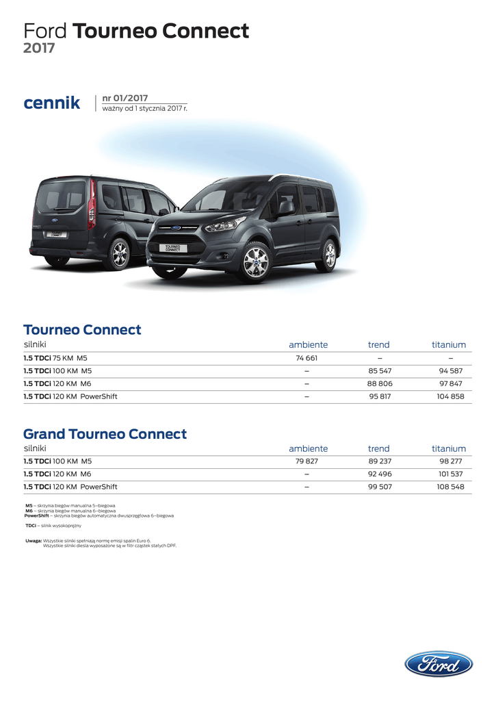 Ford Tourneo Connect 2017 cennik nr 01/2017 ważny od 1 stycznia 2017 r. Tourneo Connect silniki 1.5 TDCi 75 KM M5 ambiente trend titanium 74 661 – – 1.5 TDCi 100 KM M5 – 85 547 94 587 1.5 TDCi 120 KM M6 – 88 806 97 847 1.5 TDCi 120 KM PowerShift – 95 817 104 858 ambiente trend titanium 79 827 89 237 98 277 1.5 TDCi 120 KM M6 – 92 496 101 537 1.5 TDCi 120 KM PowerShift – 99 507 108 548 Grand Tourneo Connect silniki 1.5 TDCi 100 KM M5 M5 – skrzynia biegów manualna 5–biegowa M6 – skrzynia biegów manualna 6–biegowa PowerShift – skrzynia biegów automatyczna dwusprzęgłowa 6–biegowa TDCi – silnik wysokoprężny Uwaga: Wszystkie silniki spełniają normę emisji spalin Euro 6. Wszystkie silniki diesla wyposażone są w filtr cząstek stałych DPF. Ford Tourneo Connect 2017 bezpieczeństwo wyposażenie iente a mb System ABS – z układem kontroli trakcji s Sygnalizacja hamowania awaryjnego s Elektroniczny układ stabilizacji toru jazdy (ESP) s Hak holowniczy z systemem kontroli kołysania przyczepy (TSC) 1 476 Wspomaganie nagłego hamowania (EBA) s Tempomat – zawiera regulowany układ ograniczania prędkości (ASLD) 775 System wspomagania ruszania pod górę (HSA) s System monitorowania ciśnienia w ogumieniu s Poduszki powietrzne – poduszki czołowe dla kierowcy i pasażera z przodu s Poduszki powietrzne – poduszki boczne dla kierowcy i pasażera z przodu s Poduszki powietrzne – boczne kurtyny chroniące osoby w 1 i 2 rzędzie siedzeń (Tourneo Connect) s Poduszki powietrzne – boczne kurtyny chroniące osoby w 1, 2 i 3 rzędzie siedzeń (Grand Tourneo Connect) s System zapobiegania kolizjom przy niskich prędkościach, zawiera: automatyczne światła mijania, automatyczne wycieraczki, elektrycznie ogrzewaną przednią szybę, reflektory z opóźnionym wyłączaniem (Follow me home), automatycznie ściemniające się lusterko wsteczne 2 054 Przednie światła przeciwmgielne – Przednie światła przeciwmgielne ze statycznym doświetlaniem zakrętów p/1 538 System bezkorkowego wlewu paliwa Ford Easy Fuel s tren d titan ium s s s 1 476 s 775 s s s s s s s s 1 476 s s s s s s s s s 1 562 s 369 s s – s s s s p s 861 p – s – s – s s s 2 460 – s p p/2 337 s s 3 444 – s s s s 2 460 – s s s s s 3 198 s 1 415 s 2 214 3 567 s 3 567 s/ 1 538 s/ 1 538 984 984 984 1 230 s 1 230 s 1 230 s s s s komfort Komputer pokładowy s Komputer pokładowy - kolorowy wyświetlacz między zegarami (standard z w pakiecie z radiem z systemem nawigacji) p Klimatyzacja manualna 4 674 Klimatyzacja – elektroniczna dwustrefowa, z automatyczną regulacją temperatury (DEATC) – Tylna klimatyzacja (dostępna tylko dla Grand Tourneo Connect 1.5 TDCi 100 KM M5; niedostępna z pakietem ECO) – Szyby – przednie, sterowane elektrycznie s Szyby – przednie, sterowane elektrycznie z opuszczaniem i zamykaniem za jednym przyciśnięciem – Szyby – tylne, sterowane elektrycznie 873 Fotel kierowcy – regulacja podparcia odcinka lędźwiowego kręgosłupa – Fotele tylne – składane w proporcji 60:40 s Fotele tylne – 3 rząd siedzeń (tylko Grand Tourneo) 2 460 Fotel kierowcy – z regulacją przesuwu i pochylenia oparcia s Fotel kierowcy – z regulacją przesuwu, wysokości i pochylenia oparcia – Lusterko do obserwowania dzieci (dostępne w pakiecie z alarmem Thatcham) p Lusterko wsteczne – automatycznie ściemniające się (dostępne w pakiecie z automatycznymi światłami) p/2 091 Ford Eco mode (system informowania o ekonomice jazdy) – Oświetlenie w kabinie – lampka w podsufitce oraz 2 lampki do czytania – Kamera cofania z obrazem wyświetlanym w lusterku wstecznym zawiera: elektrochromatyczne lusterko wsteczne, czujniki parkowania – tył, elektrycznie ogrzewaną przednią szybę i lusterka boczne 3 690 Podwójny uchwyt na kubki z przodu s Dach panoramiczny nieotwierany – z roletą przeciwsłoneczną sterowaną elektrycznie oraz konsolą dachową z uchwytem na okulary i lusterkiem do obserwowania dzieci (zawiera relingi dachowe; niedostępny ze schowkami podsufitowymi nad 2-gim rzędem i pionową siatką oddzielającą przestrzeń bagażową) – Programowana nagrzewnica spalinowa 3 567 Pakiet ECO, zawiera Auto-Stop-Start, aktywną żaluzję kraty wlotu powietrza, inteligentne ładowanie regeneracyjne. (Niedostępny z tylną klimatyzacją, standard z silnikiem 1.5 TDCi 120 KM i z automatyczną skrzynią biegów PowerShift) s/ 1 538 zabezpieczenia Alarm – obwodowy (zawiera podwójne ryglowanie) Alarm Thatcham (zawiera podwójne ryglowanie drzwi oraz 2 kluczyki z pilotem zdalnego sterowania. W wersji Trend dodatkowo zawiera półkę podsufitową z przodu z lusterkiem do obserwowania dzieci i schowkiem na okulary (standard w Titanium) Centralny zamek – sterowany pilotem Zamki drzwi – samoczynne zaryglowanie (jeśli w ciągu 45 sek. po odryglowaniu nie zostały otwarte żadne drzwi) s – wyposażenie standardowe – – opcja niedostępna p – opcja dostępna w pakiecie Ford Tourneo Connect 2017 stylizacja wyposażenie iente a mb Lakier metalizowany: Deep Impact Blue, Mica Shadow Black, Moondust Silver, Magnetic Lakier metalizowany: Solar, Metalicious, Guard Przyciemniane szyby w tylnej części nadwozia Koło zapasowe 16" obręcze z oponami 205/60 R16 i kołpakami typu Ambiente 16" obręcze z oponami 205/60 R16 i kołpakami typu Trend 16" obręcze z lekkiego stopu, 5–ramienne z oponami 205/60 R16 16" obręcze Premium z lekkiego stopu, 5–ramienne z oponami 205/60 R16 w kolorze srebrnym 17" obręcze z lekkiego stopu 10–ramienne z oponami 205/55 R17 17" obręcze Premium z lekkiego stopu, 5–ramienne z oponami 205/60 R17 w kolorze czarnym tren d titan ium 1415 1 784 – 492 s – – – – – 1 415 1 784 615 492 – s 1 968 2 460 – 3 321 1 415 1 784 s 492 – – s 492 861 1 353 185 – – 1 476 s – 3 542 2 066 s 3 936 2 460 394 – 8 303 6 335 1 230 – 1 230 2 460 s 1 230 – 123 – – 1 230 492 – – 738 – 123 s 369 62 1 230 