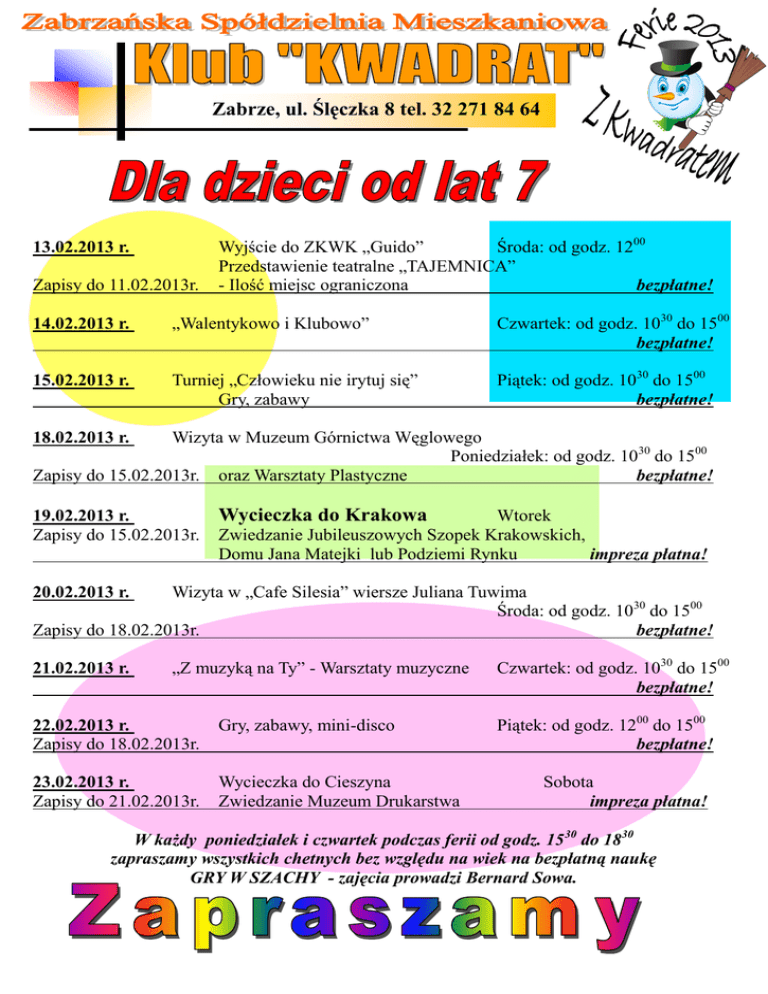 Zabrze, ul. Ślęczka 8 tel. 32 271 84 64 13.02.2013 r. Zapisy do 11.02.2013r. Wyjście do ZKWK „Guido” Środa: od godz. 1200 Przedstawienie teatralne „TAJEMNICA” - Ilość miejsc ograniczona bezpłatne! 14.02.2013 r. „Walentykowo i Klubowo” Czwartek: od godz. 1030 do 1500 bezpłatne! 15.02.2013 r. Turniej „Człowieku nie irytuj się” Gry, zabawy Piątek: od godz. 1030 do 1500 bezpłatne! 18.02.2013 r. Wizyta w Muzeum Górnictwa Węglowego Poniedziałek: od godz. 1030 do 1500 Zapisy do 15.02.2013r. oraz Warsztaty Plastyczne bezpłatne! 19.02.2013 r. Zapisy do 15.02.2013r. Wycieczka do Krakowa Wtorek Zwiedzanie Jubileuszowych Szopek Krakowskich, Domu Jana Matejki lub Podziemi Rynku impreza płatna! 20.02.2013 r. Wizyta w „Cafe Silesia” wiersze Juliana Tuwima Środa: od godz. 1030 do 1500 Zapisy do 18.02.2013r. bezpłatne! 21.02.2013 r. „Z muzyką na Ty” - Warsztaty muzyczne 22.02.2013 r. Zapisy do 18.02.2013r. Gry, zabawy, mini-disco 23.02.2013 r. Zapisy do 21.02.2013r. Wycieczka do Cieszyna Zwiedzanie Muzeum Drukarstwa Czwartek: od godz. 1030 do 1500 bezpłatne! Piątek: od godz. 1200 do 1500 bezpłatne! Sobota impreza płatna! W każdy poniedziałek i czwartek podczas ferii od godz. 15 30 do 1830 zapraszamy wszystkich chetnych bez względu na wiek na bezpłatną naukę GRY W SZACHY - zajęcia prowadzi Bernard Sowa.