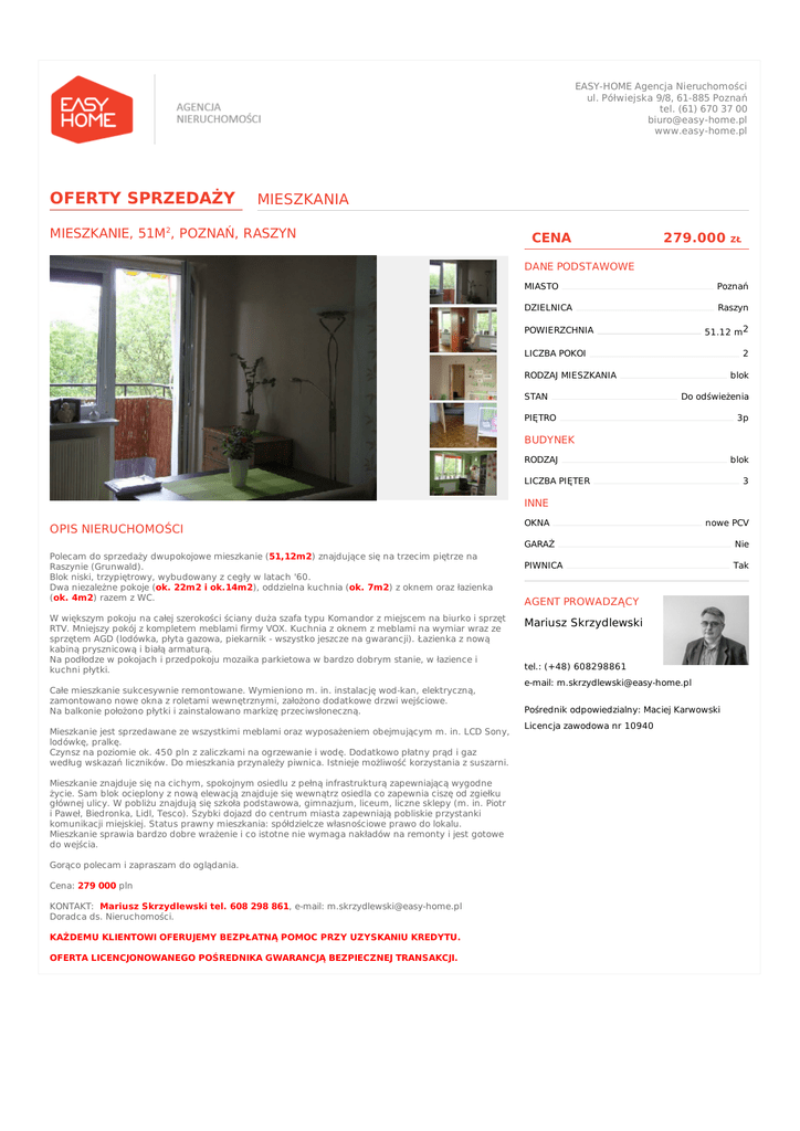 EASY-HOME Agencja Nieruchomości ul. Półwiejska 9/8, 61-885 Poznań tel. (61) 670 37 00 [email protected] www.easy-home.pl OFERTY SPRZEDAŻY MIESZKANIA MIESZKANIE, 51M 2, POZNAŃ, RASZYN CENA 279.000 ZŁ DANE PODSTAWOWE MIASTO Poznań DZIELNICA Raszyn 51.12 m 2 POWIERZCHNIA LICZBA POKOI 2 RODZAJ MIESZKANIA STAN blok Do odświeżenia PIĘTRO 3p BUDYNEK RODZAJ blok LICZBA PIĘTER 3 INNE OPIS NIERUCHOMOŚCI Polecam do sprzedaży dwupokojowe mieszkanie (51,12m2) znajdujące się na trzecim piętrze na Raszynie (Grunwald). Blok niski, trzypiętrowy, wybudowany z cegły w latach '60. Dwa niezależne pokoje (ok. 22m2 i ok.14m2), oddzielna kuchnia (ok. 7m2) z oknem oraz łazienka (ok. 4m2) razem z WC. W większym pokoju na całej szerokości ściany duża szafa typu Komandor z miejscem na biurko i sprzęt RTV. Mniejszy pokój z kompletem meblami firmy VOX. Kuchnia z oknem z meblami na wymiar wraz ze sprzętem AGD (lodówka, płyta gazowa, piekarnik - wszystko jeszcze na gwarancji). Łazienka z nową kabiną prysznicową i białą armaturą. Na podłodze w pokojach i przedpokoju mozaika parkietowa w bardzo dobrym stanie, w łazience i kuchni płytki. Całe mieszkanie sukcesywnie remontowane. Wymieniono m. in. instalację wod-kan, elektryczną, zamontowano nowe okna z roletami wewnętrznymi, założono dodatkowe drzwi wejściowe. Na balkonie położono płytki i zainstalowano markizę przeciwsłoneczną. Mieszkanie jest sprzedawane ze wszystkimi meblami oraz wyposażeniem obejmującym m. in. LCD Sony, lodówkę, pralkę. Czynsz na poziomie ok. 450 pln z zaliczkami na ogrzewanie i wodę. Dodatkowo płatny prąd i gaz według wskazań liczników. Do mieszkania przynależy piwnica. Istnieje możliwość korzystania z suszarni. Mieszkanie znajduje się na cichym, spokojnym osiedlu z pełną infrastrukturą zapewniającą wygodne życie. Sam blok ocieplony z nową elewacją znajduje się wewnątrz osiedla co zapewnia ciszę od zgiełku głównej ulicy. W pobliżu znajdują się szkoła podstawowa, gimnazjum, liceum, liczne sklepy (m. in. Piotr i Paweł, Biedronka, Lidl, Tesco). Szybki dojazd do centrum miasta zapewniają pobliskie przystanki komunikacji miejskiej. Status prawny mieszkania: spółdzielcze własnościowe prawo do lokalu. Mieszkanie sprawia bardzo dobre wrażenie i co istotne nie wymaga nakładów na remonty i jest gotowe do wejścia. Gorąco polecam i zapraszam do oglądania. Cena: 279 000 pln KONTAKT: Mariusz Skrzydlewski tel. 608 298 861, e-mail: [email protected] Doradca ds. Nieruchomości. KAŻDEMU KLIENTOWI OFERUJEMY BEZPŁATNĄ POMOC PRZY UZYSKANIU KREDYTU. OFERTA LICENCJONOWANEGO POŚREDNIKA GWARANCJĄ BEZPIECZNEJ TRANSAKCJI. OKNA nowe PCV GARAŻ Nie PIWNICA Tak AGENT PROWADZĄCY Mariusz Skrzydlewski tel.: (+48) 608298861 e-mail: [email protected] Pośrednik odpowiedzialny: Maciej Karwowski Licencja zawodowa nr 10940