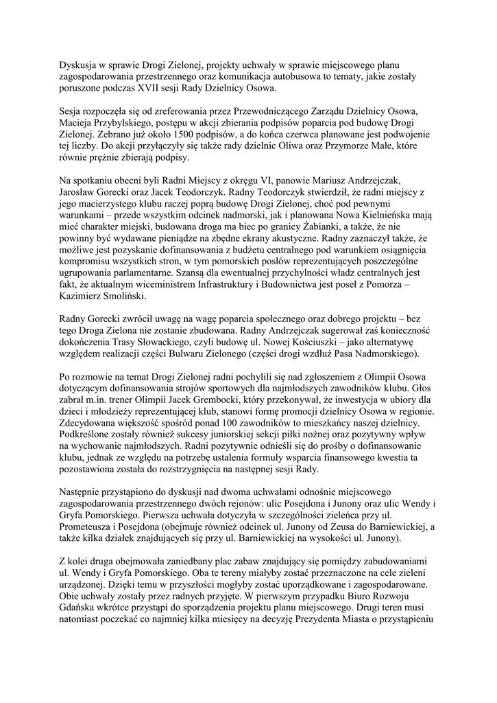 Dyskusja w sprawie Drogi Zielonej, projekty uchwały w sprawie miejscowego planu zagospodarowania przestrzennego oraz komunikacja autobusowa to tematy, jakie zostały poruszone podczas XVII sesji Rady Dzielnicy Osowa. Sesja rozpoczęła się od zreferowania przez Przewodniczącego Zarządu Dzielnicy Osowa, Macieja Przybylskiego, postępu w akcji zbierania podpisów poparcia pod budowę Drogi Zielonej. Zebrano już około 1500 podpisów, a do końca czerwca planowane jest podwojenie tej liczby. Do akcji przyłączyły się także rady dzielnic Oliwa oraz Przymorze Małe, które równie prężnie zbierają podpisy. Na spotkaniu obecni byli Radni Miejscy z okręgu VI, panowie Mariusz Andrzejczak, Jarosław Gorecki oraz Jacek Teodorczyk. Radny Teodorczyk stwierdził, że radni miejscy z jego macierzystego klubu raczej poprą budowę Drogi Zielonej, choć pod pewnymi warunkami – przede wszystkim odcinek nadmorski, jak i planowana Nowa Kielnieńska mają mieć charakter miejski, budowana droga ma biec po granicy Żabianki, a także, że nie powinny być wydawane pieniądze na zbędne ekrany akustyczne. Radny zaznaczył także, że możliwe jest pozyskanie dofinansowania z budżetu centralnego pod warunkiem osiągnięcia kompromisu wszystkich stron, w tym pomorskich posłów reprezentujących poszczególne ugrupowania parlamentarne. Szansą dla ewentualnej przychylności władz centralnych jest fakt, że aktualnym wiceministrem Infrastruktury i Budownictwa jest poseł z Pomorza – Kazimierz Smoliński. Radny Gorecki zwrócił uwagę na wagę poparcia społecznego oraz dobrego projektu – bez tego Droga Zielona nie zostanie zbudowana. Radny Andrzejczak sugerował zaś konieczność dokończenia Trasy Słowackiego, czyli budowę ul. Nowej Kościuszki – jako alternatywę względem realizacji części Bulwaru Zielonego (części drogi wzdłuż Pasa Nadmorskiego). Po rozmowie na temat Drogi Zielonej radni pochylili się nad zgłoszeniem z Olimpii Osowa dotyczącym dofinansowania strojów sportowych dla najmłodszych zawodników klubu. Głos zabrał m.in. trener Olimpii Jacek Grembocki, który przekonywał, że inwestycja w ubiory dla dzieci i młodzieży reprezentującej klub, stanowi formę promocji dzielnicy Osowa w regionie. Zdecydowana większość spośród ponad 100 zawodników to mieszkańcy naszej dzielnicy. Podkreślone zostały również sukcesy juniorskiej sekcji piłki nożnej oraz pozytywny wpływ na wychowanie najmłodszych. Radni pozytywnie odnieśli się do prośby o dofinansowanie klubu, jednak ze względu na potrzebę ustalenia formuły wsparcia finansowego kwestia ta pozostawiona została do rozstrzygnięcia na następnej sesji Rady. Następnie przystąpiono do dyskusji nad dwoma uchwałami odnośnie miejscowego zagospodarowania przestrzennego dwóch rejonów: ulic Posejdona i Junony oraz ulic Wendy i Gryfa Pomorskiego. Pierwsza uchwała dotyczyła w szczególności zieleńca przy ul. Prometeusza i Posejdona (obejmuje również odcinek ul. Junony od Zeusa do Barniewickiej, a także kilka działek znajdujących się przy ul. Barniewickiej na wysokości ul. Junony). Z kolei druga obejmowała zaniedbany plac zabaw znajdujący się pomiędzy zabudowaniami ul. Wendy i Gryfa Pomorskiego. Oba te tereny miałyby zostać przeznaczone na cele zieleni urządzonej. Dzięki temu w przyszłości mogłyby zostać uporządkowane i zagospodarowane. Obie uchwały zostały przez radnych przyjęte. W pierwszym przypadku Biuro Rozwoju Gdańska wkrótce przystąpi do sporządzenia projektu planu miejscowego. Drugi teren musi natomiast poczekać co najmniej kilka miesięcy na decyzję Prezydenta Miasta o przystąpieniu do sporządzenia takiego projektu. Do zagospodarowania placu zabaw przy ul. Wendy zatem jeszcze długa droga... Ostatnią kwestią poruszoną przez radnych była sprawa komunikacji miejskiej w naszej dzielnicy. Radni wyszli z propozycją utworzenia nowej linii dzielnicowej o numerze 279 na trasie: Osowa PKP – Nowy Świat – Owczarnia – Wodnika – Homera – Galaktyczna – Kielnieńska – Wodnika – Jednorożca – Koziorożca – Niedziałkowskiego – Barniewicka – Osowa PKP Autobus kursowałby jedynie w jedną stronę, aby ograniczyć potrzebną pulę wozokilometrów i urealnić uruchomienie nowej linii. Dodatkowo radni zagłosowali za tym, aby wprowadzić w życie zmianę trasy linii 179 (zamiast z Oliwy do Owczarni – to z Oliwy do Osowej PKP wzdłuż ul. Junony). Zasugerowano także utworzenie dwóch nowych przystanków autobusowych: Delfina (przy ulicy Jednorożca, w zatoczkach), a także Oriona (przy skrzyżowaniu ulic Zeusa i Nowy Świat). Ponadto Zarządowi udało się przekonać ZDiZ do decyzji o remoncie nawierzchni ul. Komandorskiej, która od dłuższego czasu znajdowała się w opłakanym stanie. Dodatkowo – w efekcie niedawnej wizyty Prezydenta Adamowicza w Osowej – zrealizowany został fragment chodnika wzdłuż ul. Kielnieńskiej od strony Chwaszczyna. Niedługo ruszy również przebudowa chodnika na ul. Niedziałkowskiego od ul. Zeusa do ul. Balcerskiego. Następna sesja została wyznaczona na 28 czerwca, na godzinę 18. Bartosz Stefański – Radny Dzielnicy Osowa Karol Ważny – Przewodniczący Rady Dzielnicy Osowa