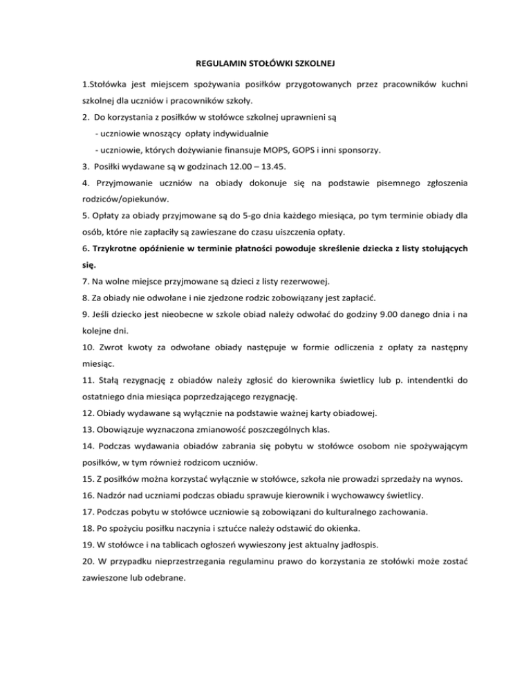 REGULAMIN STOŁÓWKI SZKOLNEJ 1.Stołówka jest miejscem spożywania posiłków przygotowanych przez pracowników kuchni szkolnej dla uczniów i pracowników szkoły. 2. Do korzystania z posiłków w stołówce szkolnej uprawnieni są - uczniowie wnoszący opłaty indywidualnie - uczniowie, których dożywianie finansuje MOPS, GOPS i inni sponsorzy. 3. Posiłki wydawane są w godzinach 12.00 – 13.45. 4. Przyjmowanie uczniów na obiady dokonuje się na podstawie pisemnego zgłoszenia rodziców/opiekunów. 5. Opłaty za obiady przyjmowane są do 5-go dnia każdego miesiąca, po tym terminie obiady dla osób, które nie zapłaciły są zawieszane do czasu uiszczenia opłaty. 6. Trzykrotne opóźnienie w terminie płatności powoduje skreślenie dziecka z listy stołujących się. 7. Na wolne miejsce przyjmowane są dzieci z listy rezerwowej. 8. Za obiady nie odwołane i nie zjedzone rodzic zobowiązany jest zapłacić. 9. Jeśli dziecko jest nieobecne w szkole obiad należy odwołać do godziny 9.00 danego dnia i na kolejne dni. 10. Zwrot kwoty za odwołane obiady następuje w formie odliczenia z opłaty za następny miesiąc. 11. Stałą rezygnację z obiadów należy zgłosić do kierownika świetlicy lub p. intendentki do ostatniego dnia miesiąca poprzedzającego rezygnację. 12. Obiady wydawane są wyłącznie na podstawie ważnej karty obiadowej. 13. Obowiązuje wyznaczona zmianowość poszczególnych klas. 14. Podczas wydawania obiadów zabrania się pobytu w stołówce osobom nie spożywającym posiłków, w tym również rodzicom uczniów. 15. Z posiłków można korzystać wyłącznie w stołówce, szkoła nie prowadzi sprzedaży na wynos. 16. Nadzór nad uczniami podczas obiadu sprawuje kierownik i wychowawcy świetlicy. 17. Podczas pobytu w stołówce uczniowie są zobowiązani do kulturalnego zachowania. 18. Po spożyciu posiłku naczynia i sztućce należy odstawić do okienka. 19. W stołówce i na tablicach ogłoszeń wywieszony jest aktualny jadłospis. 20. W przypadku nieprzestrzegania regulaminu prawo do korzystania ze stołówki może zostać zawieszone lub odebrane.
