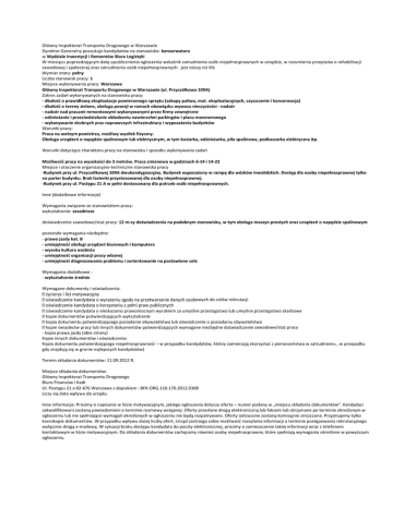 Główny Inspektorat Transportu Drogowego w Warszawie Dyrektor Generalny poszukuje kandydatów na stanowisko: konserwatora w Wydziale Inwestycji i Remontów Biura Logistyki W miesiącu poprzedzającym datę upublicznienia ogłoszenia wskaźnik zatrudnienia osób niepełnosprawnych w urzędzie, w rozumieniu przepisów o rehabilitacji zawodowej i społecznej oraz zatrudnieniu osób niepełnosprawnych: jest niższy niż 6% Wymiar etatu: pełny Liczba stanowisk pracy: 1 Miejsce wykonywania pracy: Warszawa Główny Inspektorat Transportu Drogowego w Warszawie (ul. Przyczółkowa 109A) Zakres zadań wykonywanych na stanowisku pracy: - dbałość o prawidłową eksploatacje powierzonego sprzętu (zakupy paliwa, mat. eksploatacyjnych, czyszczenie i konserwacja) - dbałość o tereny zielone, obsługa posesji w ramach obowiązku wywozu nieczystości - nadzór - nadzór nad pracami remontowymi wykonywanymi przez firmy zewnętrzne - odśnieżanie i przeciwdziałanie oblodzeniu nawierzchni parkingów i placu manewrowego - wykonywanie drobnych prac naprawczych infrastruktury i wyposażenia budynków Warunki pracy: Praca na wolnym powietrzu, możliwy wysiłek fizyczny. Obsługa urządzeń o napędzie spalinowym lub elektrycznym, w tym kosiarka, odśnieżarka, piła spalinowa, podkaszarka elektryczna itp. Warunki dotyczące charakteru pracy na stanowisku i sposobu wykonywania zadań Możliwość pracy na wysokości do 3 metrów. Praca zmianowa w godzinach 6-14 i 14-22 Miejsce i otoczenie organizacyjno-techniczne stanowiska pracy -Budynek przy ul. Przyczółkowej 109A dwukondygnacyjny. Budynek wyposażony w rampę dla wózków inwalidzkich. Dostęp dla osoby niepełnosprawnej tylko na parter budynku. Brak łazienki przystosowanej dla osoby niepełnosprawnej. -Budynek przy ul. Postępu 21 A w pełni dostosowany dla potrzeb osób niepełnosprawnych. Inne (dodatkowe informacje) Wymagania związane ze stanowiskiem pracy: wykształcenie: zasadnicze doświadczenie zawodowe/staż pracy: 12 m-cy doświadczenia na podobnym stanowisku, w tym obsługa maszyn prostych oraz urządzeń o napędzie spalinowym pozostałe wymagania niezbędne: - prawo jazdy kat. B - umiejętność obsługi urządzeń biurowych i komputera - wysoka kultura osobista - umiejętność organizacji pracy własnej - umiejętność diagnozowania problemu i zorientowanie na postawione cele Wymagania dodatkowe : - wykształcenie średnie Wymagane dokumenty i oświadczenia: owych do celów rekrutacji e zawodowe/staż pracy - kopia prawa jazdy (obie strony) Kopie innych dokumentów i oświadczenia: Kopia dokumentu potwierdzającego niepełnosprawność – w przypadku kandydatów, którzy zamierzają skorzystać z pierwszeństwa w zatrudnieniu , w przepadku gdy znajdują się w gronie najlepszych kandydatów) Termin składania dokumentów: 11.09.2012 R. Miejsce składania dokumentów: Główny Inspektorat Transportu Drogowego Biuro Finansów i Kadr Ul. Postępu 21 a 02-676 Warszawa z dopiskiem : BFK-ORG.110.170.2012.0308 Liczy się data wpływu do urzędu. Inne informacje: Prosimy o napisanie w liście motywacyjnym, jakiego ogłoszenia dotyczy oferta – numer podany w „miejscu składania dokumentów”. Kandydaci zakwalifikowani zostaną powiadomieni o terminie rozmowy wstępnej. Oferty przesłane drogą elektroniczną lub faksem lub otrzymane po terminie określonym w ogłoszeniu lub nie spełniające wymagań określonych w ogłoszeniu nie będą rozpatrywane. Oferty odrzucone zostaną komisyjnie zniszczone. Przyjmujemy tylko kserokopie dokumentów. W przypadku wpływu dużej liczby ofert, Urząd zastrzega sobie możliwość rozsyłania informacji o terminie postępowania rekrutacyjnego wyłącznie drogą e-mailową. W sytuacji braku dostępu kandydata do poczty elektronicznej, prosimy o zamieszczenie takiej informacji wraz z telefonem kontaktowym w liście motywacyjnym. Do składania dokumentów zachęcamy również osoby niepełnosprawne, które spełniają wymagania określone w powyższym ogłoszeniu.