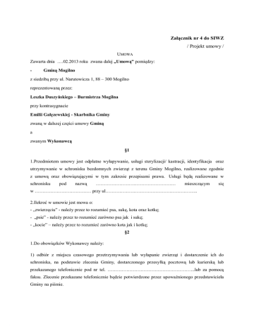 Załącznik nr 4 do SIWZ / Projekt umowy / UMOWA Zawarta dnia ….02.2013 roku zwana dalej „Umową” pomiędzy: - Gminą Mogilno z siedzibą przy ul. Narutowicza 1, 88 – 300 Mogilno reprezentowaną przez: Leszka Duszyńskiego – Burmistrza Mogilna przy kontrasygnacie Emilii Gałęzewskiej - Skarbnika Gminy zwaną w dalszej części umowy Gminą a zwanym Wykonawcą §1 1.Przedmiotem umowy jest odpłatne wyłapywanie, usługi sterylizacji/ kastracji, identyfikacja oraz utrzymywanie w schronisku bezdomnych zwierząt z terenu Gminy Mogilno, realizowane zgodnie z umową oraz obowiązującymi w tym zakresie przepisami prawa. Usługi będą realizowane w schronisku pod nazwą …………………………………………… mieszczącym się w ……………………………… przy ul………………………………………………….. 2.Ilekroć w umowie jest mowa o: - „zwierzęciu” - należy przez to rozumieć psa, sukę, kota oraz kotkę; - „psie” - należy przez to rozumieć zarówno psa jak i sukę; - „kocie” – należy przez to rozumieć zarówno kota jak i kotkę; §2 1.Do obowiązków Wykonawcy należy: 1) odbiór z miejsca czasowego przetrzymywania lub wyłapanie zwierząt i dostarczenie ich do schroniska, na podstawie zlecenia Gminy, dostarczonego przesyłką pocztową lub kurierską lub przekazanego telefonicznie pod nr tel. ………………………………………………..lub za pomocą faksu. Zlecenie przekazane telefonicznie będzie potwierdzone przez upoważnionego przedstawiciela Gminy na piśmie. 3) Podjecie próby odłowienia zwierzęcia nie później niż w ciągu 3 dni od zgłoszenia, a w przypadku zwierząt agresywnych - w tym samym dniu (jeżeli zgłoszenie zostanie przekazane do godziny 12) – w dniu następnym (jeśli zgłoszenie odłowienia zwierzęcia agresywnego zostanie przekazane po godzinie 12), 4) zapewnienie odłowionemu zwierzęciu miejsca w schronisku oraz opieki weterynaryjnej, 5) założenie dla każdego umieszczonego w schronisku zwierzęcia karty informacyjnej oraz prowadzenie dokumentacji przetrzymywanych zwierząt oraz oznakowania umożliwiającego ich identyfikację, 6) dokonywanie identyfikacji każdego psa, umieszczonego w schronisku poprzez wszczepienie mikrochipa, 7) poddanie każdego odłowionego zwierzęcia zabiegowi – odpowiednio - kastracji bądź sterylizacji, w terminie możliwie jak najszybszym od czasu umieszczenia zwierzęcia w schronisku. W przypadku, gdy zwierzę zostanie adoptowane, a nie zostało poddane zabiegowi kastracji bądź sterylizacji (dotyczy to zwierząt, które nie osiągnęły dojrzałości płciowej) Wykonawca obowiązany jest do zamieszczenia w umowie adopcyjnej z właścicielem zwierzęcia zapisu o konieczności sterylizacji/ kastracji w ściśle określonym terminie. Zabieg może być wykonany tylko przez lekarza weterynarii bądź lecznicę wykonującą zabiegi dla Wykonawcy, 8) przeprowadzenie piętnastodniowej kwarantanny dla nowo przybyłych zwierząt, 9) informowanie Gminy co miesiąc, w sprawozdaniu załączonym do wystawionej faktury, o każdym przypadku przyjęcia zwierzęcia do schroniska, upadku, eutanazji, wykonania zabiegu sterylizacji/kastracji oraz o zabiegach sterylizacji/kastracji, które będą wykonane w terminie późniejszym po wydaniu psa ze schroniska ( w okolicznościach, o których mowa w ust.7 § 2 umowy), identyfikacji oraz adopcji zwierzęcia, 10) wykonywanie usługi weterynaryjnej usypiania ślepych miotów (zgodnie z art. 6 ustawy o ochronie zwierząt) urodzonych przez zwierzęta wyłapane przez Wykonawcę z terenu Gminy Mogilno, 11) poszukiwanie nowych właścicieli dla zwierząt odłowionych z terenu Gminu Mogilno, umieszczonych w schronisku i ich przekazywania nowym właścicielom na podstawie umowy adopcyjnej, 12) zapewnienie w każdym miesiącu 30 miejsc w schronisku dla zwierząt z terenu Gminy Mogilno, 13) odebranie w terminie jednego miesiąca od podpisania umowy (wraz z kartami ewidencyjnymi), zwierząt pochodzących z terenu Gminy Mogilno, przebywających w ……………………………………………………………………………….. * (zapis nie dotyczy przypadku, gdy ten sam Wykonawca świadczył dla Gminy Mogilno usługi utrzymywania zwierząt w schronisku, w okresie bezpośrednio poprzedzającym podpisanie niniejszej umowy) 2.Odłowione zwierzęta na okres kwarantanny, o której mowa w § 2 ust.1 pkt 8 będą trafiały do miejsca czasowego przetrzymywania, zatwierdzonego przez właściwego terytorialnie Powiatowego Lekarza Weterynarii mieszczącego się w ………………………., przy ul. ……………………………….., a następnie będą przewożone przez Wykonawcę do schroniska dla zwierząt w ………………………………………… przy ul……………………………………... §3 1.Wykonawca zabezpiecza w czasie wyłapywania i transportu zwierząt korzystanie z urządzeń i środków, które nie stwarzają zagrożenia życia i zdrowia oraz cierpienia zwierząt. 2.Wykonawca do realizacji usługi odłowienia będzie używał wyłącznie sprzęt dopuszczonego do stosowania przez obowiązujące przepisy prawa – w szczególności: a. Aplikatorz pneumatycznego „Palmer” b. chwytaków c. sieci weterynaryjnych d. klatek żywołapek §4 Wykonawca udostępni Gminie dane osób, które dokonały adopcji zwierzęcia. Powyższe dane podlegają ochronie. Gmina może je przetwarzać i udostępniać jedynie w przypadkach ściśle przepisanych prawem i ponosi odpowiedzialność z tytułu niezgodnego z prawem przetwarzania danych. §5 1.Zlecając wyłapanie zwierzęcia Gmina zobowiązana jest precyzyjnie wskazać miejsce, gdzie dane zwierzę przebywa, przekazać opis zwierzęcia oraz inne informacje przydatne do wykonania zlecenia. 2.Gmina dołoży staranności aby gromadzone i przekazywane Wykonawcy informacje były rzetelne i odpowiadały prawdzie, w szczególności co do rzeczywistej bezdomności zw