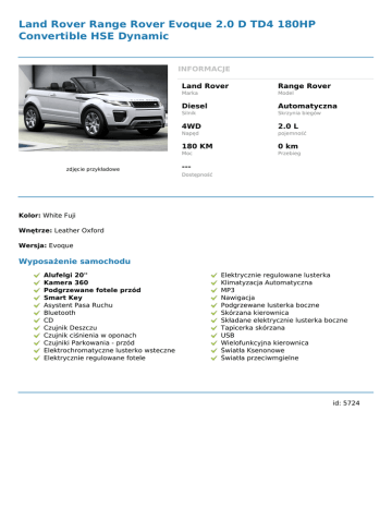 Land Rover Range Rover Evoque 2.0 D TD4 180HP Convertible HSE Dynamic INFORMACJE zdjęcie przykładowe Land Rover Range Rover Marka Model Diesel Automatyczna Silnik Skrzynia biegów 4WD 2.0 L Napęd pojemność 180 KM 0 km Moc Przebieg --Dostępność Kolor: White Fuji Wnętrze: Leather Oxford Wersja: Evoque Wyposażenie samochodu Alufelgi 20'' Kamera 360 Podgrzewane fotele przód Smart Key Asystent Pasa Ruchu Bluetooth CD Czujnik Deszczu Czujnik ciśnienia w oponach Czujniki Parkowania - przód Elektrochromatyczne lusterko wsteczne Elektrycznie regulowane fotele Elektrycznie regulowane lusterka Klimatyzacja Automatyczna MP3 Nawigacja Podgrzewane lusterka boczne Skórzana kierownica Składane elektrycznie lusterka boczne Tapicerka skórzana USB Wielofunkcyjna kierownica Światła Ksenonowe Światła przeciwmgielne id: 5724 Powered by TCPDF (www.tcpdf.org)
