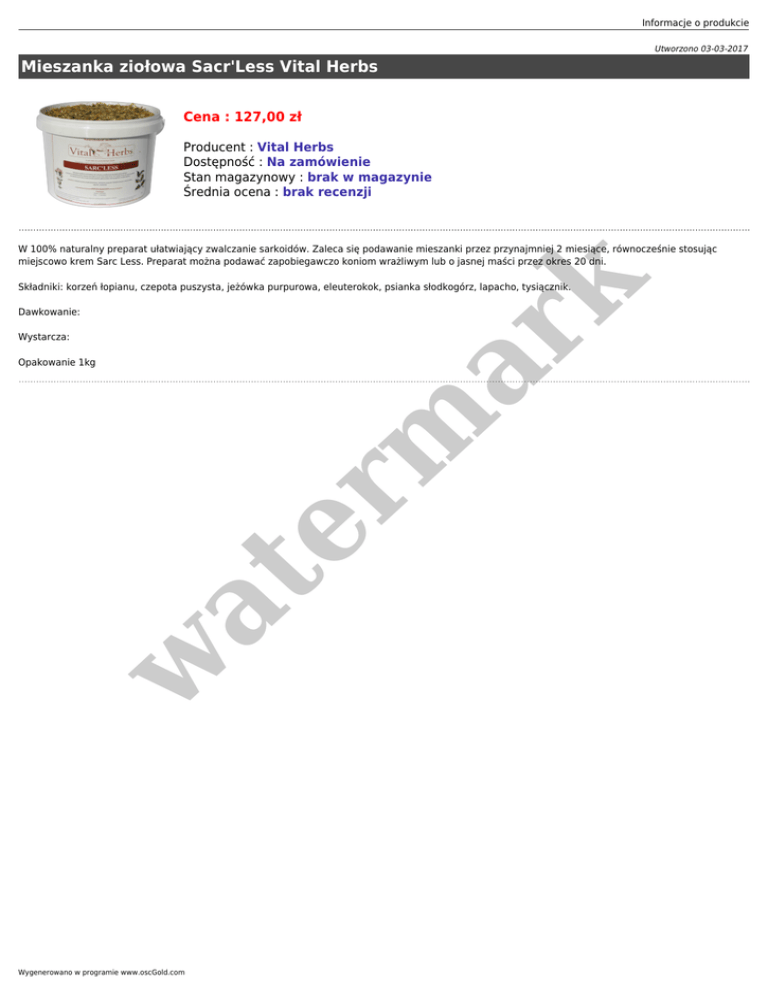 Informacje o produkcie Utworzono 03-03-2017 Mieszanka ziołowa Sacr'Less Vital Herbs Cena : 127,00 zł Producent : Vital Herbs Dostępność : Na zamówienie Stan magazynowy : brak w magazynie Średnia ocena : brak recenzji er m ar k W 100% naturalny preparat ułatwiający zwalczanie sarkoidów. Zaleca się podawanie mieszanki przez przynajmniej 2 miesiące, równocześnie stosując miejscowo krem Sarc Less. Preparat można podawać zapobiegawczo koniom wrażliwym lub o jasnej maści przez okres 20 dni. Składniki: korzeń łopianu, czepota puszysta, jeżówka purpurowa, eleuterokok, psianka słodkogórz, lapacho, tysiącznik. Dawkowanie: Wystarcza: w at Opakowanie 1kg Wygenerowano w programie www.oscGold.com