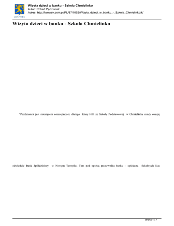 Wizyta dzieci w banku - Szkoła Chmielinko Autor: Robert Pędziwiatr Adres: http://lwowek.com.pl/PL/87/1052/Wizyta_dzieci_w_banku_-_Szkola_Chmielinko/k/ Wizyta dzieci w banku - Szkoła Chmielinko "Październik jest miesiącem oszczędności, dlatego klasy I-III ze Szkoły Podstawowej w Chmielinku miały okazję odwiedzić Bank Spółdzielczy w Nowym Tomyślu. Tam pod opieką pracownika banku – opiekuna Szkolnych Kas strona 1 / 7 Wizyta dzieci w banku - Szkoła Chmielinko Autor: Robert Pędziwiatr Adres: http://lwowek.com.pl/PL/87/1052/Wizyta_dzieci_w_banku_-_Szkola_Chmielinko/k/ Oszczędności zwiedziły bank, poznając jego różne tajemnice. Dzieci postanowiły poznać bank od środka, sprawdzić jak oszczędzają dorośli. Uczniowie zapoznali się z ofertą banku obejrzeli wszystkie stanowiska pracy oraz porozmawiali z pracownikami banku. Dzieci szczególnie zainteresowane były pracą i działaniem bankomatu i wpłatomatu. Uwagę zwróciły strona 2 / 7 Wizyta dzieci w banku - Szkoła Chmielinko Autor: Robert Pędziwiatr Adres: http://lwowek.com.pl/PL/87/1052/Wizyta_dzieci_w_banku_-_Szkola_Chmielinko/k/ też na wystrój Banku, jak również na jego wyposażenie, na które składają się nowoczesne systemy teleinformatyczne i urządzenia multimedialne. strona 3 / 7 Wizyta dzieci w banku - Szkoła Chmielinko Autor: Robert Pędziwiatr Adres: http://lwowek.com.pl/PL/87/1052/Wizyta_dzieci_w_banku_-_Szkola_Chmielinko/k/ Po powrocie do szkoły grupa zaangażowana w program SKO pod opieka p. Moniki Tanona i Iwony Heliasz przedstawiła program artystyczny pt,, Kto nie chce wiedzieć co to jest nędza, niech z Nami dziś oszczędza”. Uroczystość zakończyła się wręczeniem książeczek SKO i upominków kolejnym dzieciom, które dołączyły do grupy SKO. strona 4 / 7 Wizyta dzieci w banku - Szkoła Chmielinko Autor: Robert Pędziwiatr Adres: http://lwowek.com.pl/PL/87/1052/Wizyta_dzieci_w_banku_-_Szkola_Chmielinko/k/ Uczniowie mogli się przekonać jak fascynująca i ciekawa jest praca bankowca. strona 5 / 7 Wizyta dzieci w banku - Szkoła Chmielinko Autor: Robert Pędziwiatr Adres: http://lwowek.com.pl/PL/87/1052/Wizyta_dzieci_w_banku_-_Szkola_Chmielinko/k/ strona 6 / 7 Wizyta dzieci w banku - Szkoła Chmielinko Autor: Robert Pędziwiatr Adres: http://lwowek.com.pl/PL/87/1052/Wizyta_dzieci_w_banku_-_Szkola_Chmielinko/k/ strona 7 / 7 Powered by TCPDF (www.tcpdf.org)