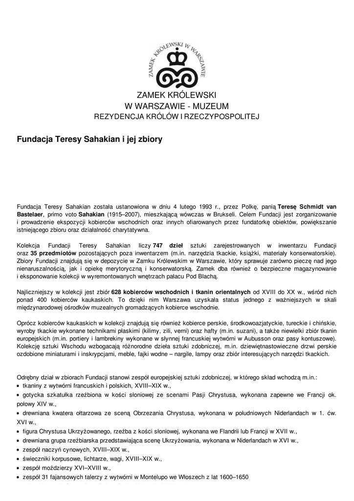 ZAMEK KRÓLEWSKI W WARSZAWIE - MUZEUM REZYDENCJA KRÓLÓW I RZECZYPOSPOLITEJ Fundacja Teresy Sahakian i jej zbiory Fundacja Teresy Sahakian została ustanowiona w dniu 4 lutego 1993 r., przez Polkę, panią Teresę Schmidt van Bastelaer, primo voto Sahakian (1915–2007), mieszkającą wówczas w Brukseli. Celem Fundacji jest zorganizowanie i prowadzenie ekspozycji kobierców wschodnich oraz innych ofiarowanych przez fundatorkę obiektów, powiększanie istniejącego zbioru oraz działalność charytatywna. Kolekcja Fundacji Teresy Sahakian liczy 747 dzieł sztuki zarejestrowanych w inwentarzu Fundacji oraz 35 przedmiotów pozostających poza inwentarzem (m.in. narzędzia tkackie, książki, materiały konserwatorskie). Zbiory Fundacji znajdują się w depozycie w Zamku Królewskim w Warszawie, który sprawuje zarówno pieczę nad jego nienaruszalnością, jak i opiekę merytoryczną i konserwatorską. Zamek dba również o bezpieczne magazynowanie i eksponowanie kolekcji w wyremontowanych wnętrzach pałacu Pod Blachą. Najliczniejszy w kolekcji jest zbiór 628 kobierców wschodnich i tkanin orientalnych od XVIII do XX w., wśród nich ponad 400 kobierców kaukaskich. To dzięki nim Warszawa uzyskała status jednego z ważniejszych w skali międzynarodowej ośrodków muzealnych gromadzących kobierce wschodnie. Oprócz kobierców kaukaskich w kolekcji znajdują się również kobierce perskie, środkowoazjatyckie, tureckie i chińskie, wyroby tkackie wykonane technikami płaskimi (kilimy, zili, verni) oraz hafty (m.in. suzani), a także niewielki zbiór tkanin europejskich (m.in. portiery i lambrekiny wykonane w słynnej francuskiej wytwórni w Aubusson oraz pasy kontuszowe). Kolekcję sztuki Wschodu wzbogacają różnorodne dzieła sztuki zdobniczej, m.in. dziewiętnastowieczne drzwi perskie ozdobione miniaturami i inskrypcjami, meble, fajki wodne – nargile, lampy oraz zbiór interesujących narzędzi tkackich. Odrębny dział w zbiorach Fundacji stanowi zespół europejskiej sztuki zdobniczej, w którego skład wchodzą m.in.: tkaniny z wytwórni francuskich i polskich, XVIII–XIX w., gotycka szkatułka rzeźbiona w kości słoniowej ze scenami Pasji Chrystusa, wykonana zapewne we Francji ok. połowy XIV w., drewniana kwatera ołtarzowa ze sceną Obrzezania Chrystusa, wykonana w południowych Niderlandach w 1. ćw. XVI w., figura Chrystusa Ukrzyżowanego, rzeźba z kości słoniowej, wykonana we Flandrii lub Francji w XVII w., drewniana grupa rzeźbiarska przedstawiająca scenę Ukrzyżowania, wykonana w Niderlandach w XVI w., zespół naczyń cynowych, XVIII–XIX w., świeczniki korpusowe, lichtarze, wagi, XVIII–XIX w., zespół moździerzy XVI–XVIII w., zespół 31 fajansowych talerzy z wytwórni w Montelupo we Włoszech z lat 1600–1650 4 figurki z serii „Cztery Pory Roku” (Delft, Holandia, XVIII w.). 4 figurki z serii „Cztery Pory Roku” (Delft, Holandia, XVIII w.). Wszystkie dzieła sztuki składające się na kolekcję Fundacji Teresy Sahakian były sukcesywnie sprowadzane do Zamku Królewskiego w Warszawie, począwszy od 1989 r. Wówczas miał miejsce pierwszy akt darowizny ze strony fundatorki. Kolejne odbyły się w roku 1992 i 2007. Ostatni dar został przekazany jako legat w 2008 r. Twórczyni kolekcji kobierców wschodnich i założycielka fundacji została odznaczona Krzyżem Oficerskim i Krzyżem Komandorskim Orderu Zasługi. Miejscem przechowywania kolekcji stał się pałac Pod Blachą, gdzie przygotowane w latach 1990, 1993, 1995 kolejne ekspozycje prezentowały tkaniny wschodnie wykonane w różnych ośrodkach, przede wszystkim jednak kobierce kaukaskie, stanowiące o wyjątkowości kolekcji, cieszące się dużym i wciąż rosnącym zainteresowaniem zwiedzających. Na wystawie w Piwnicy Renesansowej Zamku Królewskiego w Warszawie zorganizowanej w 2006 r., w czasie trwania remontu pałacu Pod Blachą, pokazano wybór 60 kobierców z Kaukazu. Obecna prezentacja zbiorów, zatytułowana Powrót kolekcji. Kobierce wschodnie ze zbiorów Fundacji Teresy Sahakian, została udostępniona publiczności po remoncie pałacu w 2008 r. Na wystawę wybrano zespół 189 zabytków z czterech wiodących ośrodków sztuki kobierniczej: perskiego, anatolijskiego, środkowoazjatyckiego oraz prezentowanego najliczniej – kaukaskiego. Eksponowane tkaniny odzwierciedlają charakter całej kolekcji, której twórcy ze szczególnym upodobaniem gromadzili kobierce kaukaskie, tworząc różnorodny zbiór, reprezentatywny dla tego ośrodka sztuki kobierniczej. Zarząd Fundacji ustalił zasadę rotacyjnego eksponowania kobierców na ekspozycji stałej w pałacu Pod Blachą ze względu na ograniczoną przestrzeń wystawienniczą, w której jednorazowo można pomieścić ok. 200 tkanin. Poza wystawą stałą w pałacu Pod Blachą Fundacja prezentuje swoje zbiory na wystawach czasowych w różnych muzeach polskich. Scenariusze tych wystaw są przygotowywane w całości przez kuratora zbiorów Fundacji Katarzynę Połujan. Do tej pory odbyły się cztery takie wystawy w Muzeum Okręgowym w Toruniu (1999), Muzeum Zamku Książąt Pomorskich w Szczecinie (2003), Muzeum Zamkowym w Malborku (2005–2006) oraz Muzeum Okręgowym w Rzeszowie (2009). Ze zbiorów Fundacji korzystały również liczne polskie muzea, wypożyczając kobierce na swoje wystawy, m.in. w Muzeum Narodowym w Krakowie (Ormianie polscy, 1999 r.), w Muzeum Zamkowym w Malborku (Oręż perski i indoperski ze zbiorów polskich, 2000 r.), w Muzeum Narodowym w Gdańsku (Klejnot w koronie, 2006 r.), w Muzeum Rzeźby Alfonsa Karnego w Białymstoku (Oddział Muzeum Podlaskiego, Kobierce modlitewne, 2009 r.), w Muzeum Rolnictwa im. ks. Krzysztofa Kluka w Ciechanowcu (W dworku szlacheckim ok. 1800 roku, 2009 r.), w Muzeum Okręgowym w Zamościu (Ars Armeniaca. Wystawa sztuki ormiańskiej ze zbiorów polskich i ukraińskich, 2010 r.) oraz w Muzeum Pałacu w Wilanowie (Amor Polonus, 2010 r.). Prowadzenie ekspozycji kobierców wsch