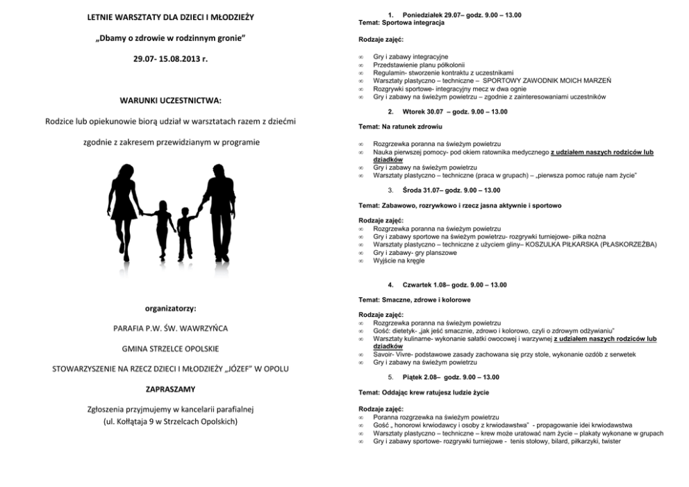 LETNIE WARSZTATY DLA DZIECI I MŁODZIEŻY „Dbamy o zdrowie w rodzinnym gronie” 29.07- 15.08.2013 r. WARUNKI UCZESTNICTWA: 1. Poniedziałek 29.07– godz. 9.00 – 13.00 Temat: Sportowa integracja Rodzaje zajęć: • • • • • • Gry i zabawy integracyjne Przedstawienie planu półkolonii Regulamin- stworzenie kontraktu z uczestnikami Warsztaty plastyczno – techniczne – SPORTOWY ZAWODNIK MOICH MARZEŃ Rozgrywki sportowe- integracyjny mecz w dwa ognie Gry i zabawy na świeżym powietrzu – zgodnie z zainteresowaniami uczestników 2. Rodzice lub opiekunowie biorą udział w warsztatach razem z dziećmi zgodnie z zakresem przewidzianym w programie Wtorek 30.07 – godz. 9.00 – 13.00 Temat: Na ratunek zdrowiu • • • • Rozgrzewka poranna na świeżym powietrzu Nauka pierwszej pomocy- pod okiem ratownika medycznego z udziałem naszych rodziców lub dziadków Gry i zabawy na świeżym powietrzu Warsztaty plastyczno – techniczne (praca w grupach) – „pierwsza pomoc ratuje nam życie” 3. Środa 31.07– godz. 9.00 – 13.00 Temat: Zabawowo, rozrywkowo i rzecz jasna aktywnie i sportowo Rodzaje zajęć: • Rozgrzewka poranna na świeżym powietrzu • Gry i zabawy sportowe na świeżym powietrzu- rozgrywki turniejowe- piłka nożna • Warsztaty plastyczno – techniczne z użyciem gliny– KOSZULKA PIŁKARSKA (PŁASKORZEŹBA) • Gry i zabawy- gry planszowe • Wyjście na kręgle 4. Czwartek 1.08– godz. 9.00 – 13.00 Temat: Smaczne, zdrowe i kolorowe organizatorzy: PARAFIA P.W. ŚW. WAWRZYŃCA GMINA STRZELCE OPOLSKIE STOWARZYSZENIE NA RZECZ DZIECI I MŁODZIEŻY „JÓZEF” W OPOLU Rodzaje zajęć: • Rozgrzewka poranna na świeżym powietrzu • Gość: dietetyk- „jak jeść smacznie, zdrowo i kolorowo, czyli o zdrowym odżywianiu” • Warsztaty kulinarne- wykonanie sałatki owocowej i warzywnej z udziałem naszych rodziców lub dziadków • Savoir- Vivre- podstawowe zasady zachowana się przy stole, wykonanie ozdób z serwetek • Gry i zabawy na świeżym powietrzu 5. ZAPRASZAMY Zgłoszenia przyjmujemy w kancelarii parafialnej (ul. Kołłątaja 9 w Strzelcach Opolskich) Piątek 2.08– godz. 9.00 – 13.00 Temat: Oddając krew ratujesz ludzie życie Rodzaje zajęć: • Poranna rozgrzewka na świeżym powietrzu • Gość „ honorowi krwiodawcy i osoby z krwiodawstwa” - propagowanie idei krwiodawstwa • Warsztaty plastyczno – techniczne – krew może uratować nam życie – plakaty wykonane w grupach • Gry i zabawy sportowe- rozgrywki turniejowe - tenis stołowy, bilard, piłkarzyki, twister 6. 11. Poniedziałek 12.08 godz. 9.00 – 13.00 Poniedziałek 5.08 – godz. 9.00 – 13.00 Temat: Ruch to zdrowie Temat: Zdrowe ząbki mam i o nie dbam Rodzaje zajęć: • Poranne zabawy w ogrodzie – zgodnie z zainteresowaniami uczestników • Gość: spotkanie z dentystą „ co robić by mieć zdrowy i piękny uśmiech” • Warsztaty plastyczno – techniczne – zdrowe ząbki mam i o nie dbam – praca indywidualna dowolną techniką • Gry i zabawy na świeżym powietrzu- rozgrywki turniejowe- gra w gumę, skoki przez skakankę, szczur • • • • Rozgrzewka na świeżym powietrzu Zajęcia rozciągająco - relaksacyjne (grupa pierwsza) – warsztaty plastyczne (grupa druga) Zajęcia rozciągająco – relaksacyjne (grupa druga) – warsztaty plastyczne (grupa pierwsza) Gry i zabawy – gry planszowe, zabawa zgodna z zainteresowaniami uczestników 12. Wtorek 13.08 godz. 9.00 – 13.00 Temat: O skórę dbam i zdrową ją mam! 7. Wtorek 6.08 – godz. 9.00-13.00 Temat: Wyginam zdrowo ciało Rodzaje zajęć: • • • Rozgrzewka poranna na świeżym powietrzu Gry i zabawy na świeżym powietrzu- rozgrywki turniejowe- wyścigi rzędów Gość: spotkanie z lekarzem „Aktywnie i sportowo- to znaczy zdrowo!” z udziałem naszych rodziców lub dziadków Spacer na plac zabaw, zabawa na placu zabaw • 8. Środa 7.08 – godz.9.00 -13.00 Temat: Rekreacyjnie Rodzaje zajęć: • Spacer na polanę w parku z udziałem dziadków • Piknik • Gry i zabawy na polanie z udziałem dziadków • Rekreacja na świeżym powietrzu 9. • • • • Rozgrzewka na świeżym powietrzu Zajęcia tematyczne: zdrowa skóra- jak o nią dbać i co nam zagraża? Rozgrywki sportowe: dwa ognie Spacer do parku miejskiego z udziałem naszych dziadków 13. Środa 14.08 godz. 9.00 – 13.00 Temat: Sportowe wspomnienia z wakacji • • • • Rozgrzewka poranna na świeżym powietrzu Warsztaty komunikacyjne- moje wakacyjne wspomnienia Warsztaty plastyczne – pocztówka z wakacji – praca w grupach metoda: origami kołowe Gry i zabawy na świeżym powietrzu: berek, gry i zabawy z chustą animacyjną 14. Czwartek 15.08 godz. 9.00 – 13.00 Temat: Aktywne z moją rodziną • • • • • Podsumowanie projektu Wręczenie upominków uczestnikom Wspólne gry i zabawy z rodzicami na świeżym powietrzu Ognisko pożegnalne Malowanie twarzy Czwartek 8.08 – godz. 9.00 – 13.00 Temat: Z tańcem na ty Rodzaje zajęć: • • • • Poranna rozgrzewka na świeżym powietrzu Zajęcia taneczne (grupa pierwsza) / warsztaty kreatywne – ozdoby do okien (grupa druga) Zabawa dowolna zgodna z zainteresowaniami uczestników Zajęcia taneczne (grupa druga) / warsztaty kreatywne – ozdoby do okien (grupa pierwsza) 10. Piątek 9.08– godz. 9.00 – 13.00 Temat: Jak radzić sobie z bólem w sporcie • • • • Poranna rozgrzewka na świeżym powietrzu Gość – Fizjoterapeuta – fizjoterapia w życiu sportowca Zajęcia z fizjoterapeutą Warsztaty twórcze – decoupage przy pomocy rodziców i dziadków Zapraszamy bardzo serdecznie do udziału ! ! ! Zapisane dzieci wraz z ich opiekunami zapraszamy na spotkanie organizacyjne, które odbędzie się 29.07.2013 roku o godz. 9.00 w Domu Katechetycznym!