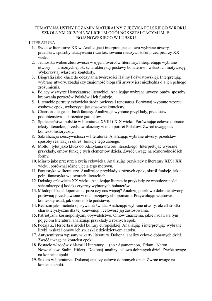TEMATY NA USTNY EGZAMIN MATURALNY Z JĘZYKA POLSKIEGO W ROKU SZKOLNYM 2012/2013 W LICEUM OGÓLNOKSZTAŁCACYM IM. E. BOJANOWSKIEGO W LUBSKU I LITERATURA 1. Świat w literaturze XX w. Analizując i interpretując celowo wybrane utwory, przedstaw sposoby ukazywania i wartościowania rzeczywistości przez pisarzy XX wieku. 2. Jednostka wobec zbiorowości w ujęciu twórców literatury. Interpretując wybrane utwory z różnych epok, scharakteryzuj postawy bohaterów i wskaż ich motywację. Wykorzystaj właściwe konteksty. 3. Biografia jako klucz do odczytania twórczości Haliny Poświatowskiej. Interpretując wybrane utwory, zbadaj czy znajomość biografii artysty jest niezbędna dla ich pełnego zrozumienia. 4. Polacy w satyrze i karykaturze literackiej. Analizując wybrane utwory, omów sposoby kreowania portretów Polaków i ich funkcje. 5. Literackie portrety człowieka średniowiecza i renesansu. Porównaj wybrane wzorce osobowe epok, wykorzystując stosowne konteksty. 6. Chansons de geste- baśń fantasy. Analizując wybrane przykłady, przedstaw podobieństwa i różnice gatunków. 7. Społeczeństwo polskie w literaturze XVIII i XIX wieku. Porównując celowo dobrane teksty literackie, przedstaw ukazany w nich portret Polaków. Zwróć uwagę nas kontekst historyczny. 8. Sakralizacja rzeczywistości w literaturze. Analizując wybrane utwory, przedstaw sposoby realizacji i określ funkcje tego zabiegu. 9. Motto i tytuł jako klucz do odczytania utworu literackiego. Interpretując wybrane przykłady, omów funkcję tych elementów dzieła. Zwróć uwagę na różnorodność ich formy. 10. Miasto jako przestrzeń życia człowieka. Analizując przykłady z literatury XIX i XX wieku, porównaj różne ujęcia tego motywu. 11. Fantastyka w literaturze. Analizując przykłady z różnych epok, określ funkcje, jakie pełni fantastyka w utworach literackich. 12. Dekalog człowieka XX wieku. Analizując literackie przykłady ze współczesności, scharakteryzuj kodeks etyczny wybranych bohaterów. 13. Młodopolska chłopomania- poza czy cos więcej? Analizując celowo dobrane utwory, porównaj przedstawione w nich przejawy chłopomanii. Przywołując właściwe konteksty ustal, jak oceniano tę podstawę. 14. Realizm jako metoda opisywania świata. Analizując wybrane utwory, określ środki charakterystyczne dla tej konwencji i celowość jej zastosowania. 15. Patriotyzm, kosmopolityzm, obywatelstwo. Omów znaczenia, jakie nadawała tym pojęciom literatura, analizując przykłady z różnych epok. 16. Poezja Z. Herberta u źródeł kultury europejskiej. Analizując i interpretując wybrane liryki, wskaż i omów ich związki z dziedzictwem antyku. 17. Antysemityzm wpisany w karty literatury. Dokonaj analizy celowo dobranych dzieł. Zwróć uwagę na kontekst epoki. 18. Postacie władców z historii i literatury… (np.: Agamemnon, Priam, Neron, Nowosilcow, Stalin, Hitler). Dokonaj analizy celowo dobranych dzieł. Zwróć uwagę na kontekst epoki. 19. Sukces w literaturze. Dokonaj analizy celowo dobranych dzieł. Zwróć uwagę na kontekst epoki. 20. Kat i ofiara-analiza postaw moralnych Polaków i Niemców w czasie II wojny światowej. 21. Odbiorca w utworze literackim. Analizując celowo dobrane utwory z różnych epok, przedstaw zmieniające się typy adresatów. W swojej prezentacji uwzględnij kontekst historyczny i kulturowy. 22. Literackie portrety kobiet. Analizując celowo wybrane utwory literackie z 2-3 epok, przedstaw zmieniające się postaci kobiece. Zwróć uwagę na sposoby ich portretowania. 23. Erotyka w literaturze. Porównaj sposoby jej przedstawiania, analizując wybrane utwory. Zwróć uwagę na konteksty epok. II ZWIĄZKI LITERATURY Z INNYMI DZIEDZINAMI SZTUKI 1. Motyw szatana w literaturze i sztuce. Analizując wybrane teksty literackie, omów sposoby jego opisywania i prezentowania. Zwróć uwagę na kontekst epoki. 2. Muzyka jako inspiracja w literaturze. Analizując wybrane teksty literackie, omów sposoby jej prezentowania. Zwróć uwagę na kontekst epoki. 3. Parodystyczne sposoby ujmowania rzeczywistości. Omów, odwołując się do przykładów z literatury i filmu. 4. Motyw snu w literaturze i filmie. Analizując wybrane teksty literackie, omów sposoby jego opisywania i prezentowania. Zwróć uwagę na kontekst epoki. 5. Nieśmiertelność-największe pragnienie człowieka. Literackie, malarskie i/lub filozoficzne realizacje motywu ,,non omnis moriar”. 6. Specyficzny charakter dzieła ,, kultowego’’. Odwołując się do wybranych tekstów kultury XX wieku, omów zagadnienie, sformułuj kryteria ,,kultowości’’. 7. Moje fascynacje literaturą i sztuką angielską (francuską, hiszpańską)… Powołując się na motywy, bohaterów i zjawiska, dokonaj charakterystyki świata przedstawionego wybranych utworów literackich i filmów lub dzieł malarskich, podając kryteria szczególnego zainteresowania kulturą angielską. 8. System wartości, sposób widzenia świata w dziełach o tematyce utopijnej i tekstach grup muzycznych wykonujących rock i/lub metal. Dokonaj stosownego opisu i analizy. 9. Motyw apokalipsy w literaturze i filmie. Dokonując wyboru odpowiednich dzieł kultury, scharakteryzuj ten topos, przedstaw sposoby jego realizacji. 10. Analizując przykłady z literatury i filmu, wskaż ich wartości jako dzieł mówiących o kondycji współczesnego człowieka . 11. ,,Zemsta zawsze jest słodka’’(?!)- odnieś się do motywu zemsty( vendetty, dintojry), odwołując się do wybranych utworów literackich i przykładów z filmu. III JĘZYK 1. Zanalizuj język wypowiedzi współczesnych sprawozdawców sportowych. Odwołaj się do wybranych przykładów. 2. Sprytna propaganda czy „opium dla ludu”. Analiza językowa wybranych „dzieł” socrealizmu. Sposoby funkcjonowania języka propagandy. Scharakteryzuj zabiegi językowe w wybranych „dziełach” doby socrealizmu. 3. Analiza językowa tekstów wybranego wykonawcy muzyki młodzie