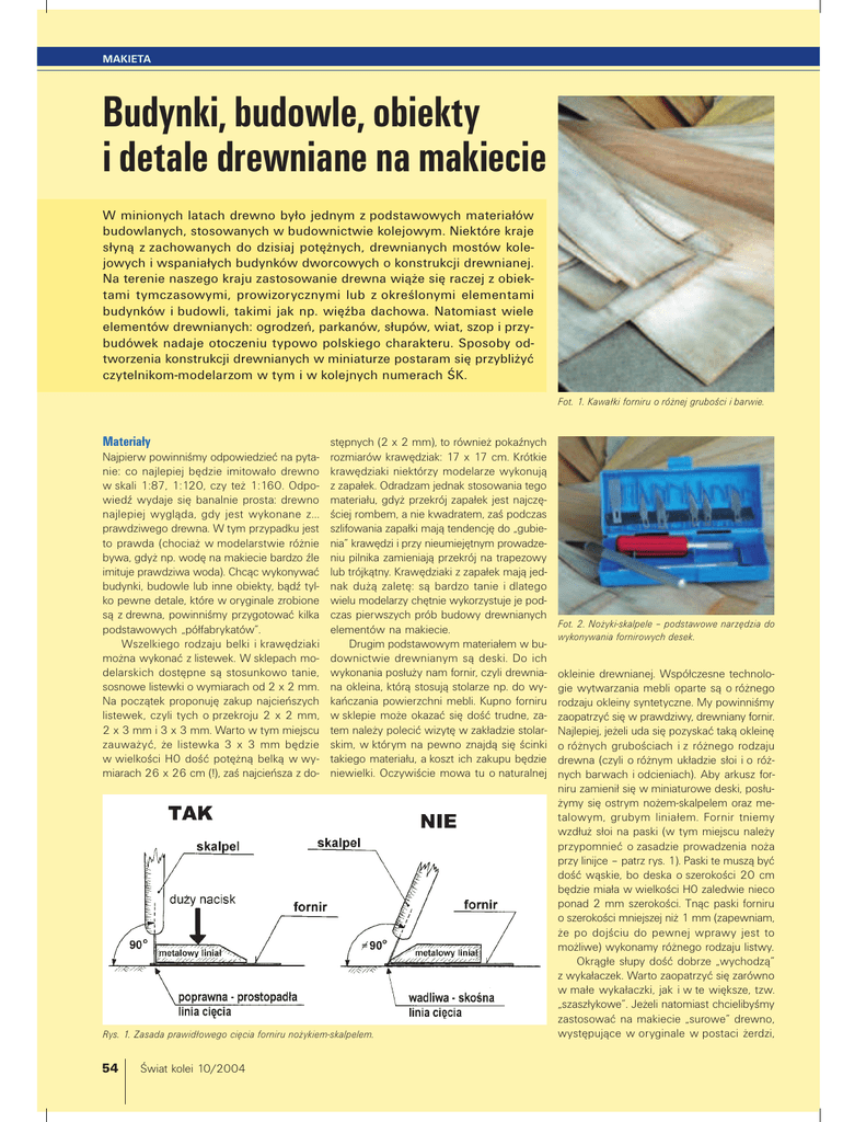 MAKIETA Budynki, budowle, obiekty i detale drewniane na makiecie W minionych latach drewno było jednym zpodstawowych materiałów budowlanych, stosowanych wbudownictwie kolejowym. Niektóre kraje słyną zzachowanych do dzisiaj potężnych, drewnianych mostów kolejowych iwspaniałych budynków dworcowych okonstrukcji drewnianej. Na terenie naszego kraju zastosowanie drewna wiąże się raczej zobiektami tymczasowymi, prowizorycznymi lub zokreślonymi elementami budynków ibudowli, takimi jak np. więźba dachowa. Natomiast wiele elementów drewnianych: ogrodzeń, parkanów, słupów, wiat, szop iprzybudówek nadaje otoczeniu typowo polskiego charakteru. Sposoby odtworzenia konstrukcji drewnianych wminiaturze postaram się przybliżyć czytelnikom-modelarzom wtym iwkolejnych numerach ŚK. Fot. 1. Kawałki forniru oróżnej grubości ibarwie. Materiały Najpierw powinniśmy odpowiedzieć na pytanie: co najlepiej będzie imitowało drewno wskali 1:87, 1:120, czy też 1:160. Odpowiedź wydaje się banalnie prosta: drewno najlepiej wygląda, gdy jest wykonane z... prawdziwego drewna. Wtym przypadku jest to prawda (chociaż wmodelarstwie różnie bywa, gdyż np. wodę na makiecie bardzo źle imituje prawdziwa woda). Chcąc wykonywać budynki, budowle lub inne obiekty, bądź tylko pewne detale, które woryginale zrobione są zdrewna, powinniśmy przygotować kilka podstawowych „półfabrykatów”. Wszelkiego rodzaju belki ikrawędziaki można wykonać zlistewek. Wsklepach modelarskich dostępne są stosunkowo tanie, sosnowe listewki owymiarach od 2 x 2 mm. Na początek proponuję zakup najcieńszych listewek, czyli tych oprzekroju 2 x 2 mm, 2 x 3 mm i3 x 3 mm. Warto wtym miejscu zauważyć, że listewka 3 x 3 mm będzie wwielkości H0 dość potężną belką wwymiarach 26 x 26 cm (!), zaś najcieńsza zdo- stępnych (2 x 2 mm), to również pokaźnych rozmiarów krawędziak: 17 x 17 cm. Krótkie krawędziaki niektórzy modelarze wykonują zzapałek. Odradzam jednak stosowania tego materiału, gdyż przekrój zapałek jest najczęściej rombem, anie kwadratem, zaś podczas szlifowania zapałki mają tendencję do „gubienia” krawędzi iprzy nieumiejętnym prowadzeniu pilnika zamieniają przekrój na trapezowy lub trójkątny. Krawędziaki zzapałek mają jednak dużą zaletę: są bardzo tanie idlatego wielu modelarzy chętnie wykorzystuje je podczas pierwszych prób budowy drewnianych elementów na makiecie. Drugim podstawowym materiałem wbudownictwie drewnianym są deski. Do ich wykonania posłuży nam fornir, czyli drewniana okleina, którą stosują stolarze np. do wykańczania powierzchni mebli. Kupno forniru wsklepie może okazać się dość trudne, zatem należy polecić wizytę wzakładzie stolarskim, wktórym na pewno znajdą się ścinki takiego materiału, akoszt ich zakupu będzie niewielki. Oczywiście mowa tu onaturalnej Rys. 1. Zasada prawidłowego cięcia forniru nożykiem-skalpelem. 54 Świat kolei 10/2004 Fot. 2. Nożyki-skalpele – podstawowe narzędzia do wykonywania fornirowych desek. okleinie drewnianej. Współczesne technologie wytwarzania mebli oparte są oróżnego rodzaju okleiny syntetyczne. My powinniśmy zaopatrzyć się wprawdziwy, drewniany fornir. Najlepiej, jeżeli uda się pozyskać taką okleinę oróżnych grubościach iz różnego rodzaju drewna (czyli oróżnym układzie słoi io różnych barwach iodcieniach). Aby arkusz forniru zamienił się wminiaturowe deski, posłużymy się ostrym nożem-skalpelem oraz metalowym, grubym liniałem. Fornir tniemy wzdłuż słoi na paski (w tym miejscu należy przypomnieć ozasadzie prowadzenia noża przy linijce – patrz rys. 1). Paski te muszą być dość wąskie, bo deska oszerokości 20 cm będzie miała wwielkości H0 zaledwie nieco ponad 2 mm szerokości. Tnąc paski forniru oszerokości mniejszej niż 1 mm (zapewniam, że po dojściu do pewnej wprawy jest to możliwe) wykonamy różnego rodzaju listwy. Okrągłe słupy dość dobrze „wychodzą” zwykałaczek. Warto zaopatrzyć się zarówno wmałe wykałaczki, jak iwte większe, tzw. „szaszłykowe”. Jeżeli natomiast chcielibyśmy zastosować na makiecie „surowe” drewno, występujące woryginale wpostaci żerdzi, MAKIETA Rys. 2. Barwienie drewna metodą zanurzania: a) przygotowanie bejcy lub farby, b) zanurzenie elementu drewnianego, c) ewentualne odsączenie nadmiaru bejcy (farby). pniaków, gałęzi itp., to warto wybrać się na łąkę, nazbierać różnych chwastów ocienkich iwmiarę prostych łodygach iwysuszyć je. Podobnie można uczynić zpędami innych roślin, anawet zcienkimi gałązkami drzew ikrzewów oraz zkawałkami korzeni. Po wysuszeniu okaże się, że wybrane fragmenty tego „materiału” do złudzenia będą przypominać oryginał, ate, pokryte zwierzchu warstwą pokurczonej tkanki, będą przypominały gałęzie ikonary pokryte korą. Barwienie Krawędziaki zlistewek ifornirowe deski będą miały zpewnością kolor jasnego drewna. Tak woryginale wygląda tylko świeże drewno. Wczasie eksploatacji – narażone na działanie czynników atmosferycznych – ulega przebarwieniu. Woryginale drewno budowlane jest najczęściej konserwowane lub barwione. Kiedyś powszechnie stosowano nasycanie olejem kreozotowym, ksylamitem ipodobnymi substancjami. Pod wpływem impregnatów iczynników atmosferycznych drewno zmienia barwę istaje się czarne lub szare, zachowując jednak swą specyficzną strukturę. Barwienie przygotowanych modelowych krawędziaków, listew idesek najlepiej wykonać wdwóch etapach. Najpierw – przed użyciem materiału – proponuję zastosować metodę zanurzeniową, później – po wykonaniu obiektu (elementu) – metodę malowania iwycierania. Wtym miejscu opiszę tylko pierwszy etap, gdyż etap drugi, końcowy, należy już do fazy waloryzacji modelu, czyli nanoszenia nań śladów eksploatacji. Barwienie drewna metodą zanurzeniową możemy wykonać używając bejcy lub farby. Kupując bejcę