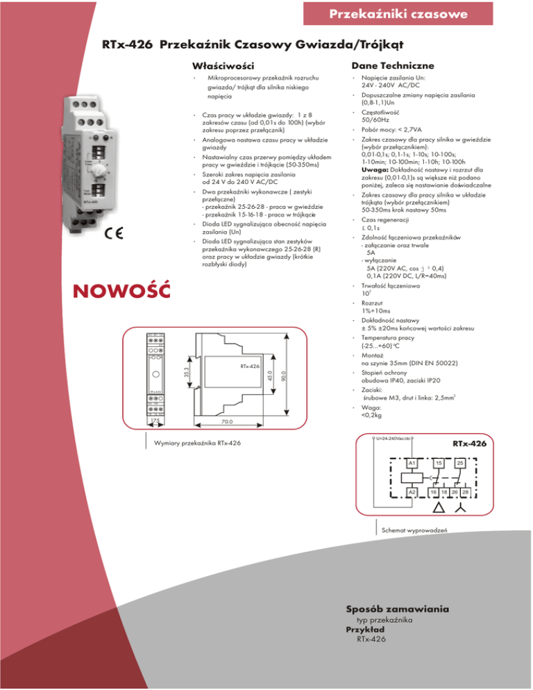 PrzekaŸniki czasowe RTx-426 PrzekaŸnik Czasowy Gwiazda/Trójk¹t Dane Techniczne W³aœciwoœci · · Napiêcie zasilania Un: 24V - 240V AC/DC · Dopuszczalne zmiany napiêcia zasilania (0,8-1,1)Un · Czêstotliwoœæ 50/60Hz · Pobór mocy: < 2,7VA · Zakres czasowy dla pracy silnika w gwieŸdzie (wybór prze³¹cznikiem): 0,01-0,1s; 0,1-1s; 1-10s; 10-100s; 1-10min; 10-100min; 1-10h; 10-100h Uwaga: Dok³adnoœæ nastawy i rozrzut dla zakresu (0,01-0,1)s s¹ wiêksze ni¿ podano poni¿ej, zaleca siê nastawianie doœwiadczalne · Zakres czasowy dla pracy silnika w uk³adzie trójk¹ta (wybór prze³¹cznikiem) 50-350ms krok nastawy 50ms · Czas regeneracji £ 0,1s · Zdolnoœæ ³¹czeniowa przekaŸników - za³¹czanie oraz trwale 5A - wy³¹czanie 5A (220V AC, cos j ³ 0,4) 0,1A (220V DC, L/R=40ms) · Trwa³oœæ ³¹czeniowa 5 10 · Rozrzut 1%+10ms · Dok³adnoœæ nastawy ± 5% ±20ms koñcowej wartoœci zakresu · Temperatura pracy (-25...+60)°C · Monta¿ na szynie 35mm (DIN EN 50022) · Stopieñ ochrony obudowa IP40, zaciski IP20 · Zaciski: œrubowe M3, drut i linka: 2,5mm2 · Waga: <0,2kg Mikroprocesorowy przekaŸnik rozruchu gwiazda/ trójk¹t dla silnika niskiego napiêcia · Czas pracy w uk³adzie gwiazdy: 1 z 8 zakresów czasu (od 0,01s do 100h) (wybór zakresu poprzez prze³¹cznik) · Analogowa nastawa czasu pracy w uk³adzie gwiazdy · Nastawialny czas przerwy pomiêdzy uk³adem pracy w gwieŸdzie i trójk¹cie (50-350ms) · Szeroki zakres napiêcia zasilania od 24 V do 240 V AC/DC · Dwa przekaŸniki wykonawcze ( zestyki prze³¹czne) - przekaŸnik 25-26-28 - praca w gwieŸdzie - przekaŸnik 15-16-18 - praca w trójk¹cie · Dioda LED sygnalizuj¹ca obecnoœæ napiêcia zasilania (Un) · Dioda LED sygnalizuj¹ca stan zestyków przekaŸnika wykonawczego 25-26-28 (R) oraz pracy w uk³adzie gwiazdy (krótkie rozb³yski diody) NOWOŒÆ A1 B1 15 25 R 45.0 90.0 RTx-426 35.3 U RTx-426 26 28 18 16 A2 17.5 70.0 U=24-240Vac/dc RTx-426 Wymiary przekaŸnika RTx-426 A1 A2 15 16 18 26 28 Schemat wyprowadzeñ Sposób zamawiania * typ przekaŸnika Przyk³ad * RTx-426 25 T&D Worldwide Contact Centre [email protected] www.areva-td.com AREVA T&D Sp. z o.o. ul.Strzegomska 23/27 58-160 Œwiebodzice Tel.:+48 (74) 8548 410 Fax:+48 (74) 8548 548 Instrukcja obs³ugi: RTx-426 PrzekaŸnik czasowy gwiazda-trójk¹t Nastawy zakresów czasowych T1 - gwiazda: Zakres czasu T1 Ustawienie zakresu czasu pracy w ukladzie gwiazdy: T1 T1 1 2 3 T1 1 2 3 1s-10s T1 1 2 3 10s-100s T1 1 2 3 1ms-10ms T1 1 2 3 10ms-100ms T1 1 2 3 1h-10h T1 1 2 3 10h-100h T1 1 2 3 0,01s-0,1s 0,1s-1s T2 - przerwa pomiêdzy gwiazd¹ a trójk¹tem: Nastawa czasu T2 Nastawa zakresu czasu przerwy pomiedzy gwiazda i trojkatem: T2 0ms T2 1 2 3 50ms T2 1 2 3 100ms T2 1 2 3 B1 B2 25 U 1 Vx =24 - 240 VAC /DC 2 4 3 6 1 0 S1 S2 T2 B1 B2 A1 R1 R2 15 25 8 1 2 3 1 2 3 250ms (+) (-) 2 T1 T2 6 R 1 2 3 T2 1 2 3 200ms T2 Sygnalizacja LED Stan przekaŸników wykonawczych (R1 i R2) sygnalizowany jest poprzez czerwon¹ diodê LED oznaczon¹ jako R (rys.1 poz.2): ! Dioda zgaszona informuje, ¿e R1 i R2 s¹ odwzbudzone z powodu: - braku napiêcia na A1-A2 - odliczania czasu T2. ! Krótkie przerwy w œwieceniu diody œwiadcz¹ o pracy w uk³adzie gwiazdy podczas rozruchu. PrzekaŸnik R2 jest pobudzony. PrzekaŸnik R1 odwzbudzony. Odliczany jest czas pracy w uk³adzie gwiazdy (T1). ! Krótkie rozb³yski diody œwiadcz¹ o wymuszonej pracy w uk³adzie gwiazdy, tzn obecnoœci napiêcia: - na zacisku B1: wstrzymywanie odliczania czasu pracy w uk³adzie gwiazdy (licznik T1) - na zacisku B2: wymuszone przejœcie z uk³adu trójk¹ta na pracê w uk³adzie gwiazdy ! Dioda œwieci œwiat³em ci¹g³ym, tzn ¿e silnik pracuje w uk³adzie trójk¹ta. PrzekaŸnik R1 pobudzony R2 odwzbudzony. 15 A1 1 2 3 150ms Budowa PrzekaŸnik umieszczony jest w obudowie z tworzywa sztucznego o klasie palnoœci V0. Obudowa przystosowana jest do monta¿u na szynie DIN 35mm. Na powierzchni czo³owej wyprowadzone s¹ dwa prze³¹czniki typu Dip Switch oraz pokrêt³o potencjometru. Pierwszy prze³¹cznik (rys.1 poz.3) s³u¿y do wybrania jednego z oœmiu zakresów czasowych czasu pracy w uk³adzie gwiazdy. Precyzyjnej nastawy czasu pracy w uk³adzie gwiazdy (w wybranym zakresie) dokonuje siê pokrêt³em potencjometru (rys.1 poz.4). Drugi z prze³¹czników (rys.1 poz.5) s³u¿y do wybrania czasu przerwy pomiêdzy prac¹ silnika w uk³adzie gwiazdy a prac¹ w uk³adzie t r ó j k ¹ t a . . Na powierzchni czo³owej wyprowadzone s¹ dwie diody œwiec¹ce LED. Dioda zielona, oznaczona jako U (rys.1 poz.1), sygnalizuje w³¹czenie napiêcia zasilania przekaŸnika. Dioda czerwona, oznaczona jako R (rys.1 poz. 2), sygnalizuje pracê silnika w uk³adzie trójk¹ta (stan przekaŸnika R1) oraz pracê w uk³adzie gwiazdy (stan przekaŸnika R2). Elementem wykonawczym s¹ dwa przekaŸniki (R1 oraz R2) o stykach prze³¹cznych. Pomocnicze wejœcia przekaŸnika, wyprowadzone s¹ na zaciski B1 oraz B2 . Po³¹czenia elektr yczne z przekaŸnikiem realizowane s¹ za p o m o c ¹ d z i e s i ê c i u z a c i s ków œrubowych w górnej i dolnej czêœci przekaŸnika (rys.1. poz. 6). 4 RTx-426 T2 1 2 3 350ms T2 1 2 3 300ms 5 28 26 A2 16 18 26 28 6 18 16 A2 Rys.1 Budowa przekaŸników RTx-426 Strona 1/4 Rys.2 Schemat wewnêtrzny i pod³¹czenie przekaŸnika D z i a ³ a n i e p r z e ³ ¹ c z n i ka gwiazda/trójk¹t T1 T2 U R2 R1 B1 B2 LED R Po podaniu napiêcia na zaciski A1A2 (przy braku napiêcia na zaciskach: B1 oraz B2) RTx-426 rozpoczyna realizacjê programu prze³¹czenia gwiazda/trójk¹t. Nastêpuje bezzw³oczne zamkniêcie zestyków R2 (25-28) oraz start odmierzania czasu T1 (praca w uk³adzie gwiazdy). Po odmierzeniu czasu T1 nastêpuje rozwarcie zestyku R2 (25-28) oraz start odmierzania czasu T2 (czas przerwy pomiêdzy gwiazd¹ a trójk¹tem). Po odmierzeniu nastawionego czasu T2 (rys.1 poz.5), nastêpuje zamkniêcie zest yku przekaŸnika R1 (15-18) (praca w uk³adzie trójk¹ta). Zestyk p