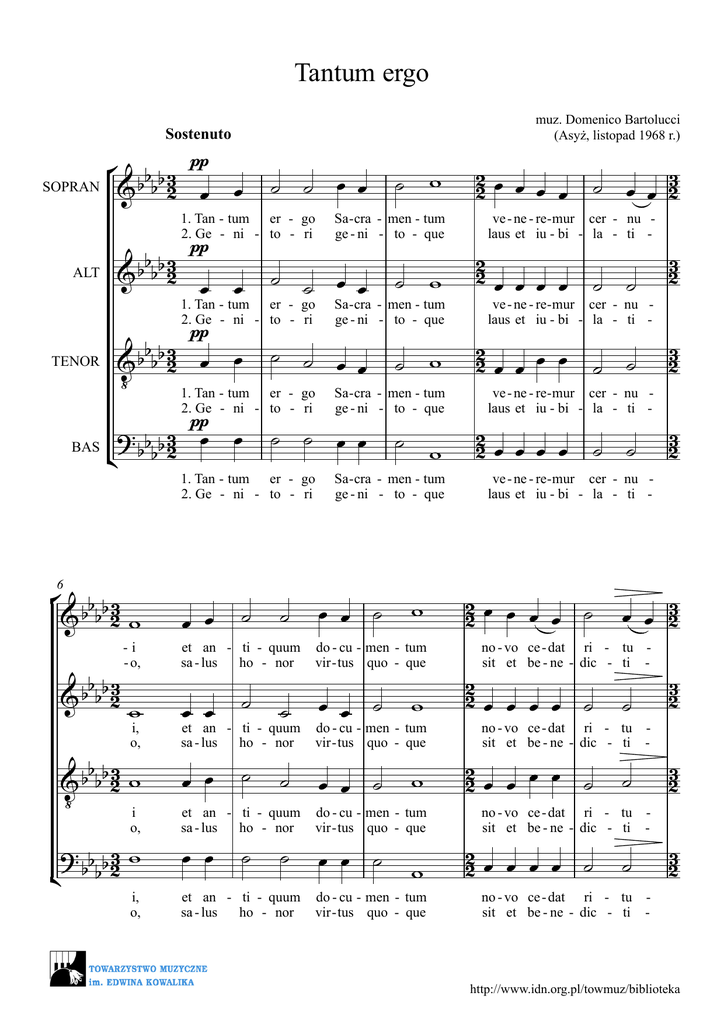 Tantum ergo muz. Domenico Bartolucci (Asyż, listopad 1968 r.) Sostenuto ° b b 3 pp SOPRAN & b b 2 œ œ ˙ ˙ œ œ b b3 &b b 2 œ œ ˙ ˙ œ œ ALT TENOR BAS w ˙ 1. Tan - tum er - go 2. Ge - ni - to - ri pp Sa - cra - men - tum ge - ni - to - que 1. Tan - tum er - go 2. Ge - ni - to - ri pp Sa - cra - men - tum ge - ni - to - que 2. Ge - ni - to - ri pp ge - ni - to - que 1. Tan - tum er - go 2. Ge - ni - to - ri Sa - cra - men - tum ge - ni - to - que 22 œ œ œ 3 œ ˙ œ œ 2 ve - ne - re - mur cer - nu laus et iu - bi - la - ti - w 22 œ œ œ œ ˙ ˙ 23 b b3 &b b 2 œ œ ˙ ˙ œ œ ˙ w ‹ 1. Tan - tum er - go Sa - cra - men - tum 22 œ œ œ œ ˙ ˙ 23 22 œ œ œ œ ˙ ˙ 23 ? b b3 œ œ ¢ bb2 ° b b3 &b b 2 w 6 b b3 &b b 2 -i - o, w i, o, b b3 &b b 2 w ‹ i o, ? b b3 w ¢ bb2 i, o, œ œ ˙ ˙ ˙ œ œ ˙ et an - ti - quum sa - lus ho - nor œ œ ˙ ˙ ˙ w w do - cu - men - tum vir - tus quo - que ve - ne - re - mur cer - nu laus et iu - bi - la - ti - ve - ne - re - mur cer - nu laus et iu - bi - la - ti - ve - ne - re - mur cer - nu laus et iu - bi - la - ti - 22 œ œ œ œ ˙ œ œ 23 ˙ 23 23 no - vo ce - dat ri - tu sit et be - ne - dic - ti - et an - ti - quum sa - lus ho - nor œ œ ˙ w do - cu - men - tum vir - tus quo - que 22 œ œ œ œ ˙ œ œ œ œ ˙ w 22 œ œ œ œ ˙ ˙ 22 œ œ œ œ ˙ ˙ œ œ ˙ ˙ ˙ ˙ et an - ti - quum sa - lus ho - nor œ œ ˙ ˙ et an - ti - quum sa - lus ho - nor do - cu - men - tum vir - tus quo - que œ œ ˙ w do - cu - men - tum vir - tus quo - que no - vo ce - dat ri - tu sit et be - ne - dic - ti - no - vo ce - dat ri - tu sit et be - ne - dic - ti - no - vo ce - dat ri - tu sit et be - ne - dic - ti - 23 http://www.idn.org.pl/towmuz/biblioteka ° b b3 &b b 2 w 2 11 - i. - o, b b3 &b b 2 w i. o. b b3 &b b 2 w ‹ i. o. ? b b3 w ¢ bb2 i. o. œ œ ˙ Prae - stet fi - des pro - ce - den - ti œ œ ˙ ˙ œ œ ˙ ˙ Prae - stet fi - des Pro - ce - den - ti Prae - stet fi - des Pro - ce - den - ti œ œ ˙ 16 - i, - o, bb &b b ˙ œ œ i, o, bb &b b ˙ œ œ ‹ i, o, ? bb ˙ ˙ ¢ bb i, o, ˙ Prae - stet fi - des Pro - ce - den - ti ° bb &b b w pp w ˙ nœ œ n˙ sup- ple - men - tum ab u - tro - que ˙ sen - su - um de - fec - tu com - par sit lau - da - ti - w 22 œ œ œ œ ˙ ˙ œ œ ˙ w 22 œ œ œ œ ˙ ˙ 22 œ œ œ œ ˙ sup- ple - men - tum ab u - tro - que sup- ple - men - tum ab u - tro - que œ œ ˙ w sup- ple - men - tum ab u - tro - que sen - su - um de - fec - tu com - par sit lau - da - ti - sen - su - um de - fec - tu com - par sit lau - da - ti - w™ ˙ œ œ 23 w™ œ œ œ œ 32 U w™ w™ 32 U w™ w™ 32 U w™ w™ - sen - su - um de - fec - tu com - par sit lau - da - ti - ˙ ˙ ˙ ˙ sen - su - um de - fec - tu com - par sit lau - da - ti pp - sen - su - um de - fec - tu com - par sit lau - da - ti - œ œ œ œ ˙ ˙ i. o. i. o. ˙ sen - su - um de - fec - tu com - par sit lau - da - ti - œ œ œ œ œ œ œ œ œ œ œ œ ˙ sen - su - um de - fec - tu com - par sit lau - da - ti pp pp 22 bœ œ œ œ A A i. o. A i. o. A - - w™ w™ - men. - U w™ w™ - - w™ U w™ men. U nw ™ - men. - men. U w™ w™ http://www.idn.org.pl/towmuz/biblioteka