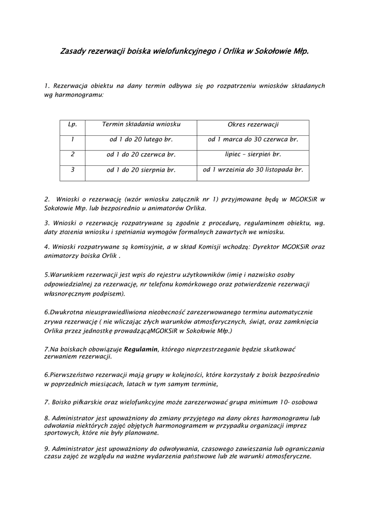 Zasady rezerwacji boiska wielofunkcyjnego i Orlika w Sokołowie Młp. 1. Rezerwacja obiektu na dany termin odbywa się po rozpatrzeniu wniosków składanych wg harmonogramu: Lp. Termin składania wniosku Okres rezerwacji 1 od 1 do 20 lutego br. od 1 marca do 30 czerwca br. 2 od 1 do 20 czerwca br. lipiec – sierpień br. 3 od 1 do 20 sierpnia br. od 1 września do 30 listopada br. 2. Wnioski o rezerwację (wzór wniosku załącznik nr 1) przyjmowane będą w MGOKSiR w Sokołowie Młp. lub bezpośrednio u animatorów Orlika. 3. Wnioski o rezerwację rozpatrywane są zgodnie z procedurą, regulaminem obiektu, wg. daty złożenia wniosku i spełniania wymogów formalnych zawartych we wniosku. 4. Wnioski rozpatrywane są komisyjnie, a w skład Komisji wchodzą: Dyrektor MGOKSiR oraz animatorzy boiska Orlik . 5.Warunkiem rezerwacji jest wpis do rejestru użytkowników (imię i nazwisko osoby odpowiedzialnej za rezerwację, nr telefonu komórkowego oraz potwierdzenie rezerwacji własnoręcznym podpisem). 6.Dwukrotna nieusprawiedliwiona nieobecność zarezerwowanego terminu automatycznie zrywa rezerwację ( nie wliczając złych warunków atmosferycznych, świąt, oraz zamknięcia Orlika przez jednostkę prowadzącąMGOKSiR w Sokołowie Młp.) 7.Na boiskach obowiązuje Regulamin, którego nieprzestrzeganie będzie skutkować zerwaniem rezerwacji. 6.Pierwszeństwo rezerwacji mają grupy w kolejności, które korzystały z boisk bezpośrednio w poprzednich miesiącach, latach w tym samym terminie, 7. Boisko piłkarskie oraz wielofunkcyjne może zarezerwować grupa minimum 10- osobowa 8. Administrator jest upoważniony do zmiany przyjętego na dany okres harmonogramu lub odwołania niektórych zajęć objętych harmonogramem w przypadku organizacji imprez sportowych, które nie były planowane. 9. Administrator jest upoważniony do odwoływania, czasowego zawieszania lub ograniczania czasu zajęć ze względu na ważne wydarzenia państwowe lub złe warunki atmosferyczne. 10. Z przyczyn niezależnych od administratora oraz na czas remontów i koniecznych napraw korzystanie z obiektów może być ograniczone lub odwołane. 11. Warunkiem korzystania z obiektów jest posiadanie odpowiedniego stroju i obuwia sportowego typu halowego. Dopuszcza się korzystanie w obuwiu z małymi korkami gumowymi lub z tworzywa sztucznego ( buty typu turfy, śnieżynki) wyłącznie na boisku o nawierzchni ze sztucznej trawy. 12. W przypadku bardzo dużego zainteresowania rezerwacją godzin na boisku do piłki nożnej ustala się następujące kryteria przy dokonaniu rezerwacji: 1.Rodzaj podmiotu a)Stowarzyszenia zarejestrowane na terenie Gminy, którego uczestnikami/ członkami są osoby zamieszkałe na terenie gminy. b) Inne podmioty szkolące dzieci i młodzież zamieszkałe na terenie Gminy c) Podmioty prawne i osoby fizyczne (firmy, spółki, wynajem indywidualny itp.) którego uczestnikami/ członkami są osoby zamieszkałe na terenie gminy. d) pozostali (kluby sportowe, firmy, wynajem indywidualny itp. którego uczestnikami/ członkami nie są osoby zamieszkałe w Gminie 2. Wiek uczestników 3. Ilość uczestników zameldowanych w Gminie 4. Ilość trenujących grup w stowarzyszeniu 13. Jednostka treningowa wynosi 90 minut, w przypadku bardzo dużego zainteresowania MGOKSiR zastrzega sobie prawo zmniejszenia jednostki treningowej do minimum 60 minut. 14.W okresie zimowym (od 01.12 do 28.02) boiska będą nieczynne. 15.Wszelkie informacje na temat funkcjonowania obiektów sportowych „ORLIK” mo żna uzyskać pod nr telefonów: 17 7729 053 w godzinach od 7.00 do 16.00 oraz u animatorów Orlika na boisku przy. ul. Sportowej 6 od poniedziałku do niedzieli w godz. (16.00 - 22.00) lub na stronie internetowej www.naszorlik.pl , www.mgoksir-sokolow.pl Załącznik nr 1 ……………..………………. (miejscowość i data) Wniosek o udostępnienie boiska w ramach kompleksu boisk sportowych ORLIK 2012 …………………………………………………………………………… reprezentowany przez (nazwa klubu, stowarzyszenia lub grupy zorganizowanej) …………………………………………… …..…………………………………………………. (imię i nazwisko- w przypadku instytucji (adres /siedziby klubu, stowarzyszenia ,organ reprezentujący) telefon/e-mail…………………………………………. ………………………………… składa wniosek o udostępnienie boiska do:/piłki nożnej/, / koszykówki/, /całego kompleksu/ wraz z zapleczem socjalno-szatniowym* w dni(u/ach)……………………………………………………………………………………………… w godzinach ………………………………………………………………………………………….. dla potrzeb…………………………………………………………………………………………………. …………………………………………………………………………………………………………… ………………………………………………………………………………………………………….. Jednocześnie oświadczam, że zapoznałem się z regulaminem obiektu sportowego i ponoszę pełną odpowiedzialności materialną i osobistą na wypadek ewentualnych szkód zaistniałych podczas korzystania oraz za wypadki, uszkodzenia ciała i uszczerbku na zdrowiu powstałe w związku z korzystaniem z obiektu sportowego oraz wyrażam zgodę na przetwarzanie danych osobowych niezbędnych do realizacji procedury rezerwacji płyty boisk Orlik 2012 – zgodnie z Ustawą z dnia 29.08.1997 r. o Ochronie Danych Osobowych (Dz. U. Nr 133 poz.883). Oświadczam, że korzystanie z kompleksu boisk sportowych „Moje Boisko – Orlik 2012” , nie będzie związane z pobieraniem żadnych opłat od osób korzystających z obiektu pod moją opieką. - Podstawa prawna: art. 233 Kodeksu Karnego. *niepotrzebne skreślić 