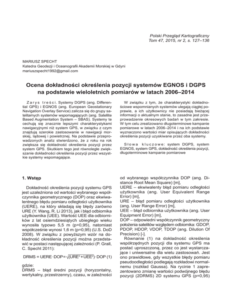 Polski Przegląd Kartograficzny Tom 47, 2015, nr 2, s. 127–136 MARIUSZ SPECHT Katedra Geodezji i Oceanografii Akademii Morskiej w Gdyni [email protected] Ocena dokładności określenia pozycji systemów EGNOS i DGPS na podstawie wieloletnich pomiarów w latach 2006–2014 Z a r y s t r e ś c i. Systemy DGPS (ang. Differential GPS) i EGNOS (ang. European Geostationary Navigation Overlay Service) zalicza się do grupy satelitarnych systemów wspomagających (ang. Satellite Based Augmentation System – SBAS). Systemy te cechują się znacznie lepszymi charakterystykami nawigacyjnymi niż system GPS, w związku z czym znajdują szerokie zastosowanie w nawigacji morskiej, lądowej i powietrznej. Na podstawie przeprowadzonych analiz stwierdzono, że z roku na rok zwiększa się dokładność określenia pozycji przez system GPS. Skutkiem tego jest równoległe zwiększanie dokładności określenia pozycji przez wszystkie systemy wspomagające. W związku z tym, że charakterystyki dokładnościowe wspomnianych systemów ulegają ciągłej poprawie, a ich użytkownicy nie posiadają bieżącej informacji o aktualnym stanie, to zasadne jest przeprowadzenie okresowych badań w tym zakresie. W tym celu zrealizowano długoterminowe kampanie pomiarowe w latach 2006–2014 i na ich podstawie wyznaczono wartości miar opisujących dokładności określenia pozycji uzyskiwane przez oba systemy. 1. Wstęp od wybranego współczynnika DOP (ang. Distance Root Mean Square) [m], UERE – ekwiwalenty błąd pomiaru odległości użytkownika (ang. User Equivalent Range Error) [m], URE – błąd pomiaru odległości użytkownika (ang. User Range Error) [m], UEE – błąd odbiornika użytkownika (ang. User Equipment Error) [m], DOP – odpowiedni współczynnik geometryczny położenia satelitów względem odbiornika: GDOP, PDOP, HDOP, VDOP, TDOP (ang. Dilution Of Precision) [-]. Równanie (1) na dokładność określenia współrzędnych pozycji dla systemu GPS ma postać uproszczoną, przez co jest wystarczające i uniwersalne dla wielu zastosowań. Jest ono prawidłowe, gdy wszystkie błędy pomiaru pseudoodległości podlegają rozkładowi normalnemu (rozkład Gaussa). Na rycinie 1 zaprezentowano zmianę wartości podwójnego błędu pozycji (2DRMS) 2D systemu GPS (p=0,95) Dokładność określenia pozycji systemu GPS jest uzależniona od wartości wybranego współczynnika geometrycznego (DOP) oraz ekwiwalentnego błędu pomiaru odległości użytkownika (UERE), na który składają się błędy zarówno URE (Y. Wang, R. Li 2013), jak i błąd odbiornika użytkownika (UEE). Wartość UEE dla odbiorników z lat osiemdziesiątych ubiegłego wieku wynosiła typowo 5,5 m (p=0,95), natomiast współcześnie wynosi 1,6 m (p=0,95) (U.S. DoD 2008). W związku z powyższym wzór na dokładność określenia pozycji można przedstawić w postaci następującej zależności (P. Grall, C. Specht 2011): DRMS = UERE ∙ DOP = √(URE2 + UEE2) ∙ DOP (1) gdzie: DRMS – błąd średni pozycji (horyzontalny, wertykalny, przestrzenny), czasu, w zależności S ł o w a k l u c z o w e : system DGPS, system EGNOS, system GPS, dokładność określenia pozycji, długoterminowe kampanie pomiarowe 128 Mariusz Specht w funkcji zmiennej wartości URE (B.K. Bailey 2014), przy założeniu UEE wynoszącego 0,8 m (RMS) oraz współczynnika HDOP równego 1,5. Z roku na rok zwiększa się dokładność określenia pozycji przez system GPS, a tym samym systemów go wspomagających (DGPS i EGNOS). W tym celu przeprowadzono liczne badania na obszarze Polski dotyczące oceny zmian dokładności systemów DGPS i EGNOS. Długoterminowe kampanie pomiarowe zrealizowane w 2006 i 2009 r. wykazały, że oba systemy cechują się znacznie lepszymi charakterystykami dokładnościowymi niż system GPS (M. Dziewicki, C. Specht 2009; M. Mięsikowski i inni 2006; C. Specht 2007a; C. Specht 2011). Dla użytkowników cywilnych tego systemu dokładność określenia pozycji nie powinna przekraczać 9 m (p=0,95) w płaszczyźnie horyzontalnej i 15 m (p=0,95) w płaszczyźnie wertykalnej (U.S. DoD 2008). Pomiary archiwalne jak i wykonane w 2014 r. opracowano wykorzystując ten sam algorytm obliczeniowy w oprogramowaniu Mathcad 15. W dalszej części artykułu zostanie dokonana analiza porównawcza dokładności określenia współrzędnych pozycji systemów DGPS i EGNOS przeprowadzona w okresie ostatnich lat na podstawie długoterminowych kampanii pomiarowych. 2. Rodzaje i miary dokładności określenia pozycji Podstawową charakterystyką nawigacyjną każdego systemu pozycyjnego jest dokład- ność określenia pozycji. W artykule podjęto próbę oceny zmiany wartości tego parametru w ciągu ostatnich 8 lat. Dokładność określenia pozycji oznacza stopień zgodności statystyk zmierzonych współrzędnych pozycji z wartościami rzeczywistymi lub tymi, które przyjmujemy za rzeczywiste. Miarą dokładności określenia pozycji jest jej błąd, który możemy oceniać w odniesieniu do dowolnego wymiaru: przestrzeni lub płaszczyzny. W celu określenia statystyk błędów wyznaczenia pozycji w nawigacji stosuje się trzy rodzaje dokładności (C. Specht 2007b; U.S. DoD i inni 2012): • dokładność przewidywana określenia pozycji (ang. predictable accuracy), to dokładność określenia pozycji wyrażona w systemie współrzędnych geodezyjnych, związana z modelem Ziemi – elipsoidą; informuje o rozkładzie statystycznym pozycji zmierzonych systemem w stosunku do wartości rzeczywistych w układzie współrzędnych używanych przez system; • dokładność powtarzalna określenia pozycji (ang. repeatable accuracy), to dokładność, z którą system pozwala użytkownikowi powrócić do wcześniej określonej pozycji we współrzędnych właściwych dla danego systemu; informuje o rozkładzie statystycznym pozycji w stosunku do ustalonej arbitralnie jej wartości, za którą najczęściej uważa się pozycję uśrednioną w serii pomiarow