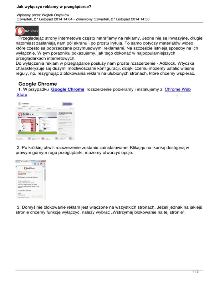Jak wyłączyć reklamy w przeglądarce? Wpisany przez Wojtek Onyśków Czwartek, 27 Listopad 2014 14:04 - Zmieniony Czwartek, 27 Listopad 2014 14:30 Przeglądając strony internetowe często natrafiamy na reklamy. Jedne nie są inwazyjne, drugie natomiast zasłaniają nam pół ekranu i po prostu irytują. To samo dotyczy materiałów wideo, które często są poprzedzane przymusowymi reklamami. Na szczęście istnieją sposoby na ich wyłącznie. W tym poradniku pokazujemy, jak tego dokonać w najpopularniejszych przeglądarkach internetowych. Do wyłączenia reklam w przeglądarce posłuży nam proste rozszerzenie - Adblock. Wtyczka charakteryzuje się dużymi możliwościami konfiguracji, dzięki czemu możemy ustalić własne reguły, np. rezygnując z blokowania reklam na ulubionych stronach, które chcemy wspierać. Google Chrome 1. W przypadku Google Chrome rozszerzenie pobieramy i instalujemy z Chrome Web Store . 2. Po krótkiej chwili rozszerzenie zostanie zainstalowane. Klikając na ikonkę dostępną w prawym górnym rogu przeglądarki, możemy otworzyć opcje. 3. Domyślnie blokowanie reklam jest włączone na wszystkich stronach. Jeżeli jednak na jakiejś stronie chcemy funkcję wyłączyć, należy wybrać „Wstrzymaj blokowanie na tej stronie”. 1/3 Jak wyłączyć reklamy w przeglądarce? Wpisany przez Wojtek Onyśków Czwartek, 27 Listopad 2014 14:04 - Zmieniony Czwartek, 27 Listopad 2014 14:30 „Wstrzymaj 4. Jeżeli natomiast blokowanie”. całkowicie chcemy wyłączyć blokowanie reklam w przeglądarce, wybieramy Opera 1. W przypadku Opery cały proces wygląda podobnie. W pierwszej kolejności instalujemy rozszerzenie Adblock z tego miejsca , klikając na „Add to Opera”. 2. Obsługa wygląda identycznie jak w Google Chrome. Klikając na ikonkę w prawym górnym rogu przeglądarki otrzymujemy dostęp do szeregu opcji związanych z blokowaniem reklam. Z poziomu menu możemy wstrzymać blokowanie, dodać wyjątki itp. Mozilla Firefox 1. W przypadku Firefoksa rozszerzenie należy pobrać i zainstalować z tego miejsca , klikając na „Add to Firefox”. 2/3 Jak wyłączyć reklamy w przeglądarce? Wpisany przez Wojtek Onyśków Czwartek, 27 Listopad 2014 14:04 - Zmieniony Czwartek, 27 Listopad 2014 14:30 2. Zatwierdzamy instalację dodatku. górnym 3. Dostęp rogu doprzeglądarki. funkcji blokowania reklam otrzymujemy po naciśnięciu czerwonej ikony w prawym zawartość reklam Od tej pory na tej strony, reklamy stronie. którą niechcemy będą jużzobaczyć. nam straszne. W takim Niekiedy przypadku jednak należy wtyczka wyłączyć blokuje blokowanie także 3/3