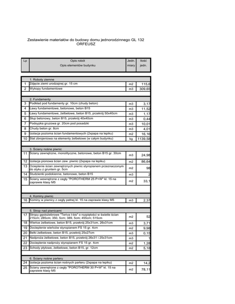 Zestawienie materiałów do budowy domu jednorodzinnego GL 132 ORFEUSZ Lp Opis robót Jedn. Ilość Opis elementów budynku miary jedn. 1. Roboty ziemne 1 Zdjęcie ziemi urodzajnej gr. 15 cm m2 2 Wykopy fundamentowe m3 115,6 309,65 3 Podkład pod fundamenty gr. 10cm (chudy beton) m3 3,17 4 Ławy fundamentowe, betonowe, beton B15 m3 11,52 5 Ławy fundamentowe, żelbetowe, beton B15, przekrój 50x40cm m3 1,17 6 Słup betonowy, beton B15, przekrój 40x40cm m3 0,44 7 Podsypka gruzowa gr. 20cm pod posadzki m3 10,01 8 Chudy beton gr. 8cm m3 4,01 9 Izolacja pozioma ścian fundamentowych (2xpapa na lepiku) m2 10 Stal zbrojeniowa na elementy żelbetowe (w całym budynku) kg 16,16 1139,58 m3 24,98 12 Izolacja pionowa ścian zew. piwnic (2xpapa na lepiku) m2 86,64 13 Ocieplenie ścian zewnętrznych piwnic styropianem przeznaczonym do styku z gruntem gr. 5cm m2 98 14 Studzienki podokienne, betonowe, beton B15 m3 2 m2 33,1 m3 2,37 m2 52 18 Wieńce żelbetowe, beton B15, przekrój 25x31cm, 26x31cm m3 3,71 19 Docieplenie wieńców styropianem FS 15 gr. 4cm m2 9,98 20 Belki żelbetowe, beton B15, przekrój 25x27cm m3 0,15 21 Nadproża żelbetowe, beton B15, przekrój 26x31 i 25x31cm m3 1 22 Docieplenie nadproży styropianem FS 15 gr. 4cm m2 23 Schody płytowe, żelbetowe, beton B15, gr. 12cm m2 1,28 5,18 m2 14,2 m2 78,11 2. Fundamenty 3. Ściany nośne piwnic 11 Ściany zewnętrzne, monolityczne, betonowe, beton B15 gr. 30cm 15 Ściany wewnętrzne z cegły "POROTHERM 25 P+W" kl. 15 na zaprawie klasy M5 4. Kominy piwnic 16 Kominy w piwnicy z cegły pełnej kl. 15 na zaprawie klasy M5 5. Strop nad piwnicami 17 Stropy gęstożebrowe "Teriva I-bis" o rozpiętości w świetle ścian 215cm; 285cm; 350, 5cm; 389, 5cm; 455cm; 515cm 6. Ściany nośne parteru 24 Izolacja pozioma ścian nośnych parteru (2xpapa na lepiku) 25 Ściany zewnętrzne z cegły "POROTHERM 30 P+W" kl. 15 na zaprawie klasy M5 26 Nadproża żelbetowe, beton B15, przekrój 26x25cm m3 0,91 27 Docieplenie nadproży styropianem FS 15, gr. 4cm m2 3,5 28 Słup betonowy, beton B15, przekrój 40x40cm m3 0,41 m2 24,4 szt 4 m3 2,71 215cm; 220cm; 285cm; 350, 5cm; 389, 5cm; 455cm; 515cm m2 59,6 33 Wieńce żelbetowe, beton B15, przekrój 25x31cm, 26x31cm m3 3,86 34 Docieplenie wieńców styropianem FS 15 gr. 4cm m2 11,08 m3 1,3 36 Docieplenie belek żelbetowych styropianem FS 15 gr. 10cm m2 4,38 37 Docieplenie podcienia od spodu styropianem FS 15 gr. 15cm m2 38 Schody płytowe, żelbetowe, beton B15, gr. 12cm m2 5,4 4,69 m2 42,3 40 Nadproża żelbetowe, beton B15, przekrój 26x21cm m3 0,37 41 Docieplenie nadproży styropianem FS 15, gr. 4cm m2 1,43 42 Wieniec opaskowy żelbetowy, beton B15, przekrój 26x36cm m3 3,29 43 Docieplenie wieńca styropianem FS 15, gr. 4cm m2 13,23 44 Słupki kotwiące żelbetowe, beton B15, przekrój 26x30cm m3 45 Docieplenie słupków kotwiących styropianem FS 15, gr. 5cm m2 0,39 1,5 m3 4,46 m3 0,64 m3 0,2 49 Drewno konstrukcyjne więźby kl. K27 m3 50 Konstrukcja dachu ( w rozwinięciu) m2 7,43 161 51 Krycie dachówką m2 161 52 Folia wiatroizolacyjna "BRAAS EUROFOL" m2 161 53 Rynny f125 mb 22,8 54 Rynny f70 mb 2,95 55 Rury spustowe f100 mb 8,05 56 Wyłaz dachowy o wymiarach 80x80cm szt 1 57 Okna połaciowe o wymiarach 78x118cm szt 6 58 Podbitka drewniana, heblowana gr. 2cm m2 59 Podłoga drewniana na kleszczach gr. 3, 2cm m2 38,55 34,4 29 Ściany wewnętrzne z cegły "POROTHERM 25 P+W" kl. 15 na zaprawie klasy M5 30 Nadproża prefabrykowane L-19 o dł. 120cm 7. Kominy parteru 31 Kominy na parterze z cegły pełnej kl. 15 na zaprawie klasy M5 8. Strop nad parterem 32 Stropy gęstożebrowe "Teriva I-bis" o rozpiętości w świetle ścian 35 Belki żelbetowe, beton B15, przekrój 25x27cm; 25x37cm; 25x50cm; 30x46cm 9. Ściany nośne poddasza 39 Ściany zewnętrzne z cegły "POROTHERM 30 P+W" kl. 15 na zaprawie klasy M5 10. Kominy poddasza 46 Kominy na poddaszu z cegły pełnej kl. 15 na zaprawie klasy M5 47 Kominy z cegły klinkierowej kl. 15 na zaprawie klasy M5 (nad dachem) 48 Nakrywy betonowe kominów, beton B15 11. Więźba 12. Dach 13. Ściany działowe piwnicy 60 Ściana z cegły "POROTHERM 11, 5 P+W" kl. 10 na zaprawie klasy m2 5,6 61 Izolacja pozioma przeciwwilgociowa (2 x papa na lepiku) m2 60,37 62 Izolacja pozioma (folia budowlana) m2 60,37 63 Wełna mineralna "PAROC VL", gr. 10cm m2 60,51 64 Wylewka betonowa, beton B15, gr. 6, 5cm, zatarta na gładko m3 65 Wylewka betonowa, beton B15, gr. 8cm, zatarta na gładko m3 1,47 3 m2 8,82 szt 3 68 Izolacja pozioma (folia budowlana) m2 57,8 69 Wełna mineralna "PAROC VL", gr. 8cm m2 70 Wylewka betonowa, beton B15, gr. 3, 5cm, zatarta na gładko m3 57,8 2 m2 39,3 szt 4 m2 5,43 74 Styropian FS 20 gr. 3 cm m2 64,82 75 Izolacja pozioma (folia budowlana) m2 76 Wylewka betonowa, beton B15, gr. 3, 5cm, zatarta na gładko m3 64,82 2,27 77 Tynk wewnętrzny cementowo-wapienny na ścianach m2 466,1 78 Tynk wewnętrzny cementowo-wapienny na sufitach m2 118,06 79 Tynk cementowo-wapienny na słupie m2 3,84 m2 146,13 81 Wełna mineralna "PAROC IL", gr. 12cm m2 83 82 Wełna mineralna "PAROC IL", gr. 5cm m2 73 m2 73 84 Posadzka z płytek ceramicznych m2 65,44 85 Posadzka z paneli podłogowych m2 86 Trepy dębowe gr. 3cm na schodach m2 88,5 8,35 M2 14. Podłoga w piwnicy 15. Ściany działowe parteru 66 Ścianka z bloczków z betonu komórkowego max 500kg/m3 na zaprawie klasy M2, gr. 12cm 67 Nadproża prefabrykowane L-19 o dł. 120cm 16. Podłoga na parterze 17. Ściany działowe poddasza 71 Ściany z bloczków z betonu komórkowego max 500kg/m3 na zaprawie klasy M2, gr. 12cm 72 Nadproża prefabrykowane L-19 o dł. 120 cm 73 Ściana z cegły "POROTHERM 11, 5 P+W" kl. 10 na zaprawie klasy M2 18. Podłoga na poddaszu 19. Roboty wykończeniowe Tynki Docieplenie ścian zewnętrznych 80 Ocieplenie ścian zewnętrznych wełną mineralną "PAROC RAL4", gr. 10cm Sufit podwieszany 83 Płyta gipsowo-włóknowa "FERMACELL" na ruszcie stalowym gr. 1, 0cm Posadzki 20. Okna i drzwi 87 Okna o wymiarach ośc