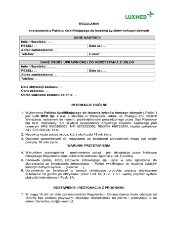 REGULAMIN skorzystania z Pakietu Kwalifikującego do leczenia żylaków kończyn dolnych DANE NABYWCY Imię i Nazwisko: ... ... PESEL: ... Adres zamieszkania: ... Telefon: ... Data ur.: ... E-mail: ... DANE OSOBY UPRAWNIONEJ DO KORZYSTANIA Z USŁUG Imię i Nazwisko: : ... ... PESEL: ... Data ur.: ... Adres zamieszkania: ... Telefon: ... Data aktywacji zestawu: ... Cena zestawu: ... Okres ważności zestawu do dnia: ... INFORMACJE OGÓLNE 1. Wykonawcą Pakietu kwalifikującego do leczenia żylaków kończyn dolnych („Pakiet”) jest LUX MED Sp. z o.o. z siedzibą w Warszawie, adres: ul. Postępu 21c, 02-676 Warszawa, wpisanym do rejestru przedsiębiorców prowadzonego przez Sąd Rejonowy dla m.st. Warszawy, XIII Wydział Gospodarczy Krajowego Rejestru Sądowego pod numerem KRS 0000265353, NIP 5272523080, REGON 140723603, kapitał zakładowy 542 728 500,00 PLN. 2. Nabywcą może zostać osoba, która ukończyła 18 rok życia. 3. Osobami uprawnionymi do korzystania ze świadczeń zdrowotnych mogą być osoby powyżej 18 roku życia. WARUNKI PRZYSTĄPIENIA 4. Warunkiem przystąpienia i uruchomienia usługi jest akceptacja przez Nabywcę niniejszego Regulaminu oraz dokonanie płatności zgodnie z ust. 5 poniżej. 5. Całkowita opłata, którą Nabywca zobowiązuje się uiścić w celu zgłoszenia do skorzystania ze świadczenia zdrowotnego – Pakiet kwalifikujący do leczenia żylaków kończyn dolnych wynosi … (słownie: …) 6. Uprawnienia do świadczeń w ramach niniejszego produktu zostaną aktywowane w terminie 24 godzin po otrzymaniu przez LUX MED Sp. z o.o. wpłaty poprzez system płatności internetowych PayU SA. ODSTĄPIENIE I REZYGNACJA Z PROGRAMU 7. W ciągu 10 dni od dnia zaakceptowania Regulaminu, Zleceniodawca może odstąpić od Umowy bez podania przyczyny, składając oświadczenie na piśmie i przesyłając je na adres: [email protected]. 8. Prawo odstąpienia od umowy zawartej na odległość nie przysługuje konsumentowi w wypadku świadczenia usług rozpoczętych, za zgodą konsumenta, przed upływem 10 dni od dnia zawarcia umowy. WARUNKI REALIZACJI PROGRAMU 9. Świadczenie zdrowotne – Pakiet kwalifikujący do leczenia żylaków kończyn dolnych odbywa się w Szpitalu LUX MED przy ul. Puławskiej 455 w Warszawie i składa się z : a. Konsultacji chirurga b. USG Doppler żył kończyn dolnych c. 15% jednorazowego rabatu na usługi z zakresu leczenia żylaków spośród wymienionych wykonywane podczas jednego zabiegu (skleroterapia, miniflebektomia, VENEFITR (VNUS), safenektomia/parvektomia) Konsultacja kwalifikująca chirurga wraz USG w ramach Programu wykonuje Lek. med. Jarosław Rosochacki oraz dr n. med. Karol Chakkour. 10. W przypadku zalecenia przez lekarza wykonania innych dodatkowych usług wykraczających poza wyżej wymieniony zakres usługi te realizowane będą poza ww. zestawem, odpłatnie, zgodnie z cennikiem obowiązującym w placówce. 11. W celu skorzystania z 15% rabatu na usługi z zakresu leczenia żylaków (skleroterapia, miniflebektomia, VENEFITR (VNUS), safenektomia/parvektomia) należy w recepcji placówki przed skorzystaniem z zabiegu okazać otrzymany voucher. Voucher może zrealizować tylko Osoba Uprawniona do realizacji Pakietu kwalifikującego. Vouchera nie można przekazać osobom trzecim, rabat w ramach otrzymanego vouchera jest jednorazowy, dotyczy usług spośród wymienionych wykonywanych podczas jednego zabiegu i nie łączy się z innymi promocjami i rabatami. 12. Usługę można zrealizować w ciągu 3 miesięcy od dnia aktywowania uprawnień, nie wcześniej jednak niż 48 godzin od momentu aktywacji uprawnień. 13. Warunkiem udzielenia świadczenia jest uprzednie uzgodnienie jego terminu. Termin udzielenia świadczenia uzgodnić należy z personelem recepcji Szpitala LUX MED osobiście lub telefonicznie pod numerem (22) 431 20 59. OŚWIADCZENIE NABYWCY 14. Nabywca (w rozumieniu Regulaminu Programu Pakiet kwalifikujący do leczenia żylaków kończyn dolnych poinformował Osobę Uprawnioną (w rozumieniu ww regulaminu) do korzystania z usług w ramach Programu (w rozumieniu ww regulaminu) o: 1. adresie siedziby i pełnej nazwie LUX MED Sp. z o.o. jako administratora danych tej Osoby przekazanych przez Nabywcę; 2. celu i zakresie zbierania przez LUX MED Sp. z o.o. danych, o których mowa w pkt 1) powyżej; 3. źródle danych, o których mowa w pkt 1 powyżej; 4. prawie dostępu Osoby Uprawnionej do treści swoich danych przetwarzanych przez LUX MED Sp. z o.o. jako administratora danych oraz prawie do ich poprawiania; 5. uprawnieniach wynikających z art. 32 ust. 1 pkt 7 i 8 Ustawy z dnia 2 sierpnia 1997 r. o ochronie danych osobowych („Ustawa”) tj. a) wniesienia, w przypadkach wymienionych w art. 23 ust. 1 pkt 4 i 5 Ustawy, pisemnego, umotywowanego żądania zaprzestania przetwarzania jej danych ze względu na jej szczególną sytuację, b) wniesienia sprzeciwu wobec przetwarzania jej danych w przypadkach, wymienionych w art. 23 ust. 1 pkt 4 i 5 Ustawy, gdy administrator danych zamierza je przetwarzać w celach marketingowych lub wobec przekazywania jej danych osobowych innemu administratorowi danych. 15. Nabywca oświadcza, iż posiada zgodę osoby wskazanej w Regulaminie Programu Pakietu kwalifikującego do leczenia żylaków kończyn dolnych jako Osoba Uprawniona do korzystania z usług w ramach Programu, na przekazanie następujących danych osobowych tej osoby: imienia i nazwiska, daty urodzenia, numeru PESEL, numeru telefonu, adres e-mail, adres zamieszkania. KONTAKT I REKLAMACJE 16. Reklamacje przyjmowane są wyłącznie w formie pisemnej. 17. Reklamacje dotyczące obsługi rozpatrywane są w ciągu 5 dni roboczych, reklamacje dotyczące kwestii medycznych rozpatrywane są w ciągu 14 dni roboczych od daty wpływu wszystkich danych niezbędnych do rozpatrzenia reklamacji na adres: LUX MED Sp. z o.o. Departament Obsługi Klienta Dział Zarządzania Reklamacjami ul. Postępu 21c 02-676 Warszawa lub na adres poczty elektr