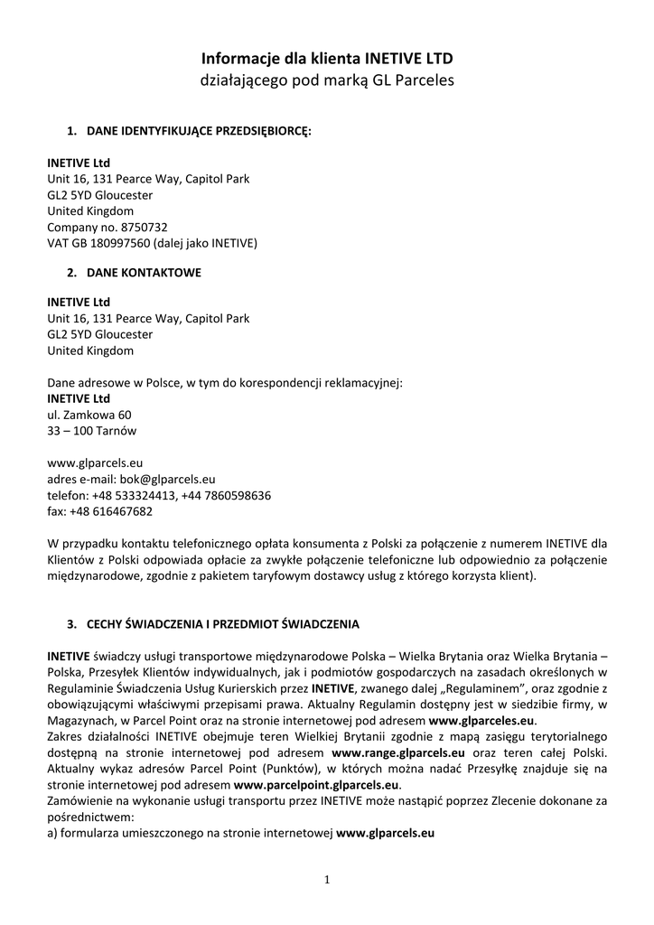 Informacje dla klienta INETIVE LTD działającego pod marką GL Parceles 1. DANE IDENTYFIKUJĄCE PRZEDSIĘBIORCĘ: INETIVE Ltd Unit 16, 131 Pearce Way, Capitol Park GL2 5YD Gloucester United Kingdom Company no. 8750732 VAT GB 180997560 (dalej jako INETIVE) 2. DANE KONTAKTOWE INETIVE Ltd Unit 16, 131 Pearce Way, Capitol Park GL2 5YD Gloucester United Kingdom Dane adresowe w Polsce, w tym do korespondencji reklamacyjnej: INETIVE Ltd ul. Zamkowa 60 33 – 100 Tarnów www.glparcels.eu adres e-‐mail: [email protected] telefon: +48 533324413, +44 7860598636 fax: +48 616467682 W przypadku kontaktu telefonicznego opłata konsumenta z Polski za połączenie z numerem INETIVE dla Klientów z Polski odpowiada opłacie za zwykłe połączenie telefoniczne lub odpowiednio za połączenie międzynarodowe, zgodnie z pakietem taryfowym dostawcy usług z którego korzysta klient). 3. CECHY ŚWIADCZENIA I PRZEDMIOT ŚWIADCZENIA INETIVE świadczy usługi transportowe międzynarodowe Polska – Wielka Brytania oraz Wielka Brytania – Polska, Przesyłek Klientów indywidualnych, jak i podmiotów gospodarczych na zasadach określonych w Regulaminie Świadczenia Usług Kurierskich przez INETIVE, zwanego dalej „Regulaminem”, oraz zgodnie z obowiązującymi właściwymi przepisami prawa. Aktualny Regulamin dostępny jest w siedzibie firmy, w Magazynach, w Parcel Point oraz na stronie internetowej pod adresem www.glparceles.eu. Zakres działalności INETIVE obejmuje teren Wielkiej Brytanii zgodnie z mapą zasięgu terytorialnego dostępną na stronie internetowej pod adresem www.range.glparcels.eu oraz teren całej Polski. Aktualny wykaz adresów Parcel Point (Punktów), w których można nadać Przesyłkę znajduje się na stronie internetowej pod adresem www.parcelpoint.glparcels.eu. Zamówienie na wykonanie usługi transportu przez INETIVE może nastąpić poprzez Zlecenie dokonane za pośrednictwem: a) formularza umieszczonego na stronie internetowej www.glparcels.eu 1 b) telefonicznie za pośrednictwem infolinii; numer infolinii w Polsce: 533324413, numer infolinii w Anglii: 07860598636. c) osobiście na piśmie w Parcel Point d) za pośrednictwem poczty elektronicznej [email protected] e) na piśmie f) za pomocą portalu społecznościowego Facebook. Kontakt INETIVE z klientem w przedmiocie złożonego Zlecenia odbywa się za pomocą korespondencji listownej, korespondencji e-‐mail, telefonicznie lub wiadomości tekstowej sms. 4. OPŁATA ZA USŁUGĘ Cennik usług transportowych świadczonych przez INETIVE dostępny jest w siedzibie INETIVE, w Parcel Point oraz na stronie internetowej INETIVE pod adresem: www.glparceles.eu, ceny aktualne w dacie dokonywania Zlecenia. Cena zależy od rodzaju przesyłki (standardowa, gabarytowa, niestandardowa, paleta), ew. przedmiotu i wagi przesyłki. Cennik zawiera również informacje o innych opłatach związanych z wykonywaniem Zlecenia. Brak jest możliwości ustalenia łącznej ceny za usługę. Forma płatności: 1. Płatnik może dokonać zapłaty na rzecz INETIVE wynagrodzenia za usługę transportową i usługi dodatkowe w formie gotówkowej kurierowi lub przelewem na wskazany rachunek INETIVE, według następujących zasad: a) zapłata gotówkowa Kurierowi podczas nadawania Przesyłki – opcja dostępna przy nadawaniu Przesyłki z Wielkiej Brytanii do Polski oraz z Polski do Wielkiej Brytanii na terenie obsługiwanym bezpośrednio przez Kurierów z Parcel Point; b) zapłata gotówkowa Kurierowi podczas doręczania Przesyłki – opcja dostępna przy doręczaniu Przesyłki z Wielkiej Brytanii do Polski oraz przy doręczaniu Przesyłki z Polski do Wielkiej Brytanii; c) zapłata w formie przelewu -‐ opcja dostępna tylko dla Przesyłek nadawanych z Polski do Wielkiej Brytanii: rachunek do wpłat na konto polskie prowadzone przez Alior Bank w walucie PLN nr rachunku: 08 2490 0005 0000 4520 1481 9826 rachunek do wpłat na konto angielskie prowadzone przez Barclays w walucie GBP: Sort code: 20-‐33-‐83 Account number: 93813878 Właścicielem rachunków prowadzonych przez Alior Bank oraz Barclays jest INETIVE Ltd, GL2 5YD Gloucester, unit 16, 131 Pearce Way, Capitol Park 5. SPOSÓB I TERMIN SPEŁNIENIA ŚWIADCZENIA: INETIVE dostarcza Przesyłki w terminach podanych w ofercie, z zastrzeżeniem Rozdziału VIII DORĘCZENIE PRZESYŁKI oraz Rozdziału IV RZECZY ZABRONIONE W TRANSPORCIE Regulaminu. 6. PROCEDURA REKLAMACYJNA 2 Procedura rozpatrywania reklamacji (Rozdział X REKLAMACJE Regulaminu): 1. Z chwilą doręczenia Przesyłki i stwierdzenia uszkodzenia, ubytku należy sporządzić wraz z kurierem doręczającym Protokół szkody, który jest dokumentem niezbędnym do złożenia reklamacji. 2. Reklamację można zgłosić wyłącznie drogą pisemną na adres: INETIVE Ltd, 33-‐100 Tarnów, Zamkowa 60. 3. Reklamacja powinna zawierać: a) Datę sporządzenia reklamacji; b) Imię i nazwisko/Nazwę i adres zamieszkania/siedzibę Zleceniobiorcy; c) Imię i nazwisko/Nazwę i adres zamieszkania/siedziby Odbiorcy; d) Tytuł oraz uzasadnienie reklamacji; e) Kwotę roszczenia; f) udokumentowanie wartości roszczeń (oryginał rachunku zakupu, paragonu, faktury VAT); g) dokumenty potwierdzające Zlecenie; h) Protokół szkody; i) Wykaz załączonych dokumentów; j) Podpis osoby uprawnionej do wniesienia reklamacji. 4. W przypadku stwierdzenia przez INETIVE braku dokumentów niezbędnych do przyjęcia i rozpoznania reklamacji, osoba składająca reklamację zostanie wezwania przez INETIVE do uzupełnienia braków reklamacji. 5. Postępowanie reklamacyjne uważa się za ostatecznie zakończone w momencie odmowy uznania reklamacji przez INETIVE lub niezapłacenia dochodzonej należności w terminie 100 dni od dnia wniesienia reklamacji. 6. Reklamacji nie podlega uszkodzenie Przesyłki lub zagubienie jej zawartości, w przypadku jej nieprawidłowego zapakowania przez Nadawcę lub gdy przedmiotem przesyłki była żywność, towary zabronione lub towary, o których mowa w
