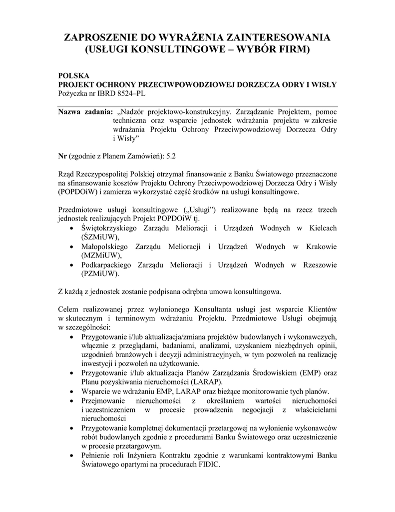 ZAPROSZENIE DO WYRAŻENIA ZAINTERESOWANIA (USŁUGI KONSULTINGOWE – WYBÓR FIRM) POLSKA PROJEKT OCHRONY PRZECIWPOWODZIOWEJ DORZECZA ODRY I WISŁY Pożyczka nr IBRD 8524–PL Nazwa zadania: „Nadzór projektowo-konstrukcyjny. Zarządzanie Projektem, pomoc techniczna oraz wsparcie jednostek wdrażania projektu w zakresie wdrażania Projektu Ochrony Przeciwpowodziowej Dorzecza Odry i Wisły” Nr (zgodnie z Planem Zamówień): 5.2 Rząd Rzeczypospolitej Polskiej otrzymał finansowanie z Banku Światowego przeznaczone na sfinansowanie kosztów Projektu Ochrony Przeciwpowodziowej Dorzecza Odry i Wisły (POPDOiW) i zamierza wykorzystać część środków na usługi konsultingowe. Przedmiotowe usługi konsultingowe („Usługi”) realizowane będą na rzecz trzech jednostek realizujących Projekt POPDOiW tj. Świętokrzyskiego Zarządu Melioracji i Urządzeń Wodnych w Kielcach (ŚZMiUW), Małopolskiego Zarządu Melioracji i Urządzeń Wodnych w Krakowie (MZMiUW), Podkarpackiego Zarządu Melioracji i Urządzeń Wodnych w Rzeszowie (PZMiUW). Z każdą z jednostek zostanie podpisana odrębna umowa konsultingowa. Celem realizowanej przez wyłonionego Konsultanta usługi jest wsparcie Klientów w skutecznym i terminowym wdrażaniu Projektu. Przedmiotowe Usługi obejmują w szczególności: Przygotowanie i/lub aktualizacja/zmiana projektów budowlanych i wykonawczych, włącznie z przeglądami, badaniami, analizami, uzyskaniem niezbędnych opinii, uzgodnień branżowych i decyzji administracyjnych, w tym pozwoleń na realizację inwestycji i pozwoleń na użytkowanie. Przygotowanie i/lub aktualizacja Planów Zarządzania Środowiskiem (EMP) oraz Planu pozyskiwania nieruchomości (LARAP). Wsparcie we wdrażaniu EMP, LARAP oraz bieżące monitorowanie tych planów. Przejmowanie nieruchomości z określaniem wartości nieruchomości i uczestniczeniem w procesie prowadzenia negocjacji z właścicielami nieruchomości Przygotowanie kompletnej dokumentacji przetargowej na wyłonienie wykonawców robót budowlanych zgodnie z procedurami Banku Światowego oraz uczestniczenie w procesie przetargowym. Pełnienie roli Inżyniera Kontraktu zgodnie z warunkami kontraktowymi Banku Światowego opartymi na procedurach FIDIC. Wsparcie w zarządzaniu Projektem, w części za którą odpowiedzialna jest dana jednostka realizująca, włączając w to zarządzanie finansami, planowanie, monitorowanie i sprawozdawanie z realizacji działań wdrażających Projekt, przygotowanie kompletnej aplikacji o środki z instytucji finansujących, w tym o środki unijne. Opis przedmiotu zamówienia jest dostępny na stronie internetowej: - http://szmiuw.kielce.com.pl/ Przewidywany czas trwania tych usług wynosi 78 miesięcy. Świętokrzyski Zarząd Melioracji i Urządzeń Wodnych w Kielcach, Małopolski Zarząd Melioracji i Urządzeń Wodnych w Krakowie oraz Podkarpacki Zarząd Melioracji i Urządzeń Wodnych w Rzeszowie zapraszają kwalifikujące się firmy konsultingowe („Konsultanci”) do wyrażenia zainteresowania świadczeniem Usług. Zainteresowani Konsultanci powinni przekazać informacje wykazujące, że posiadają wymagane kwalifikacje i odpowiednie doświadczenie do wykonania Usług. Kryteria umieszczenia na krótkiej liście są następujące: 1 2 3 4 5 6 7 Doświadczenie w przygotowaniu dużych projektów hydrotechnicznych z uwzględnieniem obiektów mostowych, w tym m.in. projektowanie i uzyskiwanie niezbędnych decyzji, opinii i uzgodnień. Doświadczenie w przygotowywaniu dokumentacji przetargowej (wraz z uczestniczeniem w procesie przetargowym), środowiskowej i związanej z przejmowaniem nieruchomości zgodnie z wytycznymi Banku Światowego. Doświadczenie w przejmowaniu nieruchomości i prowadzeniu negocjacji z właścicielami nieruchomości na potrzeby realizacji inwestycji. Doświadczenie w pełnieniu funkcji Inżyniera Kontraktu dla dużych inwestycji. Doświadczenie w realizacji projektów współfinansowanych ze środków unijnych wraz przygotowywanie wniosków aplikacyjnych o środki unijne oraz prowadzenie rozliczeń finansowych. Doświadczenie w realizacji dużych projektów hydrotechnicznych na terenie Polski. Każdy członek Joint Venture powinien wykazać, że średnioroczna suma kwot zapłaconych firmie (członkowi JV) za skutecznie zrealizowane podobne zamówienia w okresie 5 ostatnich lat (2010-2014) wynosi minimalnie 2,0 mln EUR. Każda firma występująca jako samodzielny Konsultant powinna wykazać, że średnioroczna suma kwot zapłaconych firmie za skutecznie zrealizowane podobne zamówienia w okresie 5 ostatnich lat (2010-2014) wynosi minimalnie 3,6 mln EUR Uwagę Konsultantów zwraca się na punkt 1.9 „Instrukcji Banku Światowego: Wybór i zatrudnianie konsultantów przez Pożyczkobiorców Banku Światowego w ramach pożyczek MBOiR oraz kredytów i grantów MSR, Styczeń 2011 ze zmianami z lipca 2014r. („Instrukcja Banku Światowego dotycząca konsultantów”), który przedstawia politykę Banku Światowego dotyczącą konfliktu interesów. Konsultanci mogą się łączyć z innymi firmami, aby zwiększyć swoje kwalifikacje. „Połączenie” może przyjąć formę Joint Venture lub konsultantów-podwykonawców. W przypadku Joint Venture (JV), dla celów stworzenia krótkiej listy wszyscy członkowie JV będą oceniani łącznie i powinni solidarnie odpowiadać za zamówienie oraz podpisać kontrakt w przypadku udzielenia zamówienia temu JV. W wyrażeniu zainteresowania (EOI), konsultanci powinni oddzielnie dla każdego członka Joint Venture przedstawić informacje dotyczące jego doświadczenia i kwalifikacji. Zainteresowani konsultanci powinni jasno określić formę współpracy oraz wskazać w swojej aplikacji obowiązki partnerów i konsultantów-podwykonawców. Niejasne zapisy wyrażenia zainteresowania, zawierające sformułowania „wspólnie z” i/oraz „w powiązaniu z” itp. mogą być przyczyną nie zakwalifikowania Konsultantów na krótką listę. Zasadą jes