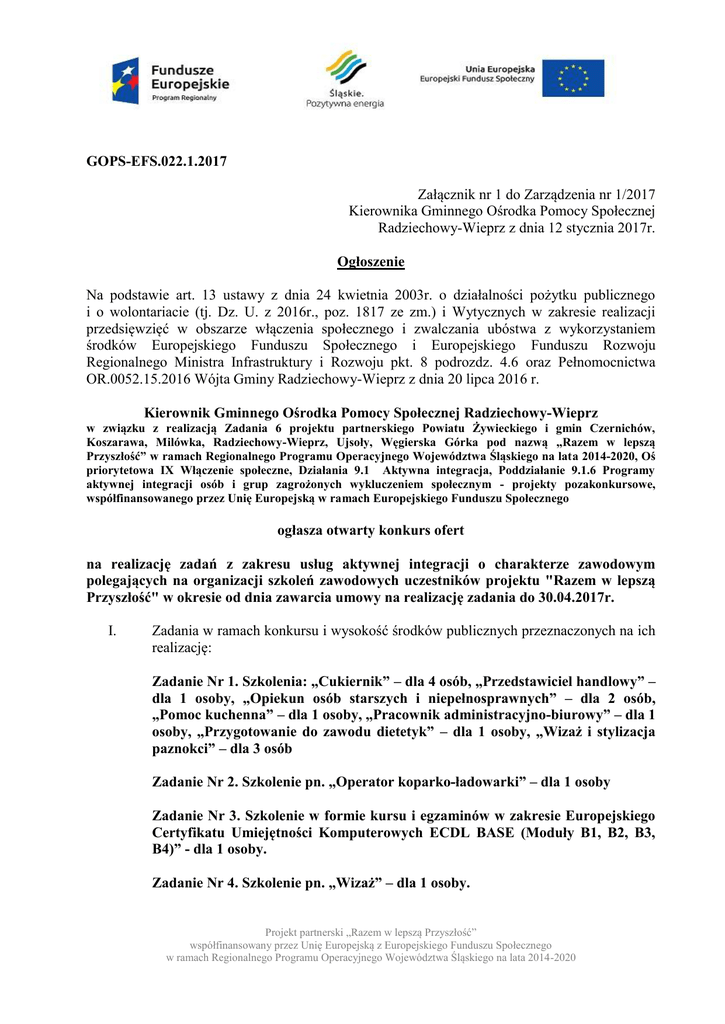 GOPS-EFS.022.1.2017 Załącznik nr 1 do Zarządzenia nr 1/2017 Kierownika Gminnego Ośrodka Pomocy Społecznej Radziechowy-Wieprz z dnia 12 stycznia 2017r. Ogłoszenie Na podstawie art. 13 ustawy z dnia 24 kwietnia 2003r. o działalności pożytku publicznego i o wolontariacie (tj. Dz. U. z 2016r., poz. 1817 ze zm.) i Wytycznych w zakresie realizacji przedsięwzięć w obszarze włączenia społecznego i zwalczania ubóstwa z wykorzystaniem środków Europejskiego Funduszu Społecznego i Europejskiego Funduszu Rozwoju Regionalnego Ministra Infrastruktury i Rozwoju pkt. 8 podrozdz. 4.6 oraz Pełnomocnictwa OR.0052.15.2016 Wójta Gminy Radziechowy-Wieprz z dnia 20 lipca 2016 r. Kierownik Gminnego Ośrodka Pomocy Społecznej Radziechowy-Wieprz w związku z realizacją Zadania 6 projektu partnerskiego Powiatu Żywieckiego i gmin Czernichów, Koszarawa, Milówka, Radziechowy-Wieprz, Ujsoły, Węgierska Górka pod nazwą „Razem w lepszą Przyszłość” w ramach Regionalnego Programu Operacyjnego Województwa Śląskiego na lata 2014-2020, Oś priorytetowa IX Włączenie społeczne, Działania 9.1 Aktywna integracja, Poddziałanie 9.1.6 Programy aktywnej integracji osób i grup zagrożonych wykluczeniem społecznym - projekty pozakonkursowe, współfinansowanego przez Unię Europejską w ramach Europejskiego Funduszu Społecznego ogłasza otwarty konkurs ofert na realizację zadań z zakresu usług aktywnej integracji o charakterze zawodowym polegających na organizacji szkoleń zawodowych uczestników projektu "Razem w lepszą Przyszłość" w okresie od dnia zawarcia umowy na realizację zadania do 30.04.2017r. I. Zadania w ramach konkursu i wysokość środków publicznych przeznaczonych na ich realizację: Zadanie Nr 1. Szkolenia: „Cukiernik” – dla 4 osób, „Przedstawiciel handlowy” – dla 1 osoby, „Opiekun osób starszych i niepełnosprawnych” – dla 2 osób, „Pomoc kuchenna” – dla 1 osoby, „Pracownik administracyjno-biurowy” – dla 1 osoby, „Przygotowanie do zawodu dietetyk” – dla 1 osoby, „Wizaż i stylizacja paznokci” – dla 3 osób Zadanie Nr 2. Szkolenie pn. „Operator koparko-ładowarki” – dla 1 osoby Zadanie Nr 3. Szkolenie w formie kursu i egzaminów w zakresie Europejskiego Certyfikatu Umiejętności Komputerowych ECDL BASE (Moduły B1, B2, B3, B4)” - dla 1 osoby. Zadanie Nr 4. Szkolenie pn. „Wizaż” – dla 1 osoby. Projekt partnerski „Razem w lepszą Przyszłość” współfinansowany przez Unię Europejską z Europejskiego Funduszu Społecznego w ramach Regionalnego Programu Operacyjnego Województwa Śląskiego na lata 2014-2020 Wysokość środków publicznych przeznaczonych na realizację w/w zadań 34500,00 PLN (trzydzieści cztery tysiące pięćset złotych 00/100) W roku 2015 nie realizowano zadań z zakresu usług aktywnej integracji o charakterze zawodowym, w roku 2016 powierzono Żywieckiej Fundacji Rozwoju 34-300 Żywiec, ul. Niwy 8 realizację zadania z zakresu usług aktywnej integracji o charakterze zawodowym polegającego na przeprowadzeniu doradztwa zawodowego w formie warsztatów grupowych oraz zajęć indywidualnych dla 20 uczestników projektu "Razem w lepszą Przyszłość" udzielając dotacji w wysokości 11000,00 zł. II. Zasady przyznawania dotacji. 1. Postępowanie konkursowe odbywać się będzie przy uwzględnieniu zasad określonych w ustawie z dnia 24 kwietnia 2003r. o działalności pożytku publicznego i o wolontariacie (tj. Dz. U. z 2016r., poz. 1817 ze zm.). 2. O przyznanie dotacji mogą ubiegać się podmioty o których mowa w art. 3 ust 2 i 3 ustawy o działalności pożytku publicznego i wolontariacie, prowadzące działalność pożytku publicznego w rozumieniu art. 3 ust 1 tej ustawy w sferze zadań publicznych, o których mowa w art. 4 ust. 1 pkt. 2 ustawy tj. w sferze działalności na rzecz integracji i reintegracji zawodowej i społecznej osób zagrożonych wykluczeniem społecznym. 3. Zlecenie realizacji zadania nastąpi w formie powierzania wykonywania zadania publicznego, wraz z udzieleniem dotacji na finansowanie jego realizacji. 4. Dotacja celowa na realizację oferty wyłonionej w otwartym konkursie ofert zostanie przyznana poprzez zawarcie umowy. 5. Złożenie oferty nie jest równoznaczne z przyznaniem dotacji, nie gwarantuje również przyznania dotacji w kwocie określonej w ofercie. Kwota przyznanej dotacji może być inna niż wnioskowana. 6. W ramach przyznawanej dotacji rozliczane będą koszty zadania ponoszone od dnia zawarcia umowy – nie przewiduje się refundacji wydatków poniesionych przed zawarciem umowy. 7. Dotacja nie będzie przyznana na wydatki niezwiązane bezpośrednio z realizacją zadania. 8. Koszty obsługi zadania, tj. obsługa finansowo-księgowa, promocja, zarządzanie, powinny zostać rozliczone wkładem własnym (udziałem osobowym, ewentualnie własnymi środkami finansowymi oferenta). Projekt partnerski „Razem w lepszą Przyszłość” współfinansowany przez Unię Europejską z Europejskiego Funduszu Społecznego w ramach Regionalnego Programu Operacyjnego Województwa Śląskiego na lata 2014-2020 Środki finansowe przyznane podmiotowi na realizację zadania mogą być przeznaczone wyłącznie na wydatki związane z realizacją zadania i nie mogą być przeznaczone na finansowanie: 9. a) realizacji projektów z budżetu gminy Radziechowy-Wieprz z innego tytułu; b) deficytu realizowanych wcześniej przedsięwzięć; c) zakupu środków trwałych w rozumieniu przepisów ustawy o podatku dochodowym od osób prawnych oraz licencji i oprogramowania; d) działalności gospodarczej, politycznej, religijnej. 10. W przypadku rezygnacji podmiotu lub odmowy podpisania umowy zarezerwowane środki zostaną przeznaczone na ogłoszenie nowego konkursu. 11. W przypadku przyznania dotacji, wnioskodawca jest zobowiązany niezwłocznie w terminie nie dłuższym niż 3 dni robocze od dnia ogłoszenia na stronie internetowej Gminnego Ośrodka Pomocy Społecz