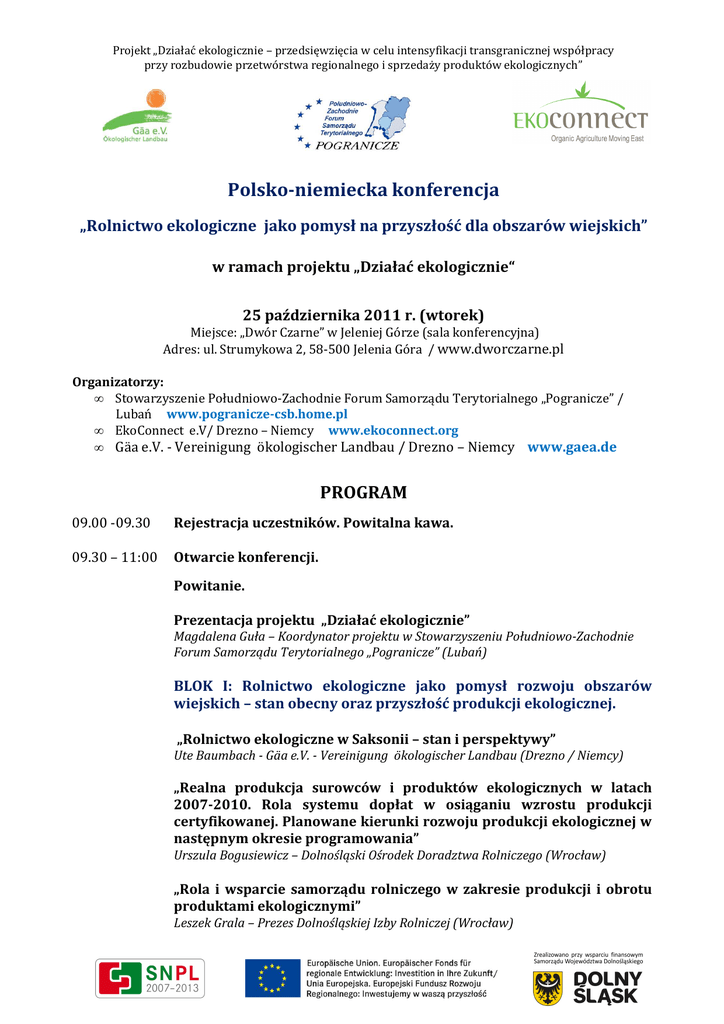 Projekt „Działać ekologicznie – przedsięwzięcia w celu intensyfikacji transgranicznej współpracy przy rozbudowie przetwórstwa regionalnego i sprzedaży produktów ekologicznych” Polsko-niemiecka konferencja „Rolnictwo ekologiczne jako pomysł na przyszłość dla obszarów wiejskich” w ramach projektu „Działać ekologicznie“ 25 października 2011 r. (wtorek) Miejsce: „Dwór Czarne” w Jeleniej Górze (sala konferencyjna) Adres: ul. Strumykowa 2, 58-500 Jelenia Góra / www.dworczarne.pl Organizatorzy: • Stowarzyszenie Południowo-Zachodnie Forum Samorządu Terytorialnego „Pogranicze” / Lubań www.pogranicze-csb.home.pl • EkoConnect e.V/ Drezno – Niemcy www.ekoconnect.org • Gäa e.V. - Vereinigung ökologischer Landbau / Drezno – Niemcy www.gaea.de PROGRAM 09.00 -09.30 Rejestracja uczestników. Powitalna kawa. 09.30 – 11:00 Otwarcie konferencji. Powitanie. Prezentacja projektu „Działać ekologicznie” Magdalena Guła – Koordynator projektu w Stowarzyszeniu Południowo-Zachodnie Forum Samorządu Terytorialnego „Pogranicze” (Lubań) BLOK I: Rolnictwo ekologiczne jako pomysł rozwoju obszarów wiejskich – stan obecny oraz przyszłość produkcji ekologicznej. „Rolnictwo ekologiczne w Saksonii – stan i perspektywy” Ute Baumbach - Gäa e.V. - Vereinigung ökologischer Landbau (Drezno / Niemcy) „Realna produkcja surowców i produktów ekologicznych w latach 2007-2010. Rola systemu dopłat w osiąganiu wzrostu produkcji certyfikowanej. Planowane kierunki rozwoju produkcji ekologicznej w następnym okresie programowania” Urszula Bogusiewicz – Dolnośląski Ośrodek Doradztwa Rolniczego (Wrocław) „Rola i wsparcie samorządu rolniczego w zakresie produkcji i obrotu produktami ekologicznymi” Leszek Grala – Prezes Dolnośląskiej Izby Rolniczej (Wrocław) Projekt „Działać ekologicznie – przedsięwzięcia w celu intensyfikacji transgranicznej współpracy przy rozbudowie przetwórstwa regionalnego i sprzedaży produktów ekologicznych” „Rolnictwo ekologiczne jako pomysł rozwoju obszarów wiejskich – wspierające działania ngo” – Prezentacja Fundacji Kultury Ekologicznej Jacek Jakubiec – Prezes Fundacji Kultury Ekologicznej („Dwór Czarne” / Jelenia Góra) 11:00-11:15 Przerwa kawowa. 11:15-12:45 Blok II: Rolnictwo ekologiczne jako pomysł rozwoju obszarów wiejskich – potrzeby a efekty działań rolników i przedsiębiorców. Wystąpienie: Chris Schmitz – rolnik ekologiczny (Mirsk) Wystąpienie: Marek Ziobrowski – rolnik ekologiczny (Stara Kamienica) Wystąpienie: rolnik ekologiczny z Saksonii „Rolnictwo ekologiczne a rozwój obszarów wiejskich – szanse i zagrożenia” dr Roman Andrzej Śniady – Uniwersytet Przyrodniczy (Wrocław) 12:45-13:30 Przerwa na obiad. 13:30-15:00 Blok III: Rolnictwo ekologiczne jako pomysł rozwoju obszarów wiejskich – handel i gastronomia. „Organizacja dystrybucji produktów ekologicznych, zasady współpracy z producentami oraz możliwości wprowadzenia produktu do sieci dystrybucji” Przedstawiciel Hurtowego Rynku Rolno-Spożywczego TARGPIAST (Wrocław) – zapytanie „Produkty rolnictwa ekologicznego w handlu – obecne kanały dystrybucji i sprzedaży” Maria Centkiewicz – Dolnośląskie Stowarzyszenie Produktu Regionalnego i Lokalnego (Wrocław) „Gastronomia – możliwości sprzedaży produktów ekologicznych w regionie” Przedstawiciel „Niebieski Burak” – zapytanie „Świadomy handel, świadoma konsumpcja – ideą sklepów z produktami ekologicznymi” Tomasz Kulik – Sklep „Irena” (Wrocław) 15:00 – 15:15 Przerwa kawowa. 15:15 – 16:45 Dyskusja „Działać ekologicznie – ale w jaki sposób?” Podsumowanie konferencji. Zakończenie. Projekt „Działać ekologicznie – przedsięwzięcia w celu intensyfikacji transgranicznej współpracy przy rozbudowie przetwórstwa regionalnego i sprzedaży produktów ekologicznych” Informacje organizacyjne: 1. Udział w konferencji jest bezpłatny. 2. Uczestnicy w zgłoszeniu udziału mogą określić obszary swoich działań / zainteresowań oraz pytania. 3. Zapraszamy Państwa do przywiezienia ze sobą wytwarzanych przez siebie ekologicznych produktów żywnościowych oraz materiałów promocyjnych i informacyjnych w celu ich prezentacji dla innych uczestników spotkania. Podczas konferencji udostępnione zostaną nieodpłatnie stoły na prezentacje. Zgłoszenia: Zgłoszenia można nadsyłać do Stowarzyszenia Południowo-Zachodnie Forum Samorządu Terytorialnego „Pogranicze” do 23 października 2011 przy wykorzystaniu załączonego formularza na adres e-mail: [email protected] lub faksem na numer +48 75 721 50 77. Dodatkowych informacji dla uczestników z Dolnego Śląska udziela: Magdalena Guła Stowarzyszenie Południowo-Zachodnie Forum Samorządu Terytorialnego „Pogranicze” ul. Armii Krajowej 30, 59-800 Lubań Tel. / faks +48 75 721 50 77 e-mail: [email protected] www.pogranicze-csb.home.pl