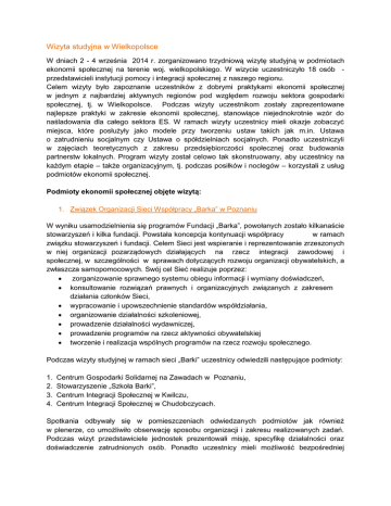 Wizyta studyjna w Wielkopolsce W dniach 2 - 4 września 2014 r. zorganizowano trzydniową wizytę studyjną w podmiotach ekonomii społecznej na terenie woj. wielkopolskiego. W wizycie uczestniczyło 18 osób przedstawicieli instytucji pomocy i integracji społecznej z naszego regionu. Celem wizyty było zapoznanie uczestników z dobrymi praktykami ekonomii społecznej w jednym z najbardziej aktywnych regionów pod względem rozwoju sektora gospodarki społecznej, tj. w Wielkopolsce. Podczas wizyty uczestnikom zostały zaprezentowane najlepsze praktyki w zakresie ekonomii społecznej, stanowiące niejednokrotnie wzór do naśladowania dla całego sektora ES. W ramach wizyty uczestnicy mieli okazje zobaczyć miejsca, które posłużyły jako modele przy tworzeniu ustaw takich jak m.in. Ustawa o zatrudnieniu socjalnym czy Ustawa o spółdzielniach socjalnych. Ponadto uczestniczyli w zajęciach teoretycznych z zakresu przedsiębiorczości społecznej oraz budowania partnerstw lokalnych. Program wizyty został celowo tak skonstruowany, aby uczestnicy na każdym etapie – także organizacyjnym, tj. podczas posiłków i noclegów – korzystali z usług podmiotów ekonomii społecznej. Podmioty ekonomii społecznej objęte wizytą: 1. Związek Organizacji Sieci Współpracy „Barka” w Poznaniu W wyniku usamodzielnienia się programów Fundacji „Barka”, powołanych zostało kilkanaście stowarzyszeń i kilka fundacji. Powstała koncepcja kontynuacji współpracy w ramach związku stowarzyszeń i fundacji. Celem Sieci jest wspieranie i reprezentowanie zrzeszonych w niej organizacji pozarządowych działających na rzecz integracji zawodowej i społecznej, w szczególności w sprawach dotyczących rozwoju organizacji obywatelskich, a zwłaszcza samopomocowych. Swój cel Sieć realizuje poprzez: zorganizowanie sprawnego systemu obiegu informacji i wymiany doświadczeń, konsultowanie rozwiązań prawnych i organizacyjnych związanych z zakresem działania członków Sieci, wypracowanie i upowszechnienie standardów współdziałania, organizowanie działalności szkoleniowej, prowadzenie działalności wydawniczej, prowadzenie programów na rzecz aktywności obywatelskiej tworzenie i realizacja wspólnych programów na rzecz rozwoju społecznego. Podczas wizyty studyjnej w ramach sieci „Barki” uczestnicy odwiedzili następujące podmioty: 1. 2. 3. 4. Centrum Gospodarki Solidarnej na Zawadach w Poznaniu, Stowarzyszenie „Szkoła Barki”, Centrum Integracji Społecznej w Kwilczu, Centrum Integracji Społecznej w Chudobczycach. Spotkania odbywały się w pomieszczeniach odwiedzanych podmiotów jak również w plenerze, co umożliwiło obserwację sposobu organizacji i zakresu realizowanych zadań. Podczas wizyt przedstawiciele jednostek prezentowali misję, specyfikę działalności oraz doświadczenie zatrudnionych osób. Ponadto uczestnicy mieli możliwość bezpośredniej rozmowy z osobami, które pokonały uzależnienie i dzięki pomocy Fundacji „Barka” rozpoczęły nowe życie. Uczestnicy wizyty studyjnej. 2. Centrum Integracji Społecznej w Gębiczynie Fundacja „Gębiczyn” założona została w celu objęcia dzieci wiejskich wczesnym rozpoznaniem porażenia mózgowego i ich rehabilitacją. Fundatorzy - założyciele przekazali na ten cel działkę budowlaną o pow. 1,12 ha oraz dwa autorskie projekty budowlane ośrodka rehabilitacji i stajni wraz z aktualnym pozwoleniem na budowę. Utworzony w 1997 r. Wyjazdowy Zespół Wczesnej Interwencji pod kierunkiem dr n. med. Anny Kałamoniak z Piły (w jego skład oprócz lekarza wchodzili także psycholog kliniczny, rehabilitant i pedagog specjalny), przeprowadził rozpoznanie i udokumentował różny stopień upośledzenia u ponad 30 dzieci, które nigdy dotąd nie zostały objęte rehabilitacją, głównie z powodu głębokiego ubóstwa i patologii społecznej. W latach 1997-2011 zrealizowano kilkadziesiąt projektów edukacyjno-kulturalnych mieszczących się w założeniach autorskiego programu „Dobry Dom”. W projektach uczestniczyło rocznie od 1500-2000 dzieci i młodzieży - bezpośrednich beneficjentów oraz pośrednio rodziców, nauczycieli, osób zwiedzających, uczestników imprez edukacyjnointegracyjnych. W latach 2010-2011 reintegracją społeczną objęto 40 uczestników powstałego Centrum Integracji Społecznej, mieszkańcom Gminy Czarnków i Miasta Czarnkowa. Misją CIS w Gębiczynie jest dzielenie się wiedzą poprzez realizowanie projektów edukacyjno-kulturalnych, wspierających rozwój intelektualny i emocjonalny dzieci i młodzieży, a także dorosłych mieszkańców wsi, w tym osób zagrożonych wykluczeniem społecznym, mieszkających na wsi. Uczestnicy wizyty studyjnej. Uczestnicy wizyty studyjnej. Uczestnicy wizyty studyjnej. 3. Spółdzielnia socjalna BIS- KAM WESOŁE SKRZATY W TRZCIANCE Spółdzielnia socjalna BIS – KAM WESOŁE SKRZATY w Trzciance prowadzi Klub Malucha, zajmuje się opieką nad dziećmi w ramach, której prowadzi: - zajęcia muzyczne, - zajęcia plastyczno – techniczne, - zajęcia artystyczno – teatralne, - spotkania z przedstawicielami różnych zawodów. Oprócz opieki nad dziećmi do lat 3 prowadzony jest punkt przedszkolny „Wesołe Skrzaty” oraz organizowane są usługi związane z organizacją wydarzeń skierowanych do dzieci (np. organizacja przyjęć urodzinowych). W ofercie Spółdzielni jest także całonocna opieka nad dziećmi. Uczestnicy wizyty studyjnej.