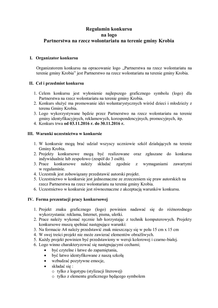 Regulamin konkursu na logo Partnerstwa na rzecz wolontariatu na terenie gminy Krobia I. Organizator konkursu Organizatorem konkursu na opracowanie logo „Partnerstwa na rzecz wolontariatu na terenie gminy Krobia” jest Partnerstwo na rzecz wolontariatu na terenie gminy Krobia. II. Cel i przedmiot konkursu 1. Celem konkursu jest wyłonienie najlepszego graficznego symbolu (logo) dla Partnerstwa na rzecz wolontariatu na terenie gminy Krobia. 2. Konkurs służyć ma promowanie idei woluntarystycznych wśród dzieci i młodzieży z terenu Gminy Krobia. 3. Logo wykorzystywane będzie przez Partnerstwo na rzecz wolontariatu na terenie gminy identyfikacyjnych, reklamowych, korespondencyjnych, promocyjnych, itp. 4. Konkurs trwa od 03.11.2016 r. do 30.11.2016 r. III. Warunki uczestnictwa w konkursie 1. W konkursie mogą brać udział wszyscy uczniowie szkół działających na terenie Gminy Krobia. 2. Projekty konkursowe mogą być realizowane oraz zgłaszane do konkursu indywidualnie lub zespołowo (zespół do 3 osób). 3. Prace konkursowe należy składać zgodnie z wymaganiami zawartymi w regulaminie. 4. Uczestnik jest zobowiązany przedstawić autorski projekt. 5. Uczestnictwo w konkursie jest jednoznaczne ze zrzeczeniem się praw autorskich na rzecz Partnerstwa na rzecz wolontariatu na terenie gminy Krobia. 6. Uczestnictwo w konkursie jest równoznaczne z akceptacją warunków konkursu. IV. Forma prezentacji pracy konkursowej 1. Projekt znaku graficznego (logo) powinien nadawać się do różnorodnego wykorzystania: reklama, Internet, pisma, ulotki. 2. Prace należy wykonać ręcznie lub korzystając z technik komputerowych. Projekty konkursowe muszą spełniać następujące warunki: 3. Na formacie A4 należy przedstawić znak mieszczący się w polu 15 cm x 15 cm 4. W swej treści projekt nie może zawierać elementów obraźliwych. 5. Każdy projekt powinien być przedstawiony w wersji kolorowej i czarno-białej. 6. Logo winno charakteryzować się następującymi cechami; być czytelne i łatwe do zapamiętania, być łatwo identyfikowane z naszą szkołą wzbudzać pozytywne emocje, składać się : o tylko z logotypu (stylizacji literowej) o tylko z elementu graficznego będącego symbolem o lub też zawierać połączenie obu tych elementów. 7. Logo nie powinno być skomplikowane pod względem graficznym i kolorystycznym. 8. Prace należy składać w estetycznej formie, w kopercie opatrzonej hasłem („Konkurs na logo Partnerstwa”), w której uczestnik podaje: imię i nazwisko, szkołę i klasę, płytę z nagraną pracą jeżeli jest ona wykonana techniką komputerową w oryginalnym formacie oraz skompresowany do formatu JPG wraz z nazwą programu, w którym projekt został wykonany. V. Miejsce i termin składania prac konkursowych 1. Prace należy składać do dnia 30.11.2016 r. w Miejsko-Gminnym Ośrodku Pomocy Społecznej, ul. Powstańców Wielkopolskich 126, 63-840 Krobia. 2. Prace konkursowe, nie spełniające wymagań, o których mowa w regulaminie konkursu, nie będą podlegały ocenie Komisji Konkursowej. 3. Prace dostarczone po terminie nie będą oceniane. 4. Organizator nie zwraca prac. VI. Kryteria oceny prac konkursowych Projekty oceniane będą zgodnie z następującymi kryteriami: zgodność projektu z ideami wolontariatu, oryginalność znaku, łatwość zapamiętywania, czytelność i funkcjonalność projektu, estetyka wykonania projektu. VII. Ocena prac konkursowych Zwycięskie prace zostaną wybrane przez Komisję Konkursową, w składzie: Michał Listwoń Adam Sarbinowski Agnieszka Wujek Anna Krzyżostaniak Barbara Gryczka VIII. Rozstrzygnięcie konkursu 1. W wyniku postępowania konkursowego Komisja Konkursowa wyłania zwycięzcę konkursu. 2. Dla zwycięzców przewidziane są nagrody 3. Planowana data ogłoszenia wyników: 8.12.2016r., podczas Gminnych Obchodów Dnia Wolontariusza.