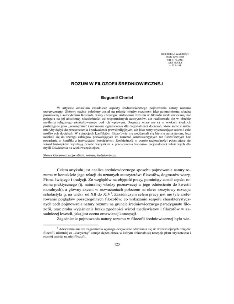 KULTURA I WARTOŚCI ISSN 2299-7806 NR 3 (7) /2013 ARTYKUŁY s. 125–141 ROZUM W FILOZOFII ŚREDNIOWIECZNEJ Bogumił Chmiel W artykule omawiam zasadnicze aspekty średniowiecznego pojmowania natury rozumu teoretycznego. Główny nacisk położony został na relację między rozumem jako autonomiczną władzą poznawczą a autorytetami Kościoła, wiary i teologii. Autonomia rozumu w filozofii średniowiecznej nie polegała na jej absolutnej niezależności od wspomnianych autorytetów, ale realizowała się w obrębie myślenia religijnego ukształtowanego pod ich wpływem. Dogmaty wiary nie są w wiekach średnich postrzegane jako ,,zewnętrzne” i narzucone ograniczenia dla racjonalności dociekań, które same z siebie miałyby dążyć do przekroczenia i podważenia prawd religijnych, ale jako ramy wyznaczające zakres i cele możliwych dociekań. W sytuacjach konfliktów filozofowie nie poddawali się biernie autorytetom, lecz uciekali się do szeregu zabiegów pozwalających im nauczać kontrowersyjnych tez filozoficznych bez popadania w konflikt z instytucjami kościelnymi. Rozbieżność w ocenie racjonalności pojawiające się wśród historyków wynikają przede wszystkim z przenoszenia kanonów racjonalności właściwych dla myśli Oświecenia na wieki wcześniejsze. Słowa kluczowe: racjonalizm, rozum, średniowiecze Celem artykułu jest analiza średniowiecznego sposobu pojmowania natury rozumu w kontekście jego relacji do uznanych autorytetów: filozofów, dogmatów wiary, Pisma świętego i tradycji. Ze względów na objętość pracy, pominięty został aspekt rozumu praktycznego (tj. naturalnej władzy poznawczej w jego odniesieniu do kwestii moralnych), a główny akcent w rozważaniach położono na okres szczytowy rozwoju scholastyki tj. na wieki od XII do XIV1. Zasadniczym celem pracy jest nie tyle zreferowanie poglądów poszczególnych filozofów, co wskazanie zespołu charakterystycznych cech pojmowania natury rozumu na gruncie średniowiecznego paradygmatu filozofii, oraz próba wyjaśnienia braku zgodności wśród mediewistów i filozofów w zasadniczej kwestii, jaką jest ocena omawianej koncepcji. Zagadnienie pojmowania natury rozumu w filozofii średniowiecznej było wie1 Adekwatna analiza zagadnienia wymaga oczywiście odwołania się do wcześniejszych dziejów filozofii, niemniej za ,,klasyczny” uznaje się ten okres, w którym dokonała się recepcja pism Arystotelesa i rozwój opartej na niej filozofii. 125 B. CHMIEL – ROZUM W FILOZOFII ŚREDNIOWIECZNEJ lokrotnie podejmowane przez historyków filozofii, a ogromna praca, jaką w XX wieku wykonali tacy mediewiści, jak M. D. Chenu, E. Gilson czy J. P. Torrell, wpłynęła na zmianę w postrzeganiu i ocenie myśli średniowiecznej2. Dzięki renesansowi badań nad historią filozofii średniowiecznej powoli zanika, sięgające korzeniami odrodzenia i oświecenia, pojmowanie średniowiecza jako ,,wieków ciemnych”, w których mętna i epigońska filozofia miała jakoby służyć wyłącznie jako narzędzie teologii3. Mimo tak zasadniczych zmian, pod adresem myśli średniowiecznej nadal wysuwane są zastrzeżenia kwestionujące jej filozoficzny charakter. Najważniejsze z nich dotyczą problemu autonomii poznawczej podmiotu i związanej z nią wolności dociekań filozoficznych. W oparciu o ogromną liczbę opracowań, w których omawiana kwestia jest analizowana na różnych płaszczyznach, można wskazać dwie zasadnicze perspektywy rozpatrywania problemu natury ludzkiego poznania. Po pierwsze, kwestię pojmowania rozumu w filozofii średniowiecznej można naświetlać z punktu widzenia epistemologii. W takim kontekście głównym przedmiotem zainteresowań staje się sama istota rozumu, zasady jego funkcjonowanie, relacje do zmysłów, woli i sfery emocjonalnej. Po drugie, średniowieczne rozumienie przyrodzonych władz poznawczych człowieka (w tym rozumu) można rozważać na gruncie metodologii nauk. W takiej perspektywie, na czoło wysunie się kwestia relacji jaka, zdaniem filozofów średniowiecznych, powinna zachodzić pomiędzy rozumem a wiarą oraz opartymi na tym fundamencie relacjami pomiędzy filozofią a teologią, poznaniem naturalnym a autorytetem Pisma Świętego, tradycji i Kościoła. Oczywiście, obydwie perspektywy nie są od siebie niezależne, zaś kwestią, która niejako ogniskuje w sobie oba punkty widzenia, jest problem możliwości poznawczych podmiotu. Jeżeli rozum, wobec takich kwestii, jak istnienie i natura Boga, dusza ludzka, problemy kosmologiczne i etyczne, jest bezsilny, to automatycznie wzrasta rola wiary, Objawienia i jego interpretacji, tj. teologii. Z drugiej strony, jeżeli uzna się autonomię rozumu wynikającą z jego możliwości poznawczych, problematyczna 2 Na uwagę zasługują także studia nad średniowiecznymi źródłami nauki nowożytnej (A. Koyré, E. Grant), które stanowią dopełnienie badań prowadzonych przez historyków filozofii. 3 Wśród współczesnych autorów trudno byłoby znaleźć wypowiedź podobną do opinii K. Twardowskiego, który na początku XX wieku pisał o filozofii średniowiecznej następująco: ,,Czy można tu w ogóle mówić o rozwoju myśli ludzkiej? Czy wieki średnie wniosły w skarbiec ducha ludzkiego jakieś nowe, trwałe zdobycze, czy wzbogaciły ludzkość treścią nową, zasługującą na dalsze pielęgnowanie i staranne przechowywanie? Na tak postawione pytanie odpowiedź musi stanowczo wypaść przecząco”. K. Twardowski, O filozofii średniowiecznej wykładów sześć, nakład H. Altenberga, Lwów 1910, s. 104. 126 B. CHMIEL – ROZUM W FILOZOFII ŚREDNIOWIECZNEJ staje się rola autorytetu Pisma Świętego i tradycji4. Niemniej odróżnienie tych poziomów analizy jest zasadne przynajmniej z jednego powodu. O ile bowiem historycy filozofii podzielają zasadnicze poglądy na problemy epistemologiczne obecne w poszczególnych nurtach filozofii średniowiecznej, o tyle zasadniczo różnią się w kwesti