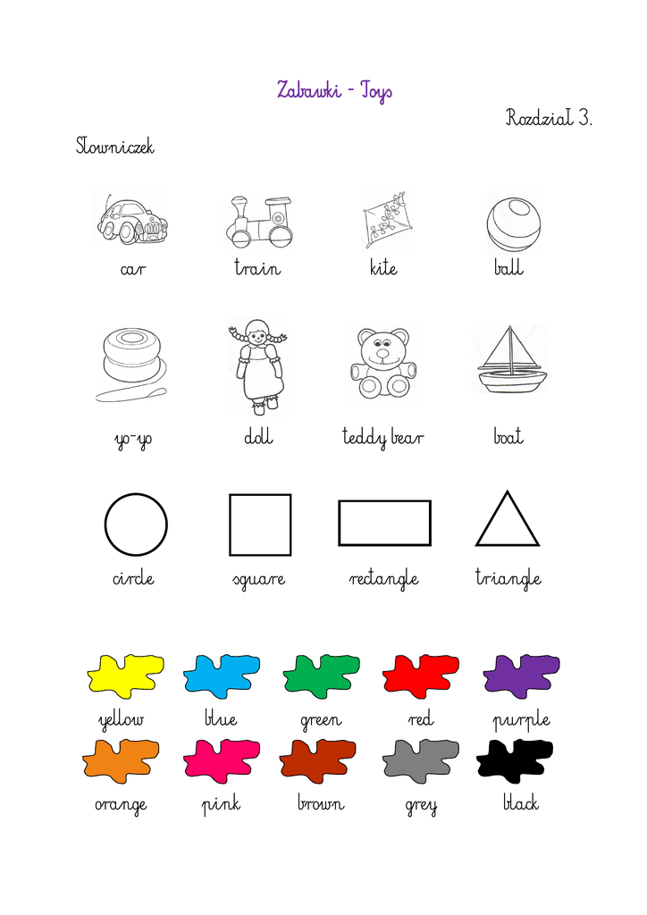 Zabawki - Toys Rozdział 3. Słowniczek car train kite ball yo-yo doll teddy bear boat circle square rectangle triangle yellow blue green red purple orange pink brown grey black Napisz po śladzie. doll doll doll doll doll doll car car car car car car car ball ball ball ball ball ball teddy bear teddy bear teddy bear yo-yo yo-yo yo-yo yo-yo yo-yo kite kite kite kite kite kite kite boat boat boat boat boat boat train train train train Dorysuj brakujący fragment. car teddy bear train boat Pokoloruj figury geometryczne. blue circle green triangle red square yellow rectangle