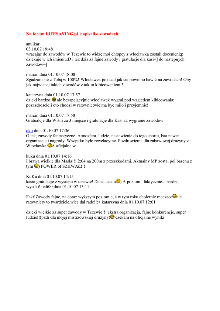 Na forum LIFESAVING.pl napisali o zawodach : anulkar 03.10.07 19:48 wracając do zawodów w Tczewie to widzę moi chłopcy z włocławka zostali docenieni;p dziekuje w ich imieniu;D i teŜ dzia za fajne zawody i gratulacje dla kasi=] do następnych zawodów=] marcin dnia 01.10.07 18:00 Zgadzam sie z Tobą w 100%!!Włocławek pokazał jak sie powinno bawić na zawodach! Oby jak najwiecej takich zawodów z takim kibicowaniem!! katarzyna dnia 01.10.07 17:57 dzieki bardzo! ale bezapelacyjnie wloclawek wygral pod wzgledem kibicowania; pozazdroscic!i oto chodzi w ratownictwie ma byc milo i przyjemnie! marcin dnia 01.10.07 17:50 Gratualcje dla Wiśni za 3 miejsce i gratulacje dla Kasi za wygranie zawodów oko dnia 01.10.07 17:36 O tak, zawody fantastyczne. Atmosfera, ludzie, nastawienie do tego sportu, baa nawet organizacja i nagrody. Wszystko było rewelacyjne. Pozdrowienia dla zabawowej druŜyny z Włocławka A oficjalne w kuku dnia 01.10.07 14:16 I brawa wielkie dla Masła!!! 2:04 na 200m z przeszkodami. Aktualny MP zostal pol basenu z tylu ) POWER of SZKWAŁ!!! KuKu dnia 01.10.07 14:15 kasia gratulacje z wystepu w tczewie! Dalas czadu ) A poziom.. faktycznie... bardzo wysoki! tedi00 dnia 01.10.07 13:11 Fakt!Zawody fajne, na coraz wyŜszym poziomie, a w tym roku cholernie meczace ale ratownicty to twardziele,więc dal rade!!:> katarzyna dnia 01.10.07 12:01 dzieki wielkie za super zawody w Tczewie!!! ekstra organizacja, fajne konkurencje, super ludzie!!!pzdr dla mojej mistrzowskiej druzyny! czekam na oficjalne wyniki!