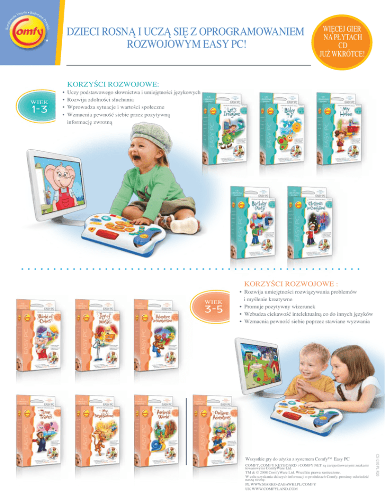 to w a DZIECI ROSNĄ I UCZĄ SIĘ Z OPROGRAMOWANIEM ROZWOJOWYM EASY PC! o ewn ści Kszta ł słu Budow Um y ani eP nie WIEK 1-3 • • • • WIĘCEJ GIER NA PŁYTACH CD JUŻ WKRÓTCE! KORZYŚCI ROZWOJOWE: Uczy podstawowego słownictwa i umiejętności językowych Rozwija zdolności słuchania Wprowadza sytuacje i wartości społeczne Wzmacnia pewność siebie przez pozytywną informację zwrotną KORZYŚCI ROZWOJOWE : WIEK 3-5 • Rozwija umiejętności rozwiązywania problemów i myślenie kreatywne • Promuje pozytywny wizerunek • Wzbudza ciekawość intelektualną co do innych języków • Wzmacnia pewność siebie poprzez stawiane wyzwania C51210 PL R20 Wszystkie gry do użytku z systemem Comfy™ Easy PC COMFY, COMFY KEYBOARD i COMFY NET są zarejestrowanymi znakami towarowymi ComfyWare Ltd. TM & © 2008 ComfyWare Ltd. Wszelkie prawa zastrzeżone. W celu uzyskania dalszych informacji o produktach Comfy, prosimy odwiedzić naszą stronę: PL WWW.MARKO-ZABAWKI.PL/COMFY UK WWW.COMFYLAND.COM