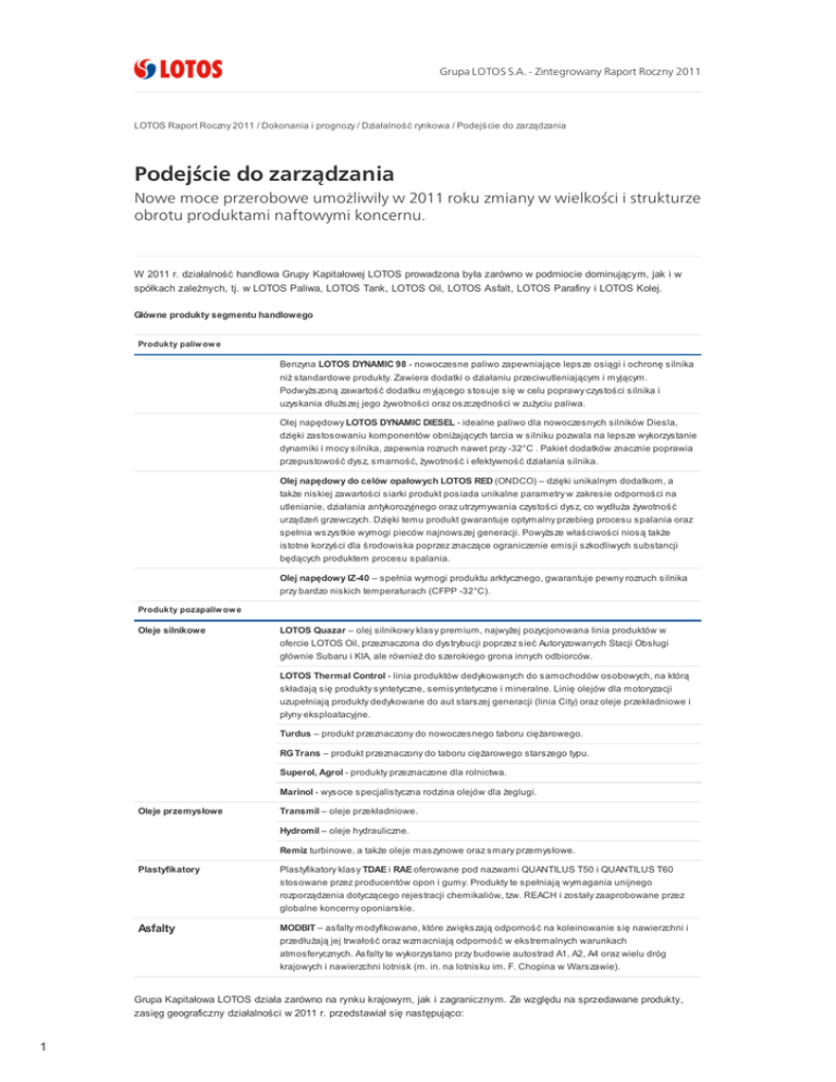 Grupa LOTOS S.A. - Zintegrowany Raport Roczny 2011 LOTOS Raport Roczny 2011 / Dokonania i prognozy / Działalność rynkowa / Podejście do zarządzania Podejście do zarządzania Nowe moce przerobowe umożliwiły w 2011 roku zmiany w wielkości i strukturze obrotu produktami naftowymi koncernu. W 2011 r. działalność handlowa Grupy Kapitałowej LOTOS prowadzona była zarówno w podmiocie dominującym, jak i w spółkach zależnych, tj. w LOTOS Paliwa, LOTOS Tank, LOTOS Oil, LOTOS Asfalt, LOTOS Parafiny i LOTOS Kolej. Główne produkty segmentu handlowego Produkty paliw ow e Benzyna LOTOS DYNAMIC 98 - nowoczesne paliwo zapewniające lepsze osiągi i ochronę silnika niż standardowe produkty. Zawiera dodatki o działaniu przeciwutleniającym i myjącym. Podwyższoną zawartość dodatku myjącego stosuje się w celu poprawy czystości silnika i uzyskania dłuższej jego żywotności oraz oszczędności w zużyciu paliwa. Olej napędowy LOTOS DYNAMIC DIESEL - idealne paliwo dla nowoczesnych silników Diesla, dzięki zastosowaniu komponentów obniżających tarcia w silniku pozwala na lepsze wykorzystanie dynamiki i mocy silnika, zapewnia rozruch nawet przy -32°C . Pakiet dodatków znacznie poprawia przepustowość dysz, smarność, żywotność i efektywność działania silnika. Olej napędowy do celów opałowych LOTOS RED (ONDCO) – dzięki unikalnym dodatkom, a także niskiej zawartości siarki produkt posiada unikalne parametry w zakresie odporności na utlenianie, działania antykorozyjnego oraz utrzymywania czystości dysz, co wydłuża żywotność urządzeń grzewczych. Dzięki temu produkt gwarantuje optymalny przebieg procesu spalania oraz spełnia wszystkie wymogi pieców najnowszej generacji. Powyższe właściwości niosą także istotne korzyści dla środowiska poprzez znaczące ograniczenie emisji szkodliwych substancji będących produktem procesu spalania. Olej napędowy IZ-40 – spełnia wymogi produktu arktycznego, gwarantuje pewny rozruch silnika przy bardzo niskich temperaturach (CFPP -32°C). Produkty pozapaliw ow e Oleje silnikowe LOTOS Quazar – olej silnikowy klasy premium, najwyżej pozycjonowana linia produktów w ofercie LOTOS Oil, przeznaczona do dystrybucji poprzez sieć Autoryzowanych Stacji Obsługi głównie Subaru i KIA, ale również do szerokiego grona innych odbiorców. LOTOS Thermal Control - linia produktów dedykowanych do samochodów osobowych, na którą składają się produkty syntetyczne, semisyntetyczne i mineralne. Linię olejów dla motoryzacji uzupełniają produkty dedykowane do aut starszej generacji (linia City) oraz oleje przekładniowe i płyny eksploatacyjne. Turdus – produkt przeznaczony do nowoczesnego taboru ciężarowego. RG Trans – produkt przeznaczony do taboru ciężarowego starszego typu. Superol, Agrol - produkty przeznaczone dla rolnictwa. Marinol - wysoce specjalistyczna rodzina olejów dla żeglugi. Oleje przemysłowe Transmil – oleje przekładniowe. Hydromil – oleje hydrauliczne. Remiz turbinowe, a także oleje maszynowe oraz smary przemysłowe. Plastyfikatory Plastyfikatory klasy TDAE i RAE oferowane pod nazwami QUANTILUS T50 i QUANTILUS T60 stosowane przez producentów opon i gumy. Produkty te spełniają wymagania unijnego rozporządzenia dotyczącego rejestracji chemikaliów, tzw. REACH i zostały zaaprobowane przez globalne koncerny oponiarskie. Asfalty MODBIT – asfalty modyfikowane, które zwiększają odporność na koleinowanie się nawierzchni i przedłużają jej trwałość oraz wzmacniają odporność w ekstremalnych warunkach atmosferycznych. Asfalty te wykorzystano przy budowie autostrad A1, A2, A4 oraz wielu dróg krajowych i nawierzchni lotnisk (m. in. na lotnisku im. F. Chopina w Warszawie). Grupa Kapitałowa LOTOS działa zarówno na rynku krajowym, jak i zagranicznym. Ze względu na sprzedawane produkty, zasięg geograficzny działalności w 2011 r. przedstawiał się następująco: 1 Paliwa silnikowe - sprzedaż odbywała się w głównej mierze na terytorium Polski i w największym stopniu koncentrowała się na odbiorcach detalicznych, koncernach międzynarodowych, konsumentach instytucjonalnych, operatorach stacji paliw oraz odbiorcach hurtowych zaopatrujących odbiorców na lokalnych rynkach. Dodatkowo w ramach działalności flotowej LOTOS Biznes prowadzone było pozyskiwanie klientów – głównie firm transportu drogowego, z krajów bałtyckich (Litwa, Łotwa, Estonia) celem realizacji zakupów paliw przez podmioty zagraniczne na stacjach LOTOS. Dodatkowo w krajach tych LOTOS Paliwa działała, jako Agencja Handlowa koncernu ExxonMobil Deutschland, pozyskując klientów na produkt flotowy – karta LOTOS/ESSO. W ramach współpracy dotyczącej honorowania kart paliwowych ukraińskiego emitenta WOG LOTOS Paliwa prowadziła sprzedaż paliw poprzez sieć swoich stacji do przewoźników drogowych z terenu Ukrainy i Rosji. Produkty paliwowe wyprodukowane przez rafinerię Grupy LOTOS w 2011 r. poprzez sprzedaż eksportową trafiały na rynki następujących państw: Wielka Brytania, Szwecja, Holandia, Francja, kraje bałtyckie, Republika Czeska, a nawet Hiszpania. Paliwo lotnicze - spalane w silnikach statków powietrznych zarówno w Polsce, jak i w krajach basenu Morza Bałtyckiego oraz w samolotach korzystających z praskiego portu lotniczego Ruzyne. Handel w kraju odbywał się w ramach dwóch działalności: działalność lotniskowa – sprzedaż w Gdańsku realizowana we współpracy ze Statoil oraz działalność hurtowa – sprzedaż m.in. do Lotniczego Pogotowia Ratunkowego oraz do Petrolotu, który dystrybuował to paliwo w całym kraju. Eksport drogą morską odbywał się poprzez kontrakty terminowe oraz transakcje spot głównie na rynki skandynawskie (Szwecja, Finlandia, Norwegia). Oleje silnikowe i przemysłowe - na rynku krajowym sprzedaż realizowana była w kanale sprzedaży hurtowej Dystrybutorów Regionalnych oraz poprzez sprzedaż własną, która daje możliwo