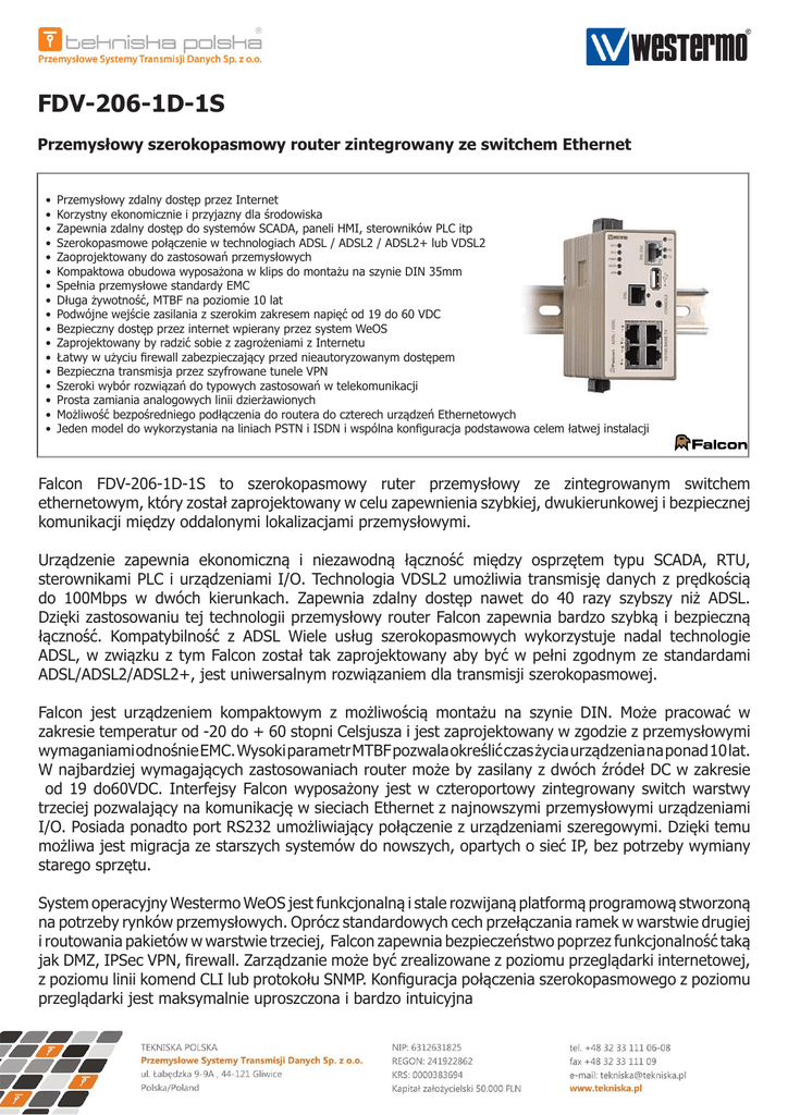 FDV-206-1D-1S Przemysłowy szerokopasmowy router zintegrowany ze switchem Ethernet • • • • • • • • • • • • • • • • • Przemysłowy zdalny dostęp przez Internet Korzystny ekonomicznie i przyjazny dla środowiska Zapewnia zdalny dostęp do systemów SCADA, paneli HMI, sterowników PLC itp Szerokopasmowe połączenie w technologiach ADSL / ADSL2 / ADSL2+ lub VDSL2 Zaoprojektowany do zastosowań przemysłowych Kompaktowa obudowa wyposażona w klips do montażu na szynie DIN 35mm Spełnia przemysłowe standardy EMC Długa żywotność, MTBF na poziomie 10 lat Podwójne wejście zasilania z szerokim zakresem napięć od 19 do 60 VDC Bezpieczny dostęp przez internet wpierany przez system WeOS Zaprojektowany by radzić sobie z zagrożeniami z Internetu Łatwy w użyciu firewall zabezpieczający przed nieautoryzowanym dostępem Bezpieczna transmisja przez szyfrowane tunele VPN Szeroki wybór rozwiązań do typowych zastosowań w telekomunikacji Prosta zamiania analogowych linii dzierżawionych Możliwość bezpośredniego podłączenia do routera do czterech urządzeń Ethernetowych Jeden model do wykorzystania na liniach PSTN i ISDN i wspólna konfiguracja podstawowa celem łatwej instalacji Falcon FDV-206-1D-1S to szerokopasmowy ruter przemysłowy ze zintegrowanym switchem ethernetowym, który został zaprojektowany w celu zapewnienia szybkiej, dwukierunkowej i bezpiecznej komunikacji między oddalonymi lokalizacjami przemysłowymi. Urządzenie zapewnia ekonomiczną i niezawodną łączność między osprzętem typu SCADA, RTU, sterownikami PLC i urządzeniami I/O. Technologia VDSL2 umożliwia transmisję danych z prędkością do 100Mbps w dwóch kierunkach. Zapewnia zdalny dostęp nawet do 40 razy szybszy niż ADSL. Dzięki zastosowaniu tej technologii przemysłowy router Falcon zapewnia bardzo szybką i bezpieczną łączność. Kompatybilność z ADSL Wiele usług szerokopasmowych wykorzystuje nadal technologie ADSL, w związku z tym Falcon został tak zaprojektowany aby być w pełni zgodnym ze standardami ADSL/ADSL2/ADSL2+, jest uniwersalnym rozwiązaniem dla transmisji szerokopasmowej. Falcon jest urządzeniem kompaktowym z możliwością montażu na szynie DIN. Może pracować w zakresie temperatur od -20 do + 60 stopni Celsjusza i jest zaprojektowany w zgodzie z przemysłowymi wymaganiami odnośnie EMC. Wysoki parametr MTBF pozwala określić czas życia urządzenia na ponad 10 lat. W najbardziej wymagających zastosowaniach router może by zasilany z dwóch źródeł DC w zakresie od 19 do60VDC. Interfejsy Falcon wyposażony jest w czteroportowy zintegrowany switch warstwy trzeciej pozwalający na komunikację w sieciach Ethernet z najnowszymi przemysłowymi urządzeniami I/O. Posiada ponadto port RS232 umożliwiający połączenie z urządzeniami szeregowymi. Dzięki temu możliwa jest migracja ze starszych systemów do nowszych, opartych o sieć IP, bez potrzeby wymiany starego sprzętu. System operacyjny Westermo WeOS jest funkcjonalną i stale rozwijaną platformą programową stworzoną na potrzeby rynków przemysłowych. Oprócz standardowych cech przełączania ramek w warstwie drugiej i routowania pakietów w warstwie trzeciej, Falcon zapewnia bezpieczeństwo poprzez funkcjonalność taką jak DMZ, IPSec VPN, firewall. Zarządzanie może być zrealizowane z poziomu przeglądarki internetowej, z poziomu linii komend CLI lub protokołu SNMP. Konfiguracja połączenia szerokopasmowego z poziomu przeglądarki jest maksymalnie uproszczona i bardzo intuicyjna Specyfikacja: FDV-206-1D-1S Specyfikacja: FDV-206-1D-1S